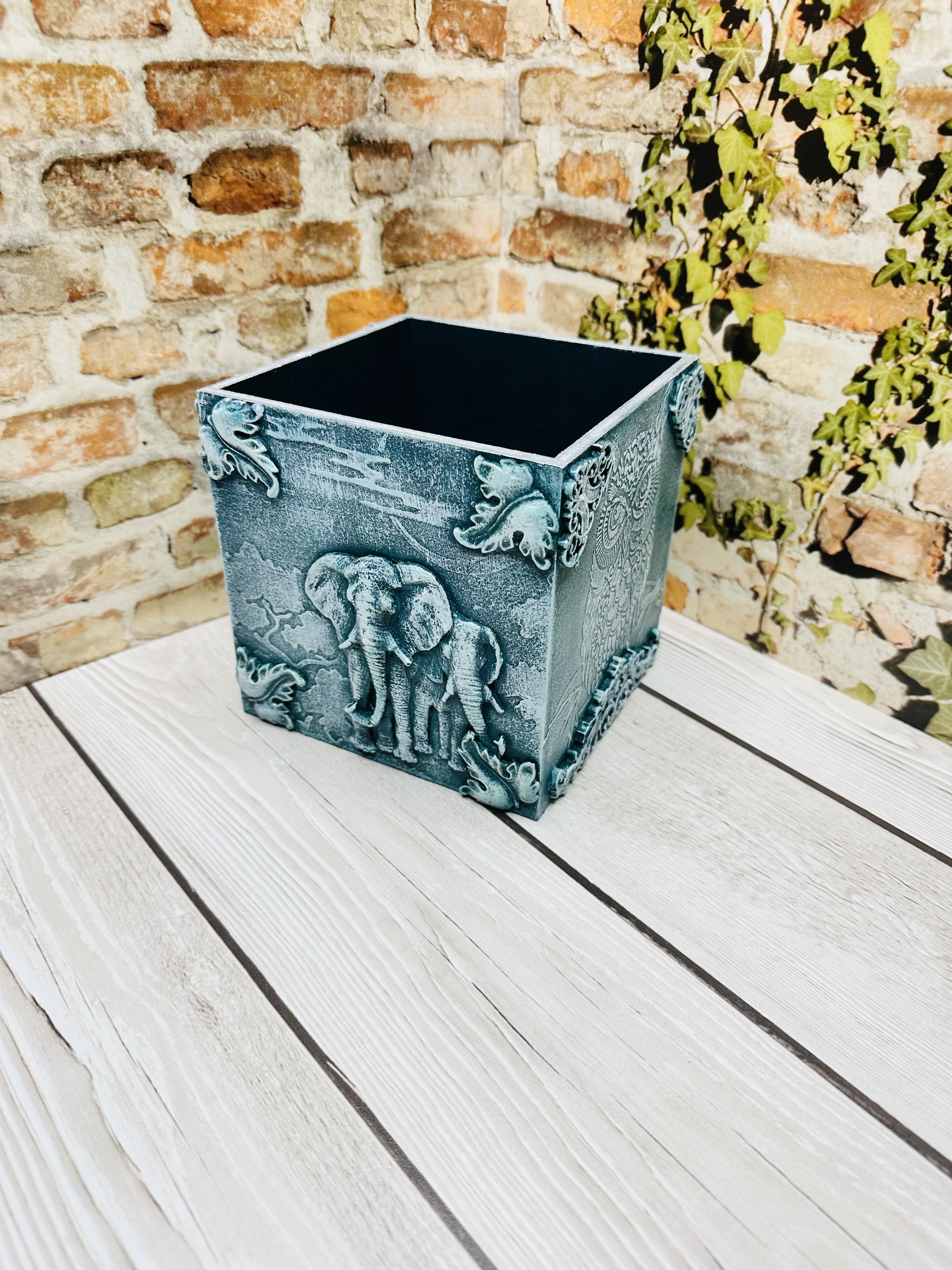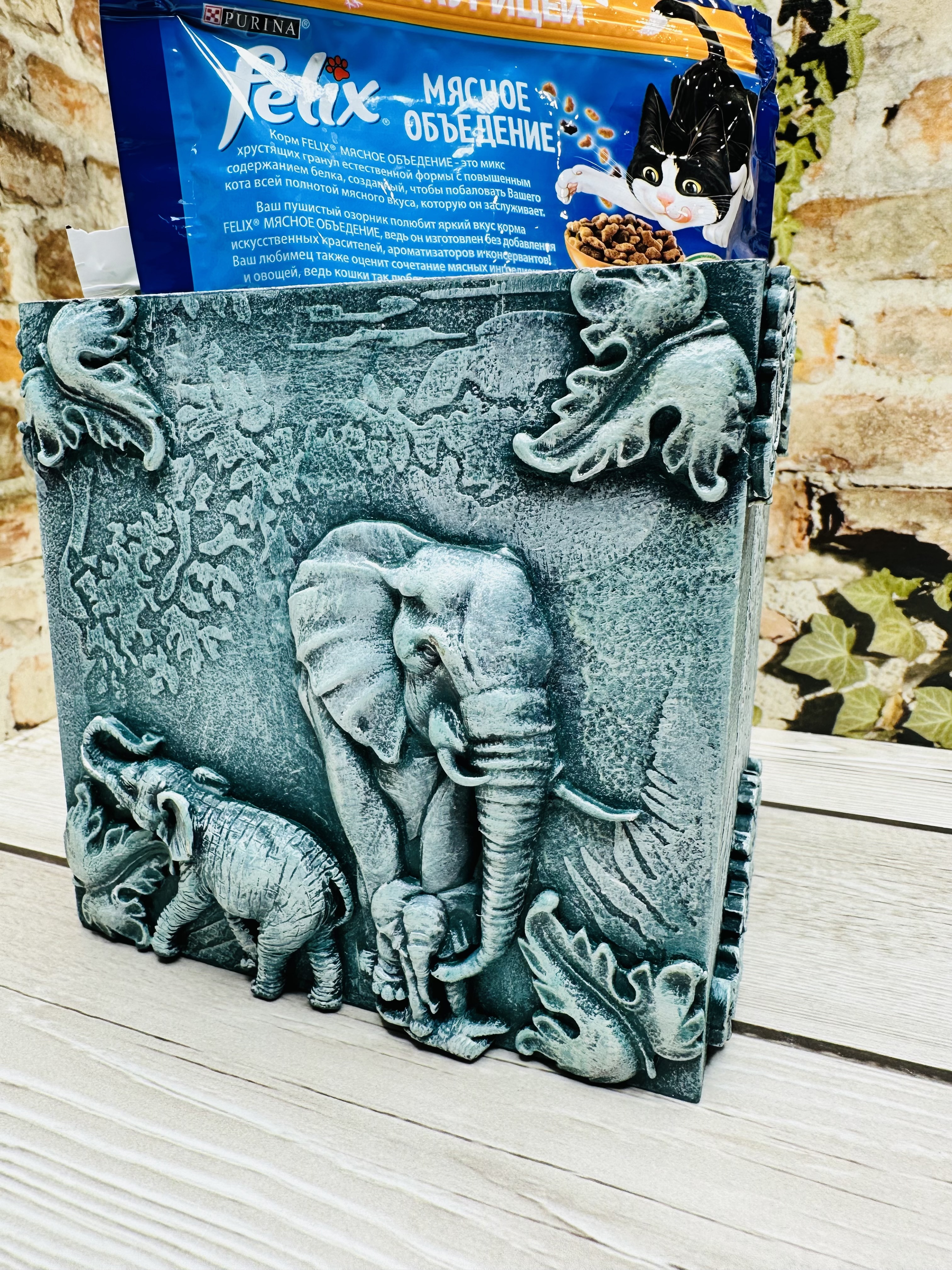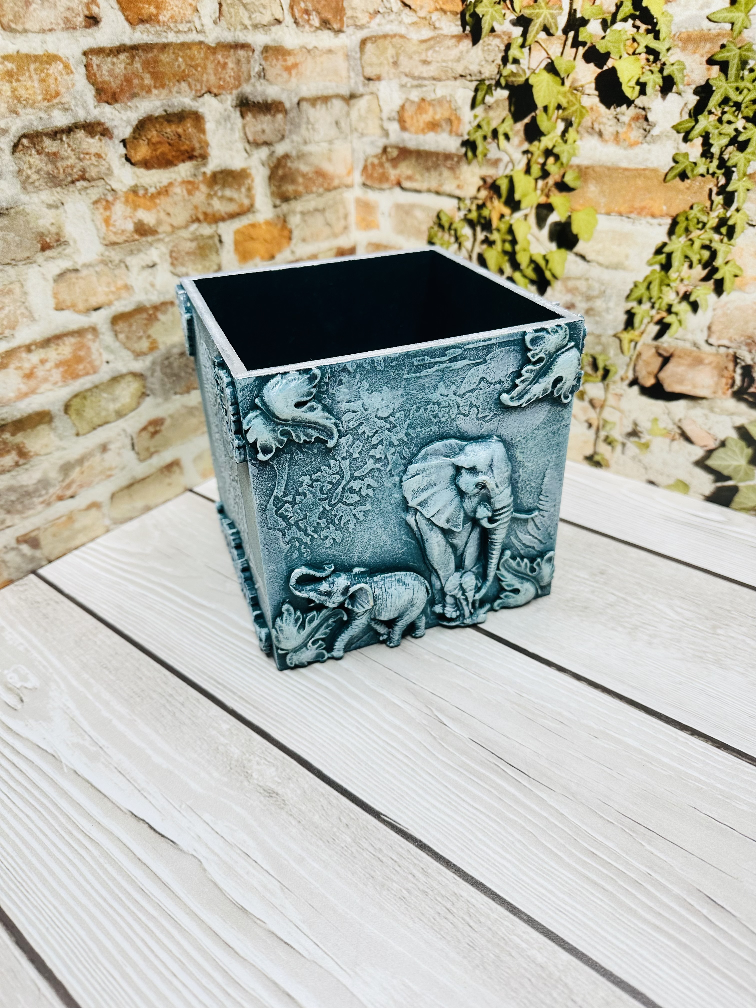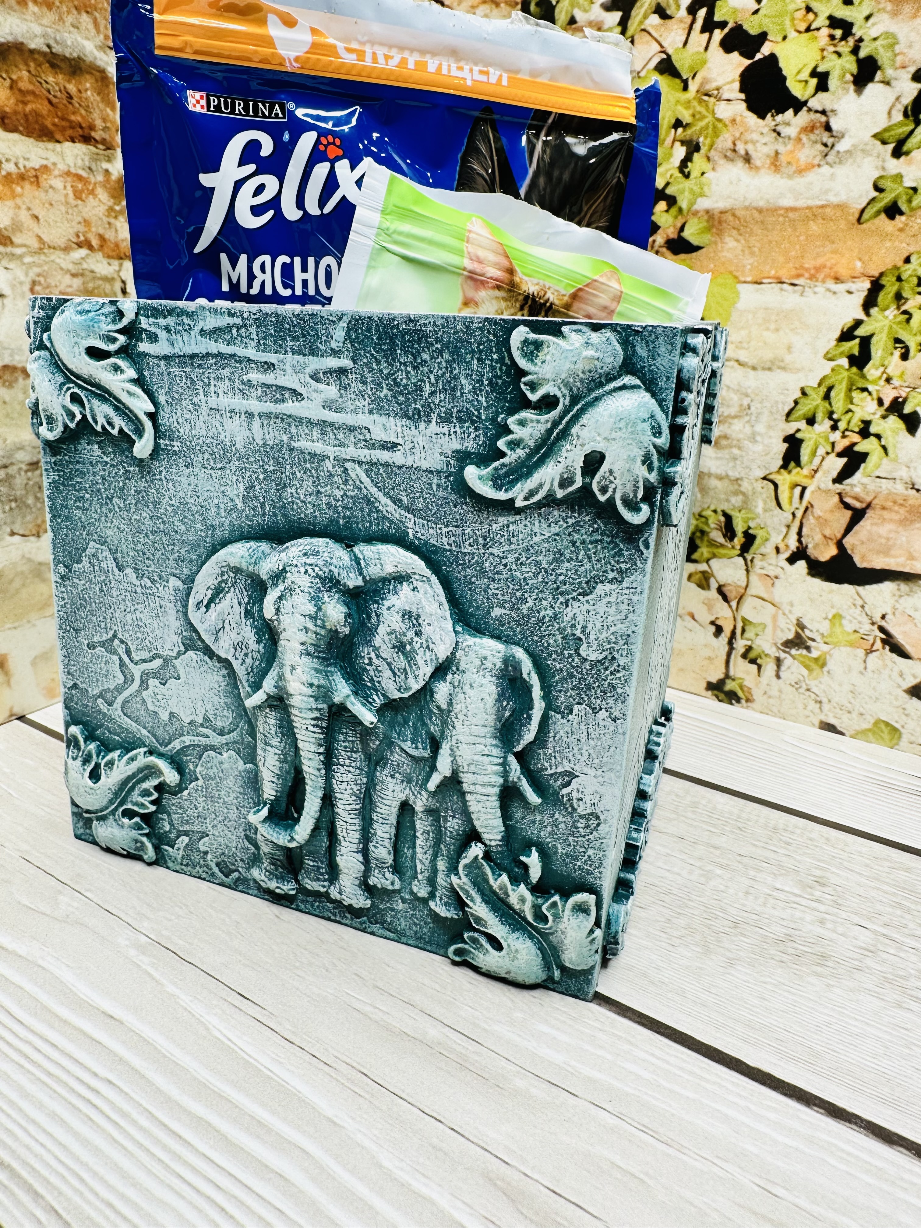 Оригинальная коробочка изготовленная из качественного МДФ и дополненная изображениями слонов с использованием художественных восков и яркими акриловыми красками. Идеально подходит для аккуратного хранения различных мелочей: от пультов до косметики и расчёсок. Создаст атмосферу сафари в вашем доме, поможет поддерживать порядок и подарит радость от пользования красивым предметом интерьера. Сделайте свою жизнь приятнее и удобнее с нашей оригинальной коробочкой.