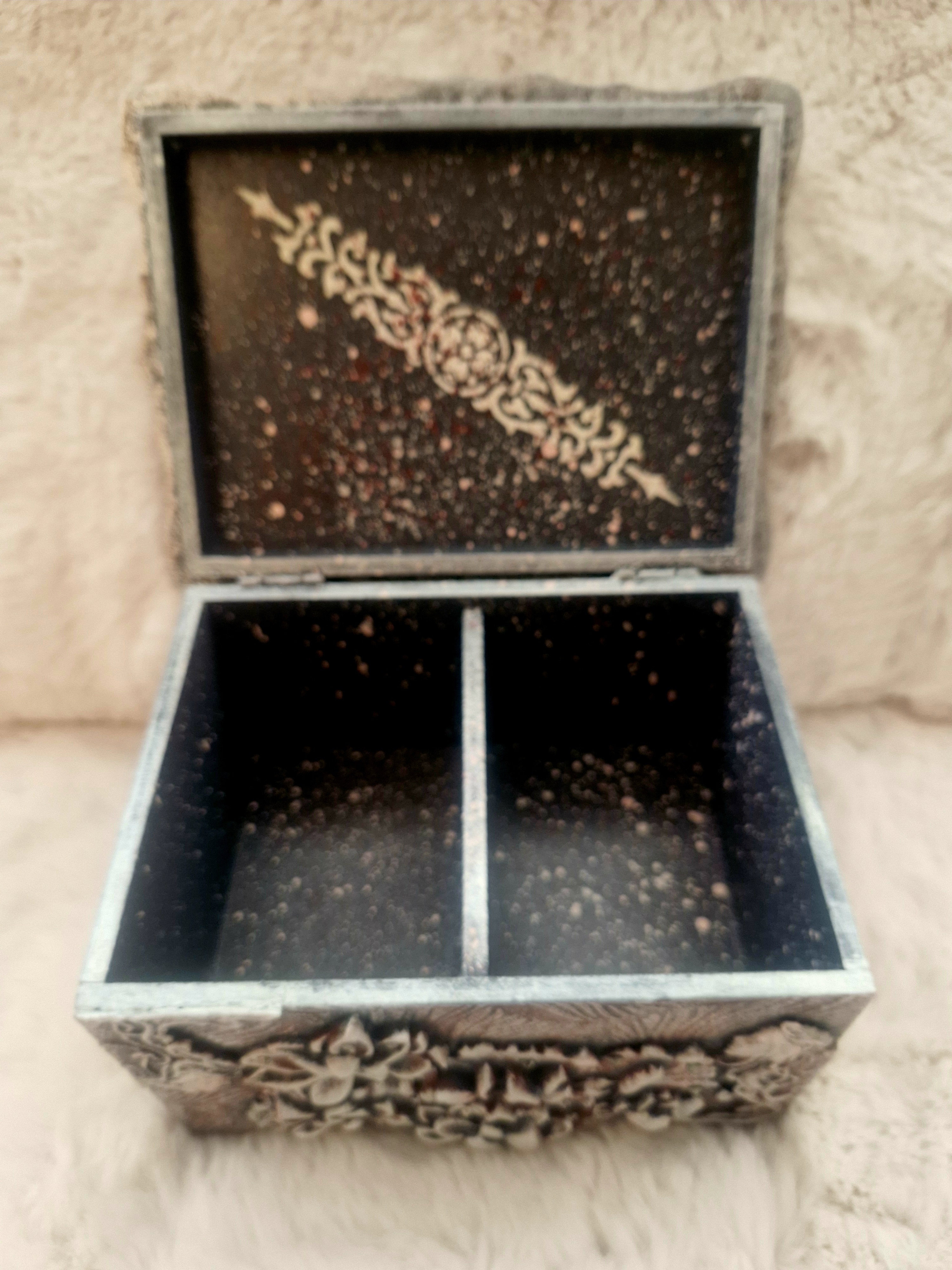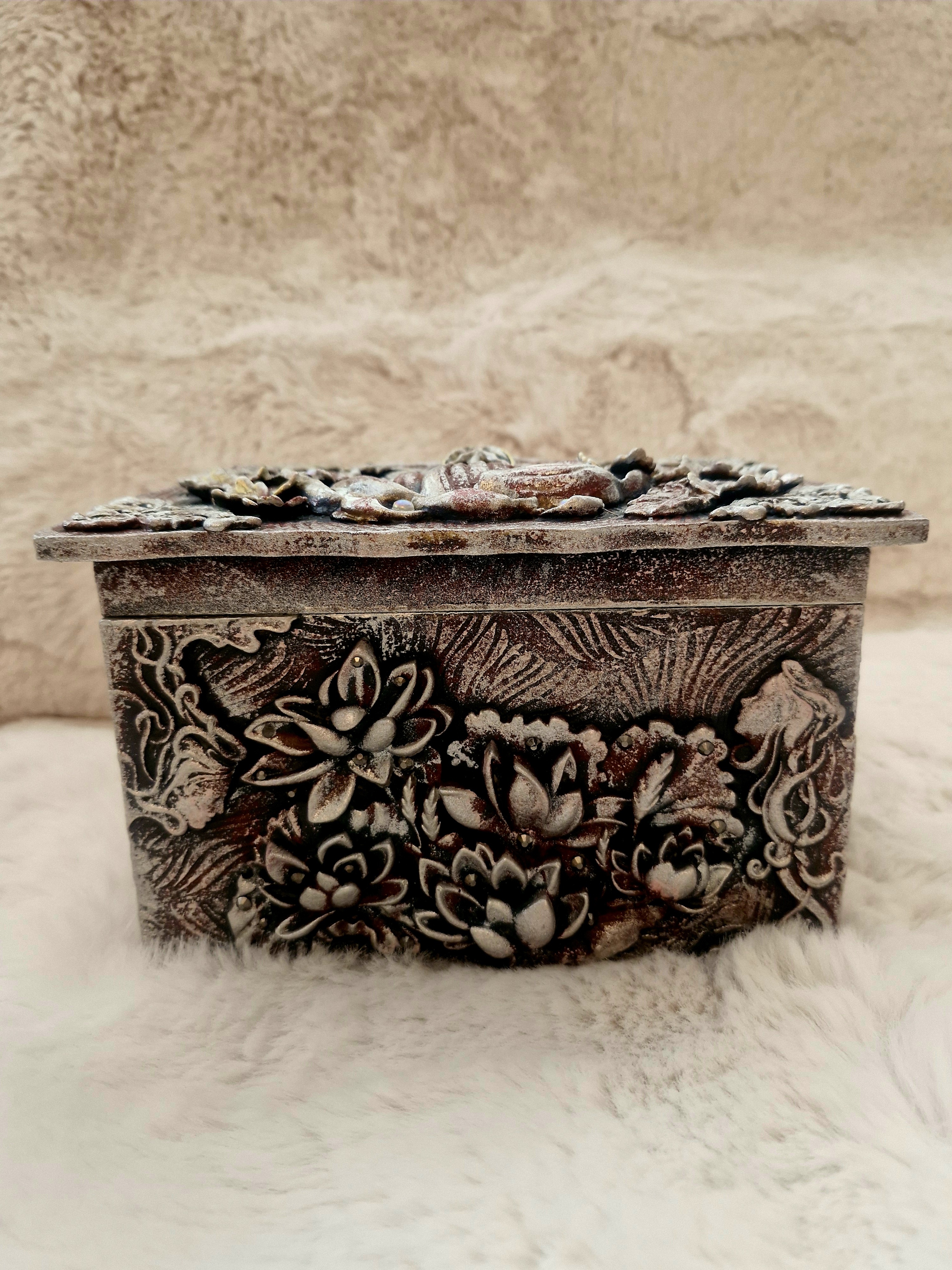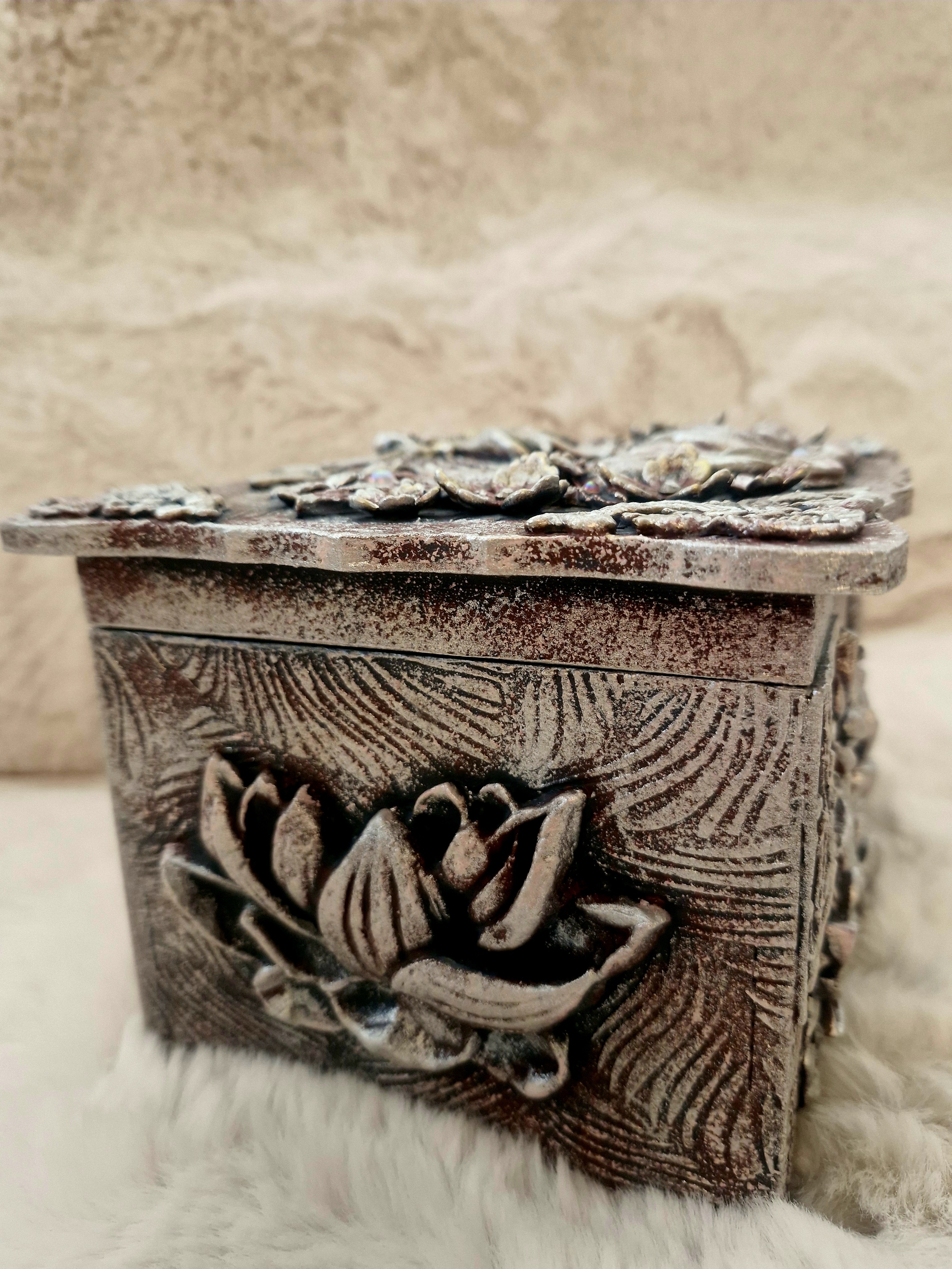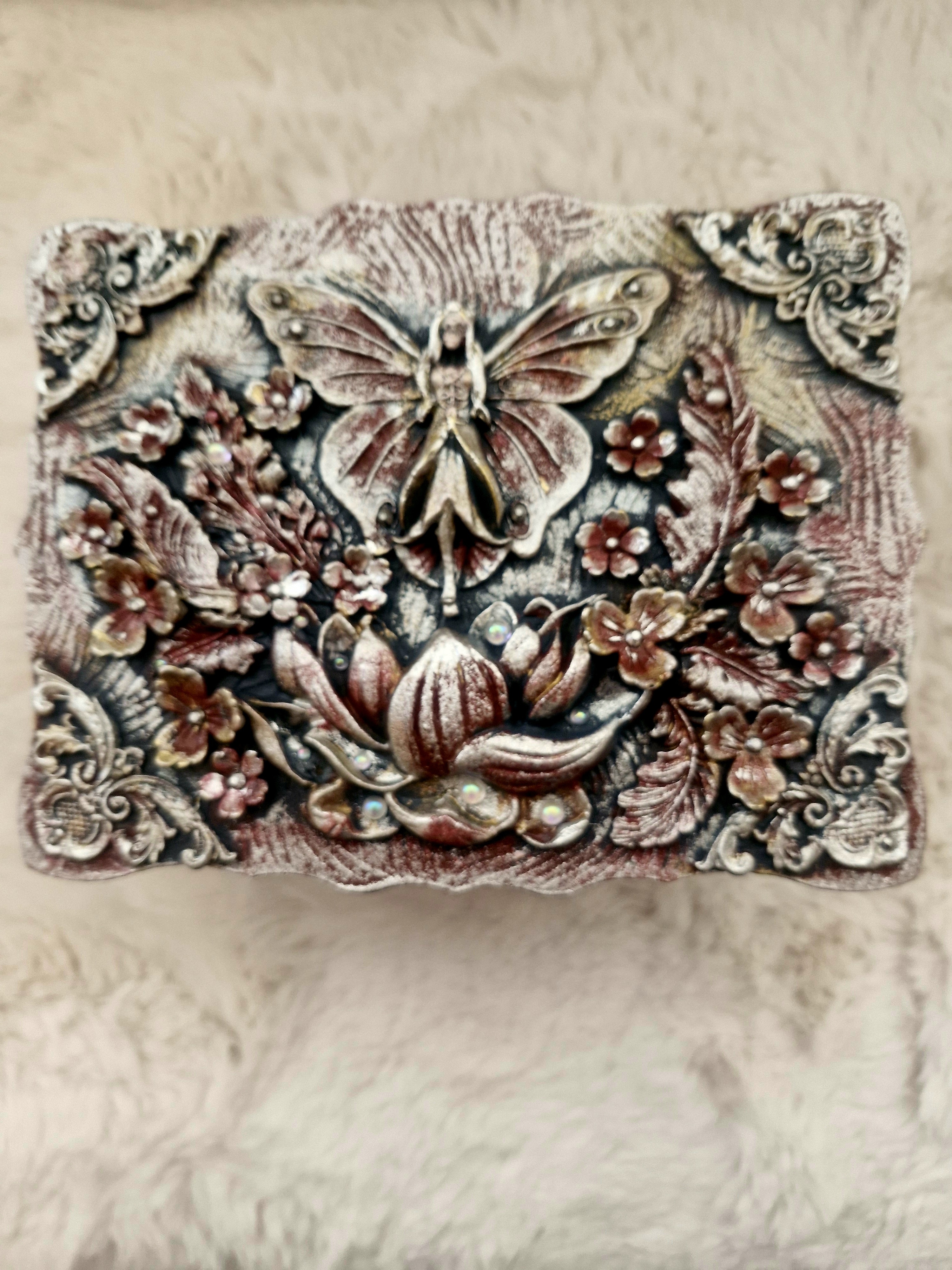Эту оригинальную коробочку отличает сочетание экологичного материала МДФ и уникального декора в технике Mix Media. Она украшена изображениями нежных лилий и очаровательной феи, выполненных с помощью моделирующей пасты, художественных восков и ярких акриловых красок.