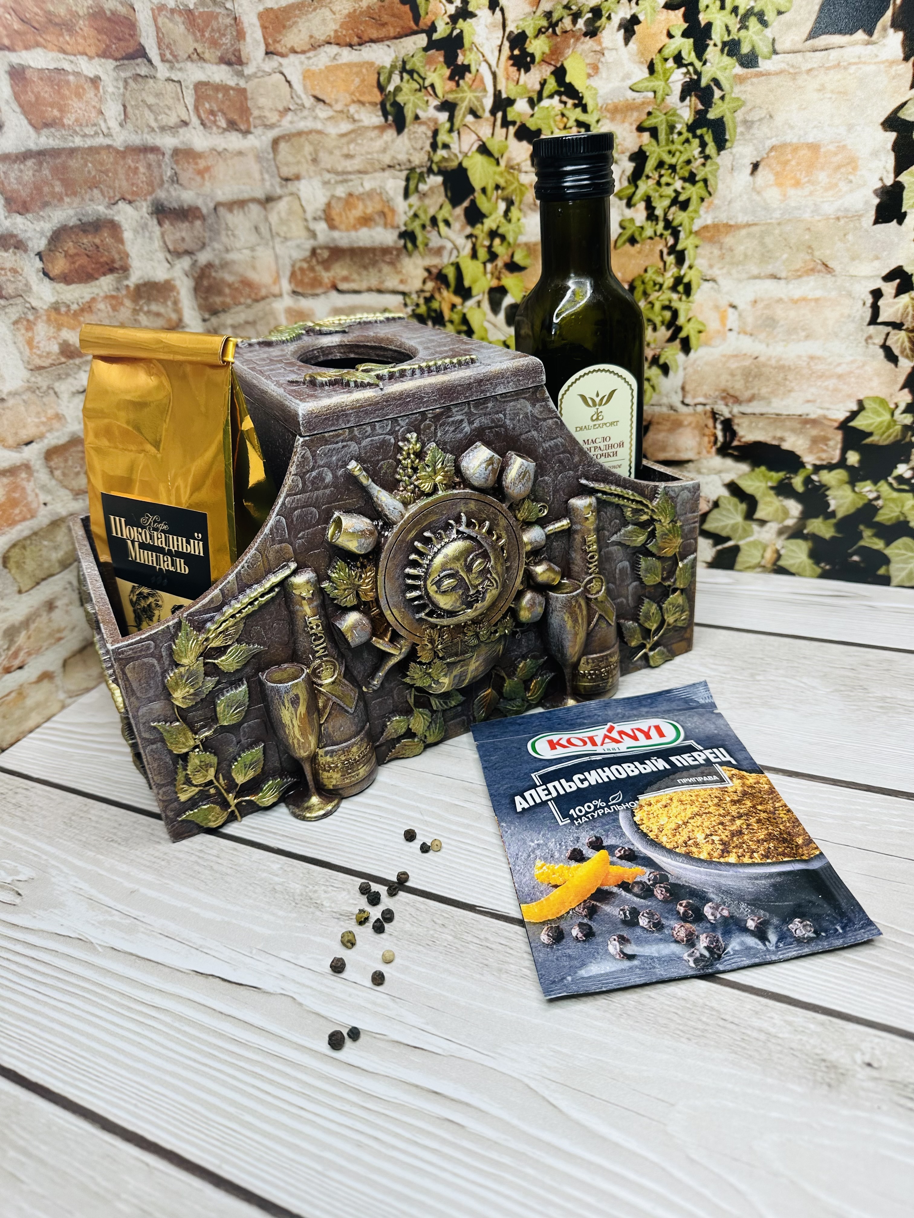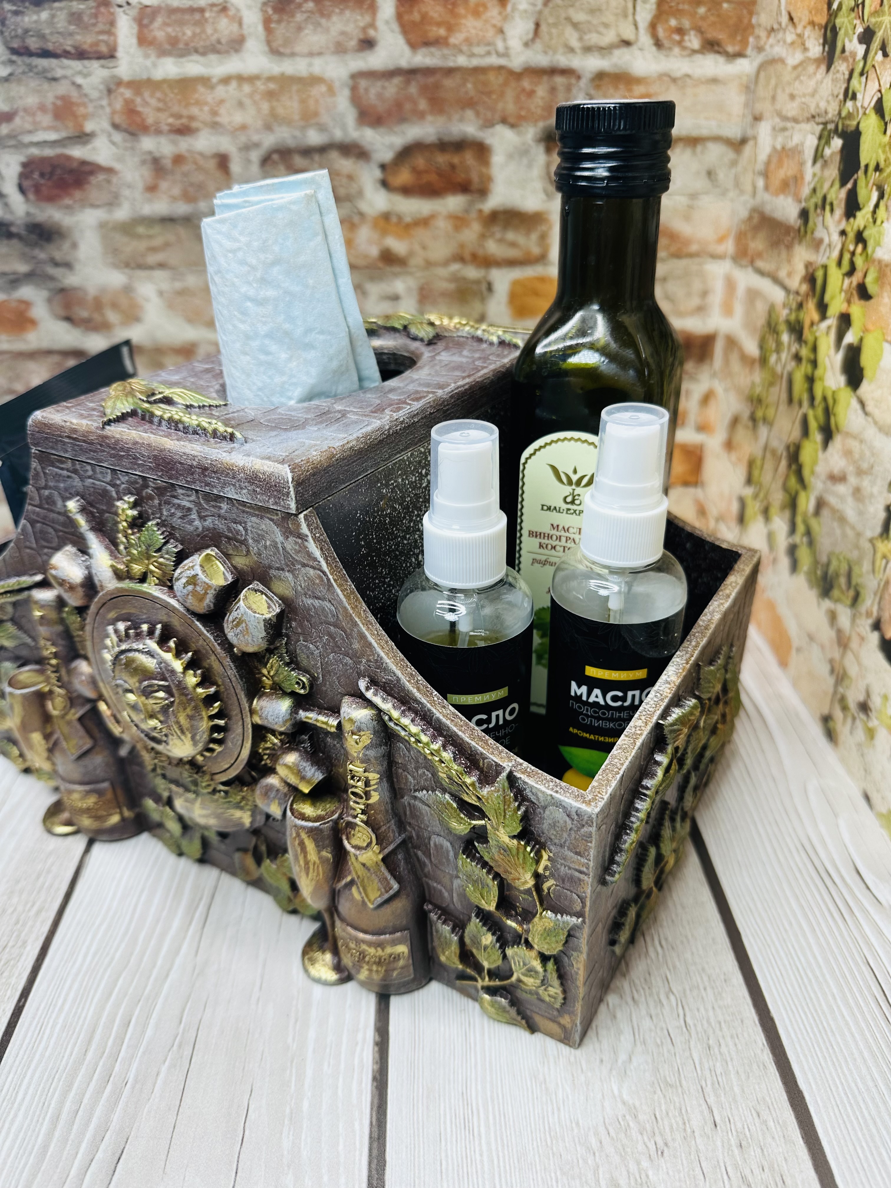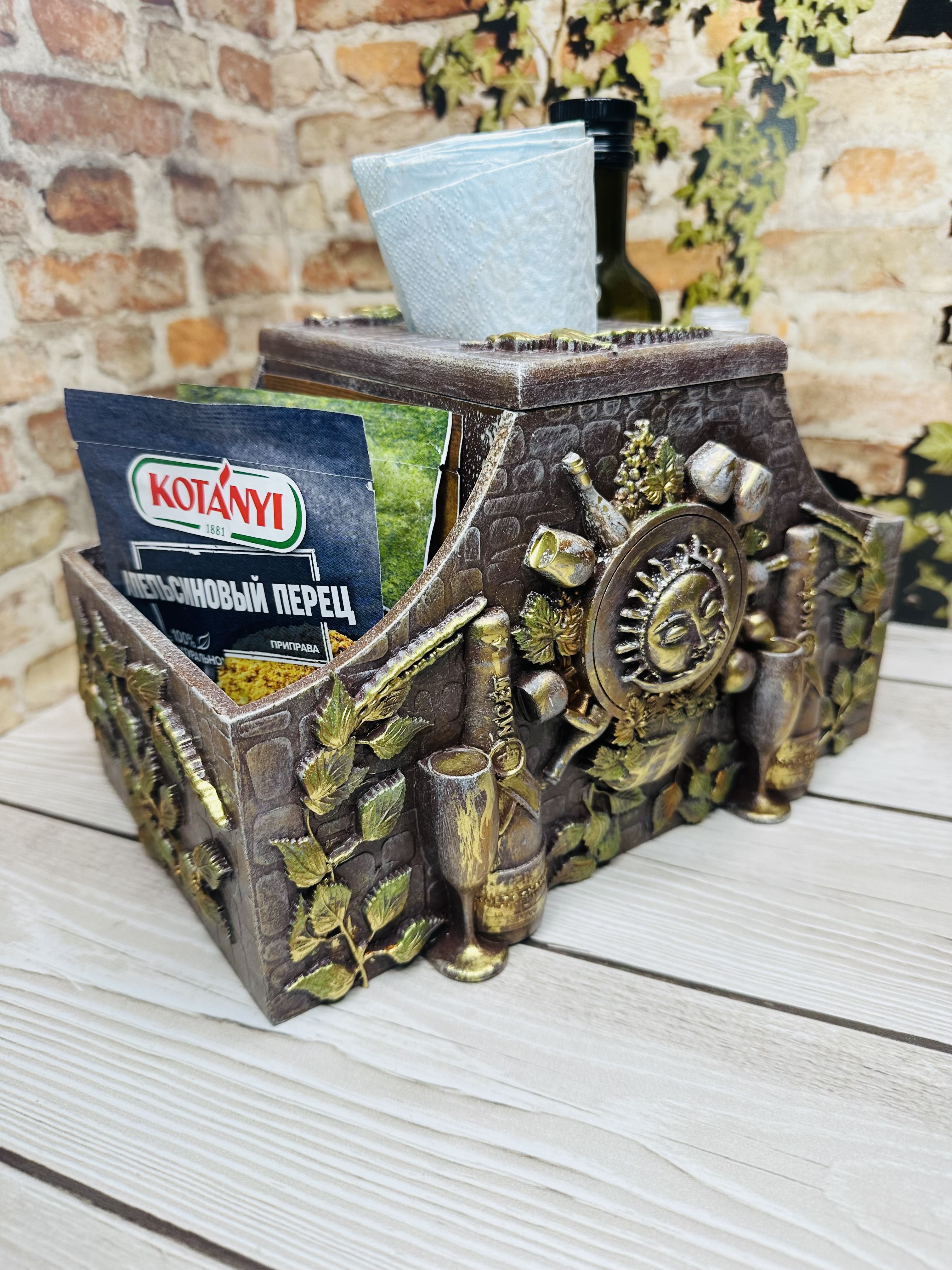 Короб-органайзер для специй, приправ и соусов — стильный помощник на кухне каждой хозяйки. Изготовлен из прочного МДФ, украшен декоративными элементами, художественными восками и акриловыми красками в оригинальной технике Mix Media.