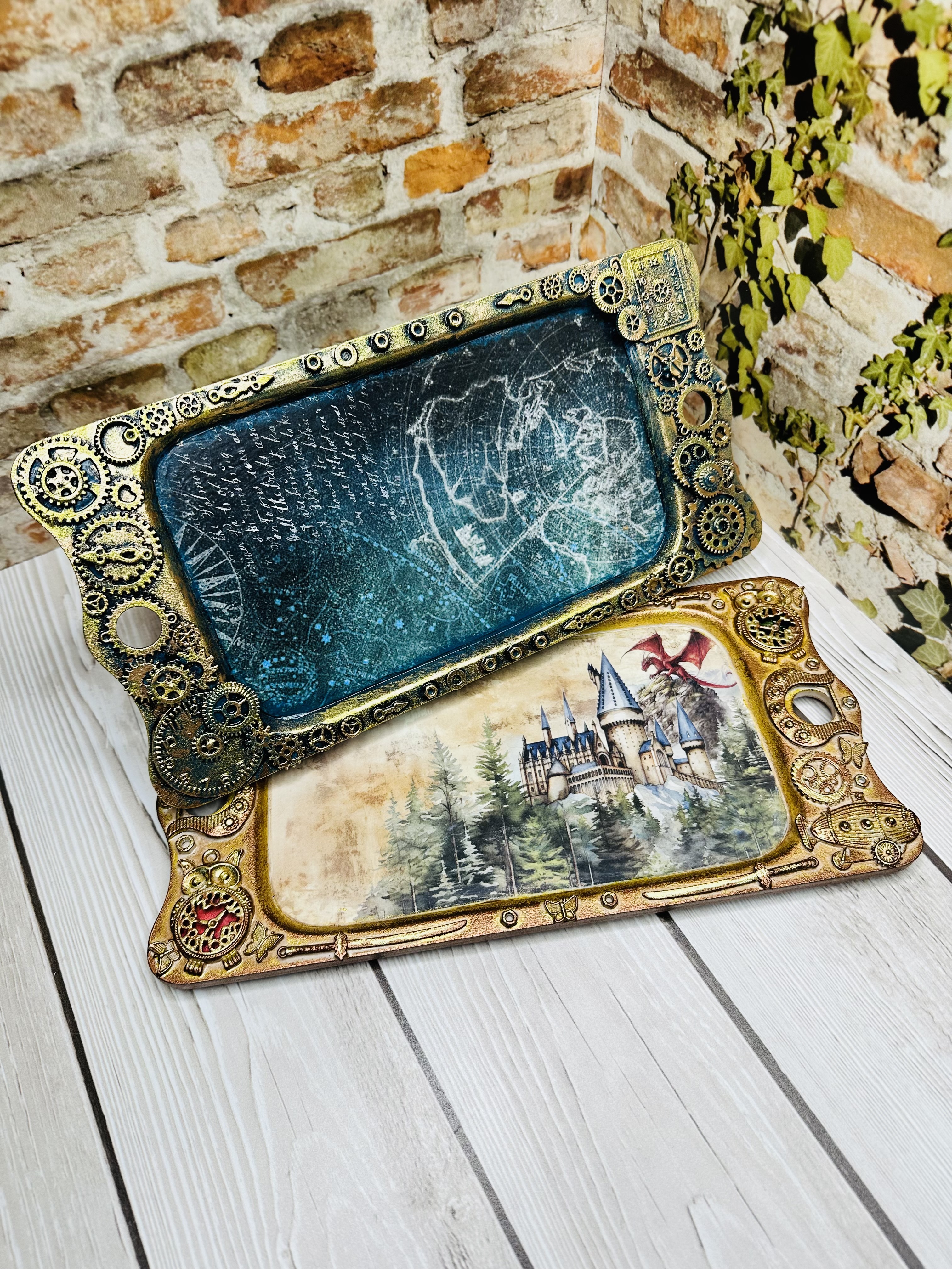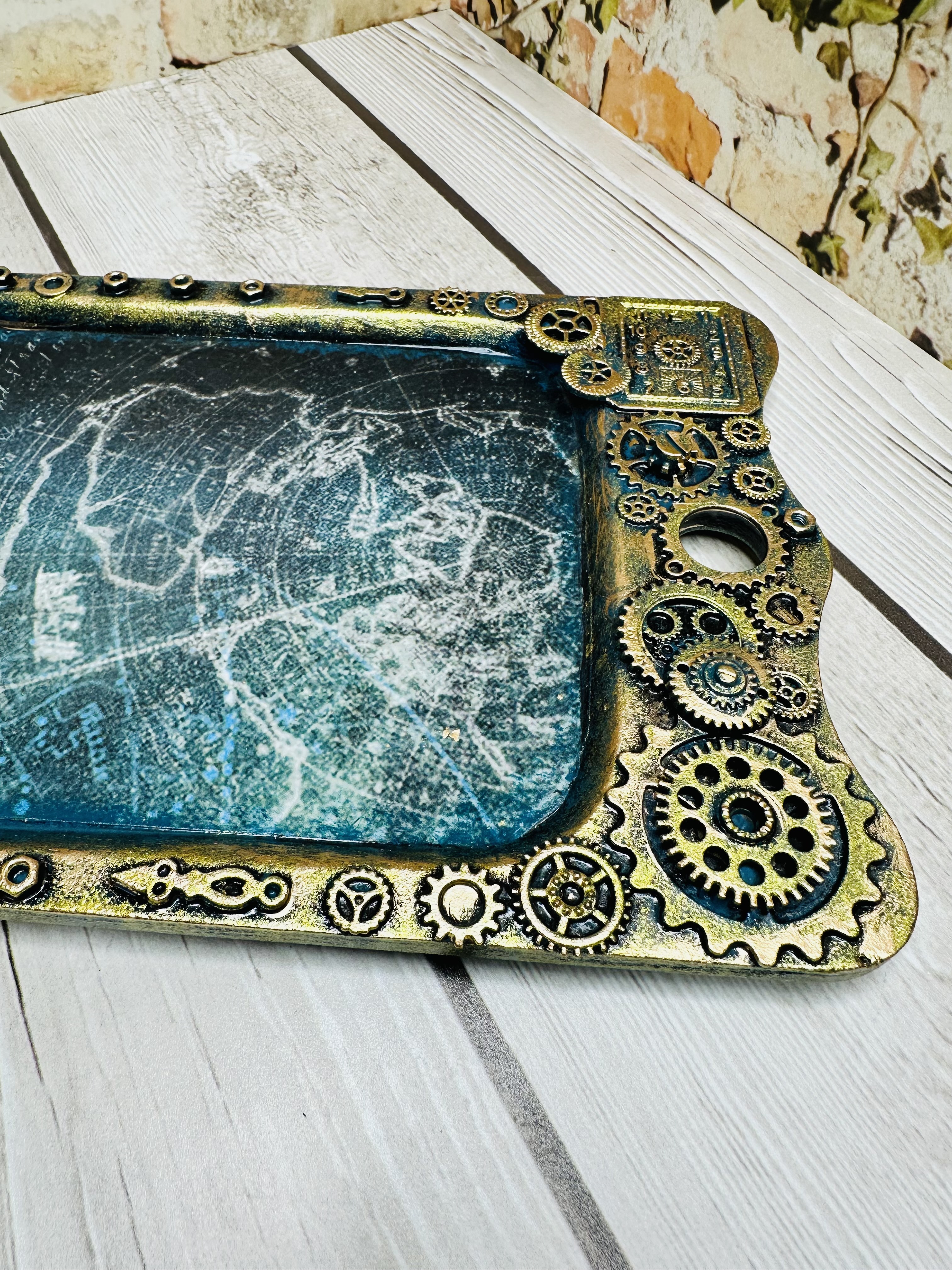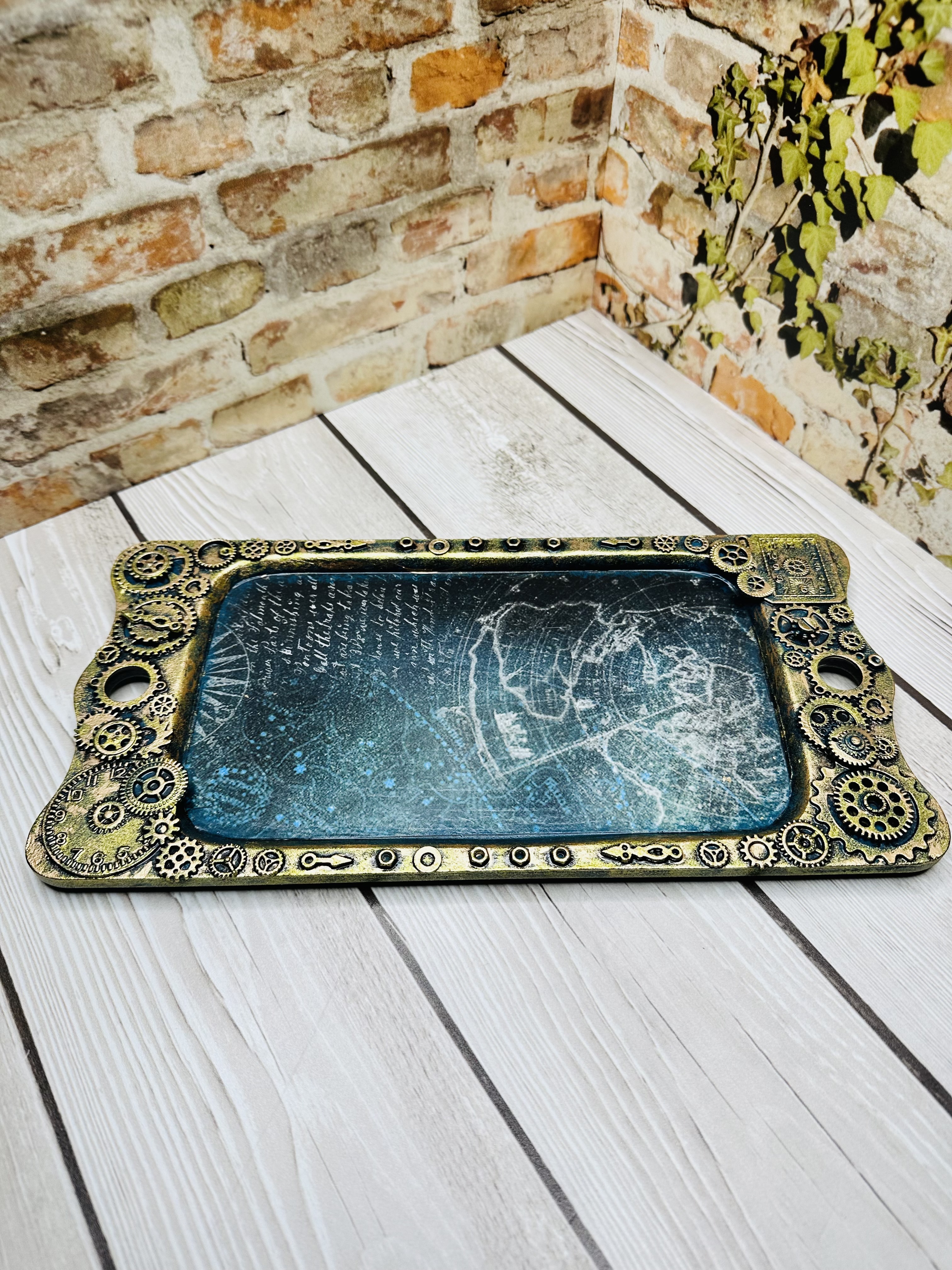 Мини-поднос в уникальном футуристическом стиле, созданный из прочного МДФ и украшенный металлическими шестернями, декупажными картами, художественными восками и акриловыми красками. Этот предмет гармонично сочетает технику Mix Media и Steampunk, добавляя особый шарм любому помещению. Отличное решение для подачи напитков и закусок, хранения аксессуаров или просто декоративного элемента интерьера. Такой необычный поднос привлечёт внимание и подчеркнёт ваш вкус к необычному дизайну.