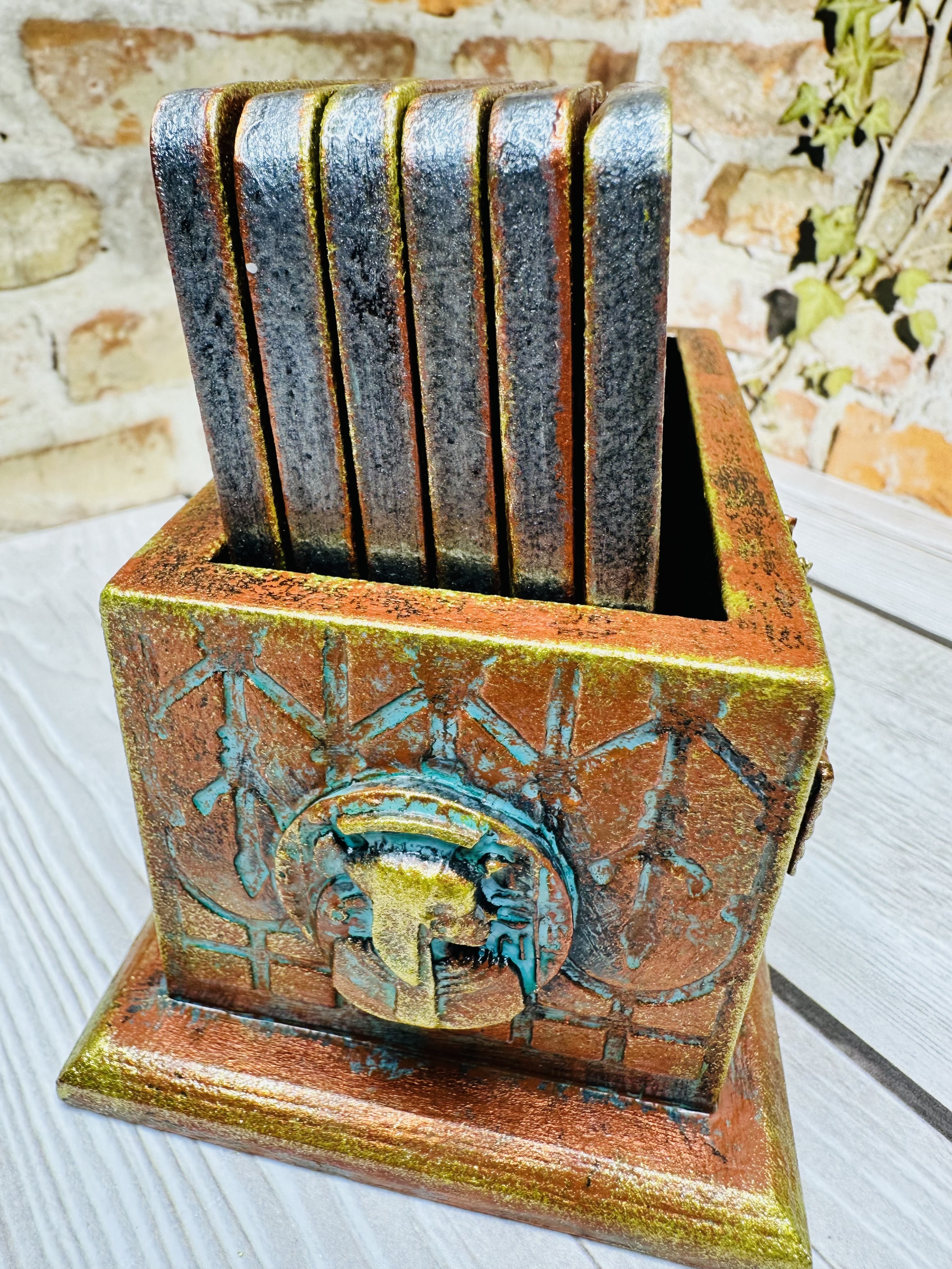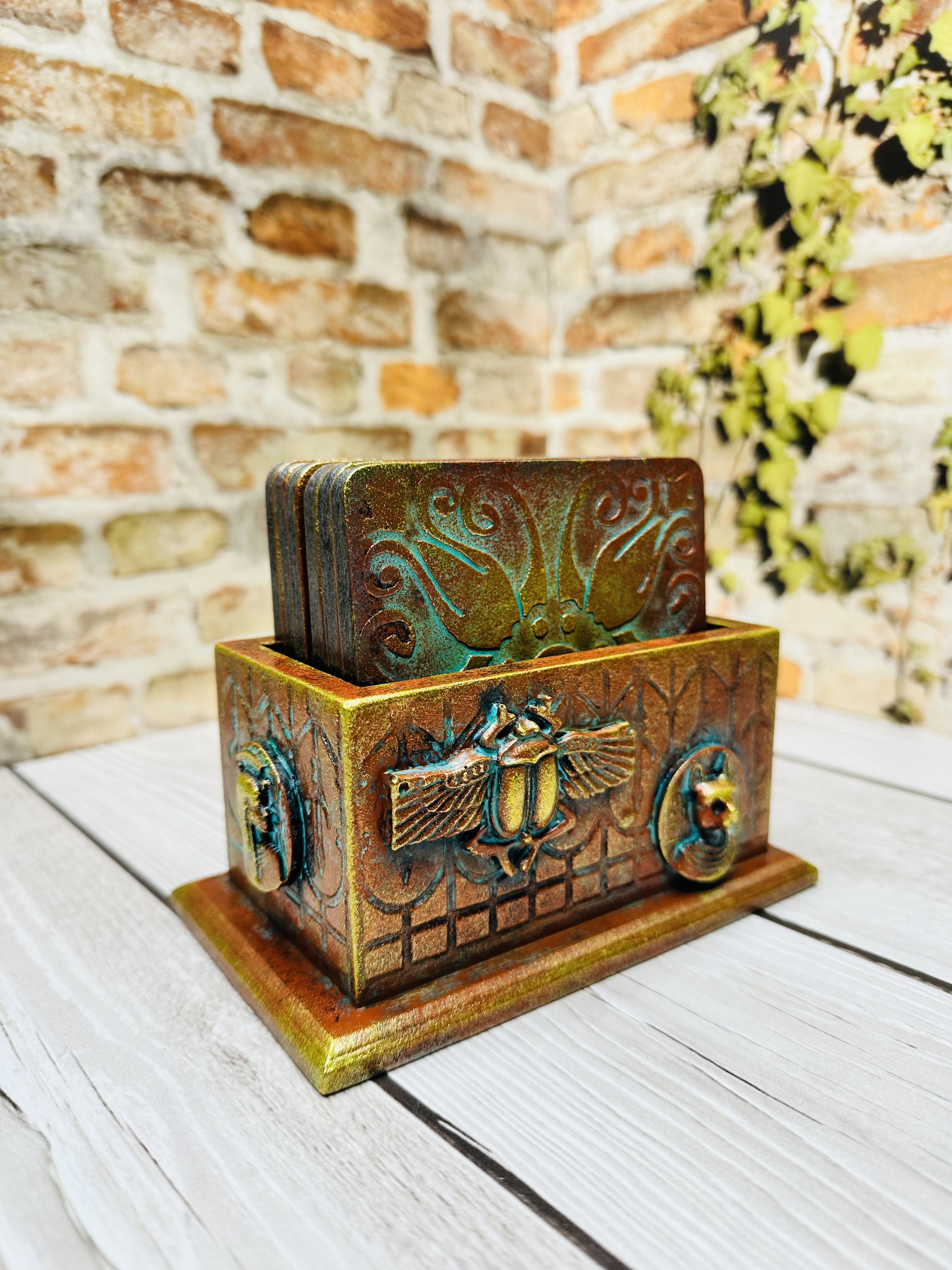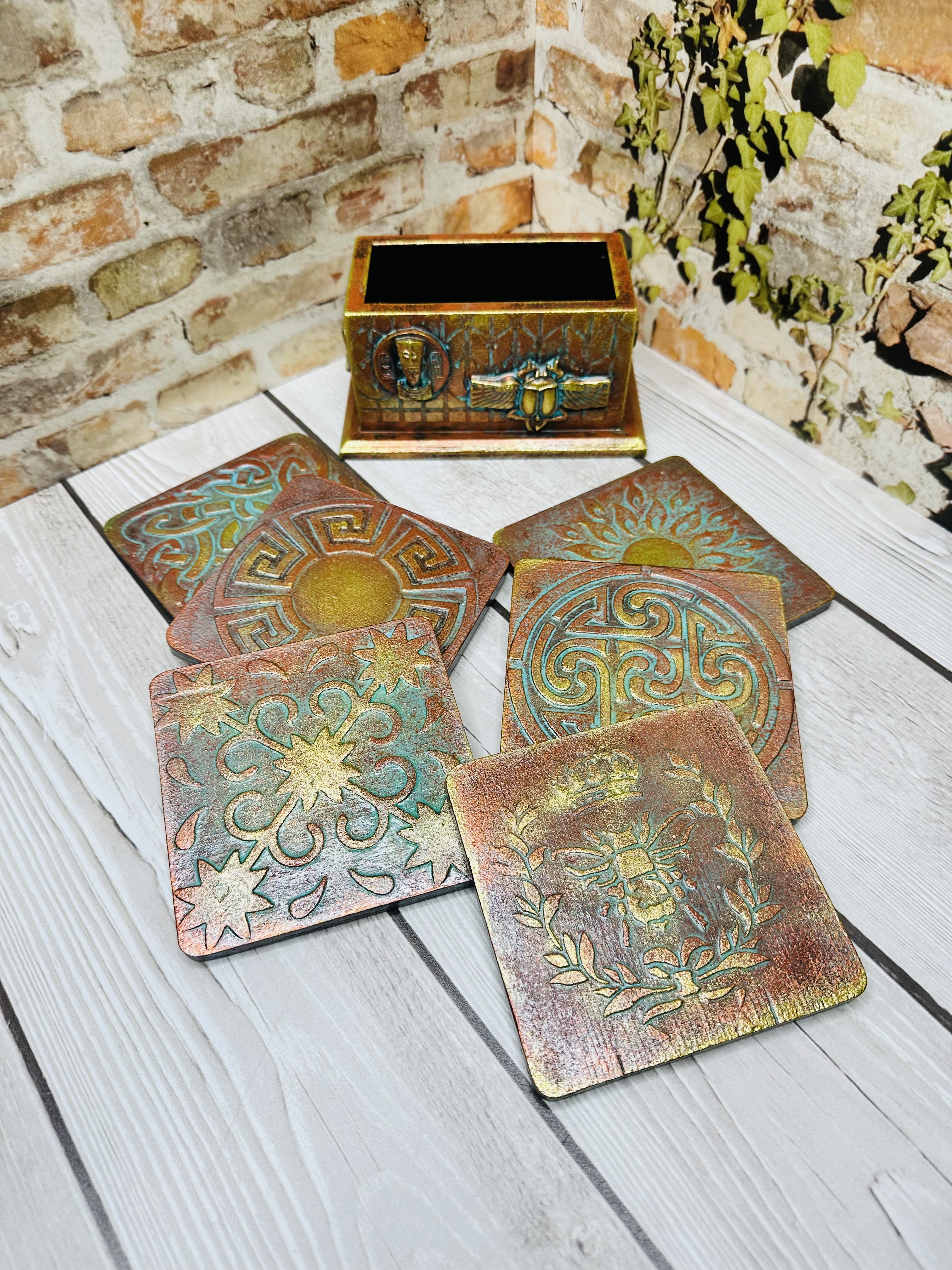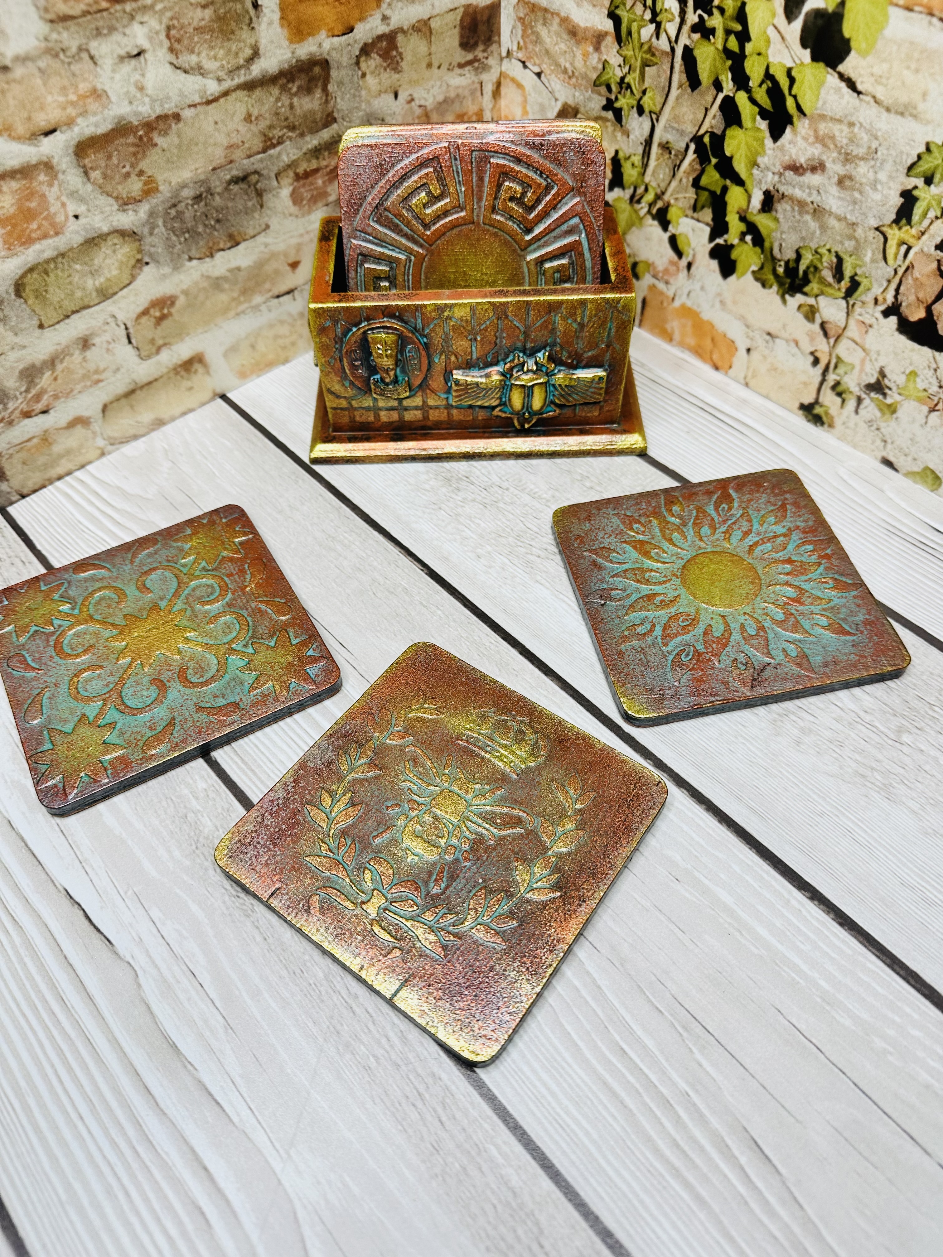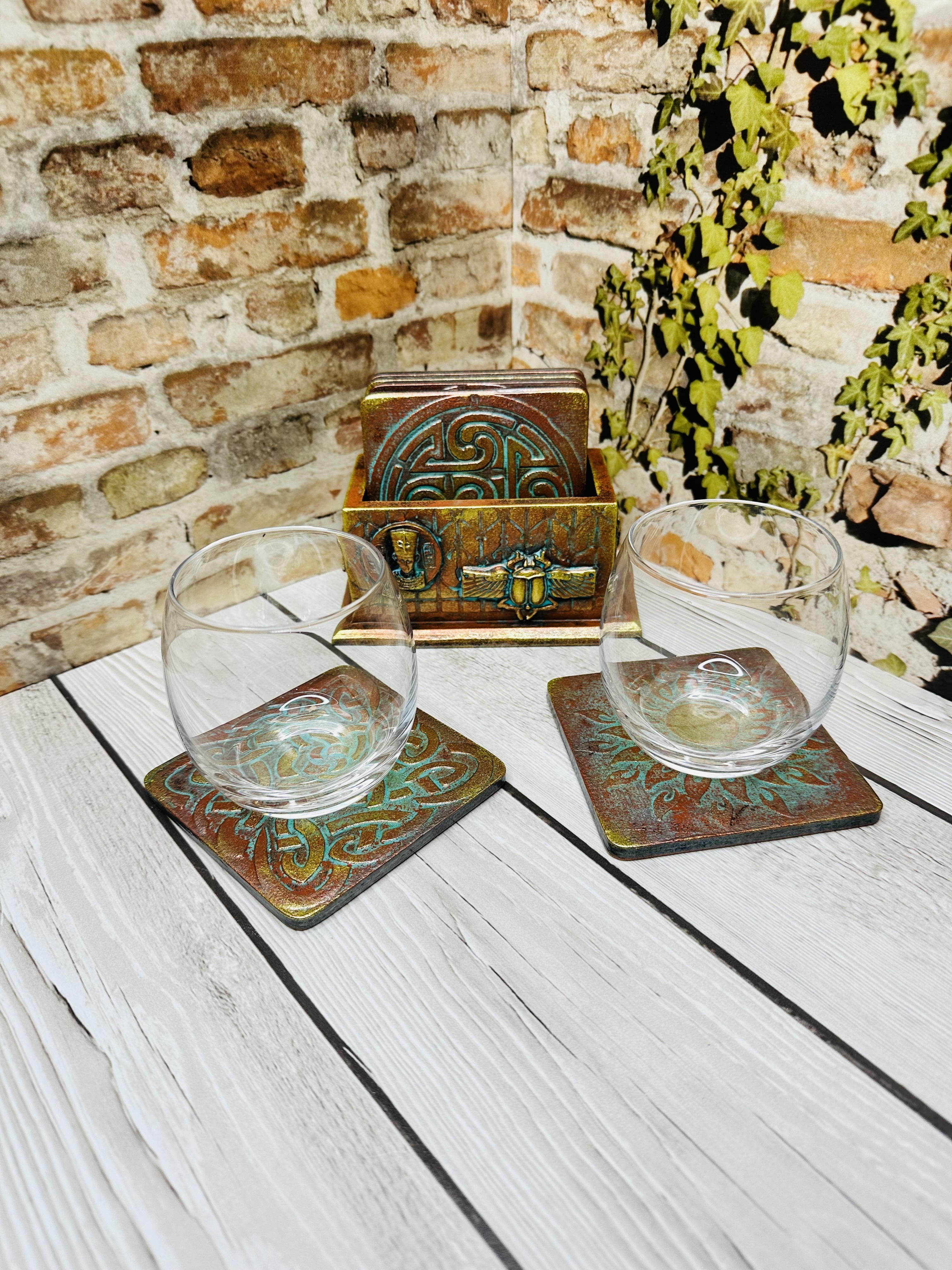 Уникальные декоративные подставки под стаканы или горячую посуду, выполненные вручную из натурального материала — МДФ. Использованы элементы художественной отделки: моделирующая паста, натуральные воски, краски и лаки. Вдохновлённая древнеегипетской культурой, каждая деталь подчёркивает особый стиль и защищает поверхность стола от повреждений. Эти подставки станут прекрасным дополнением любого интерьера, добавив оригинальности и защищая мебель от царапин и пятен. Подходят как практичный подарок друзьям и близким людям, заботящимся о красоте и комфорте своего жилища.