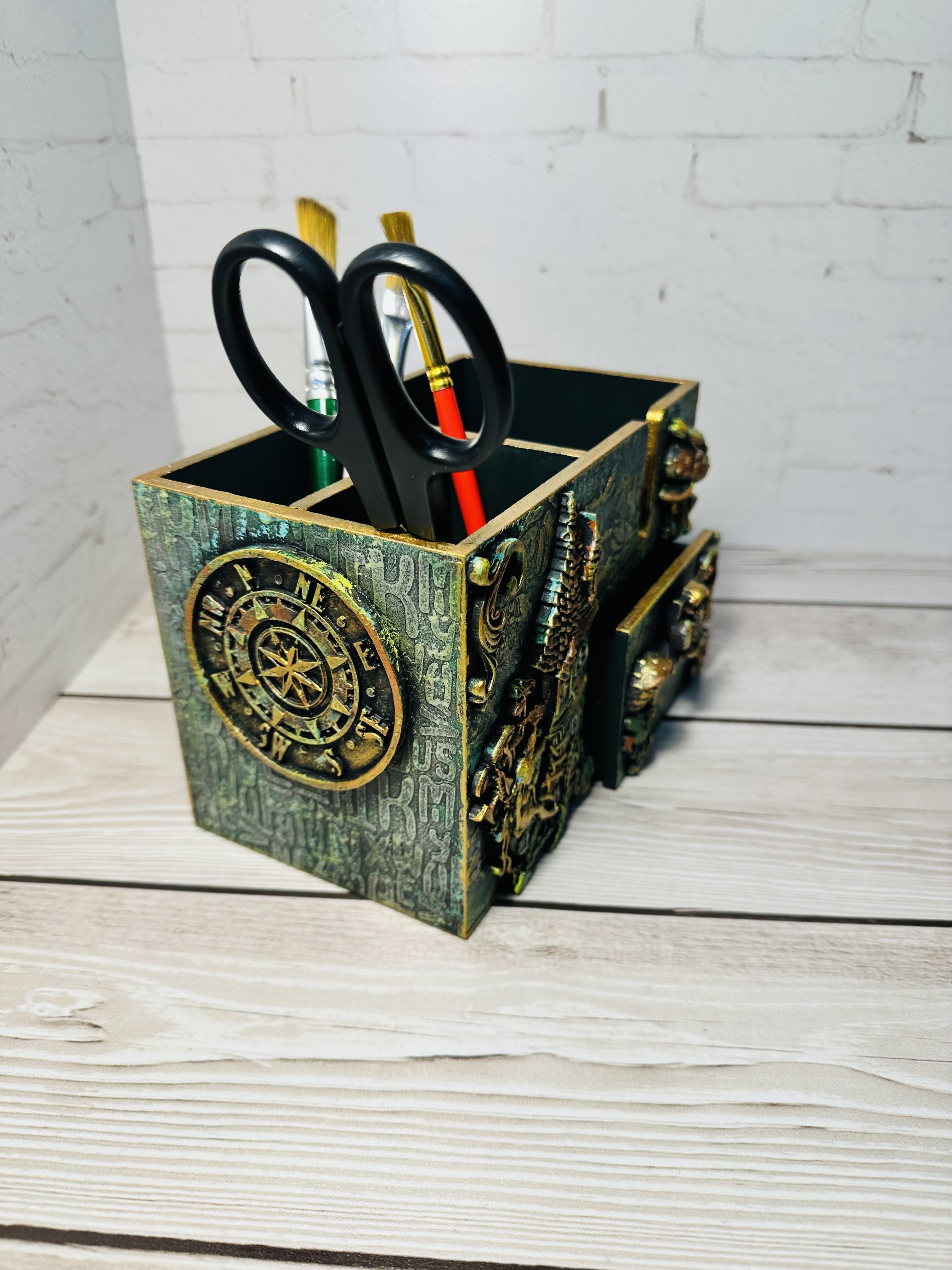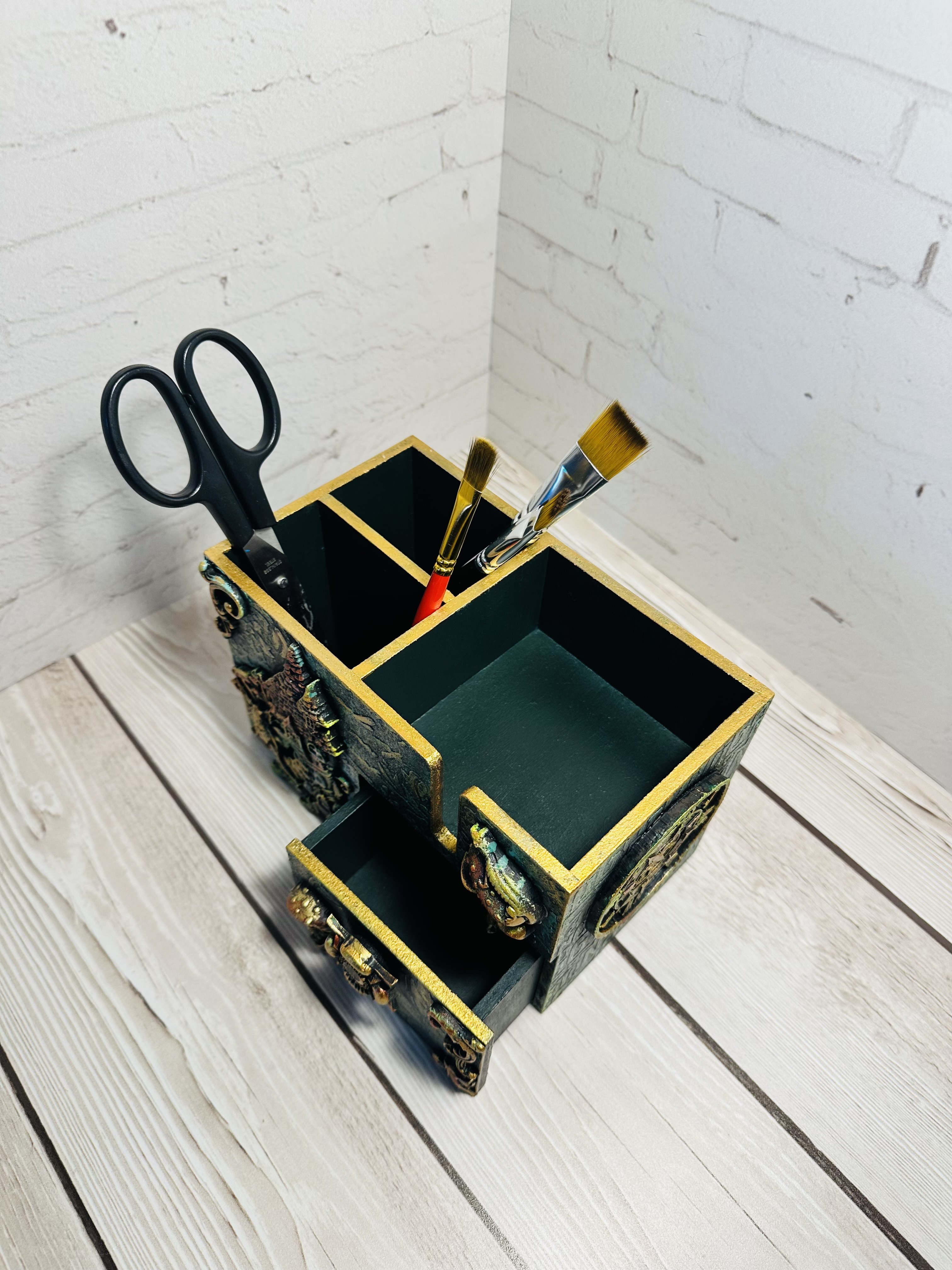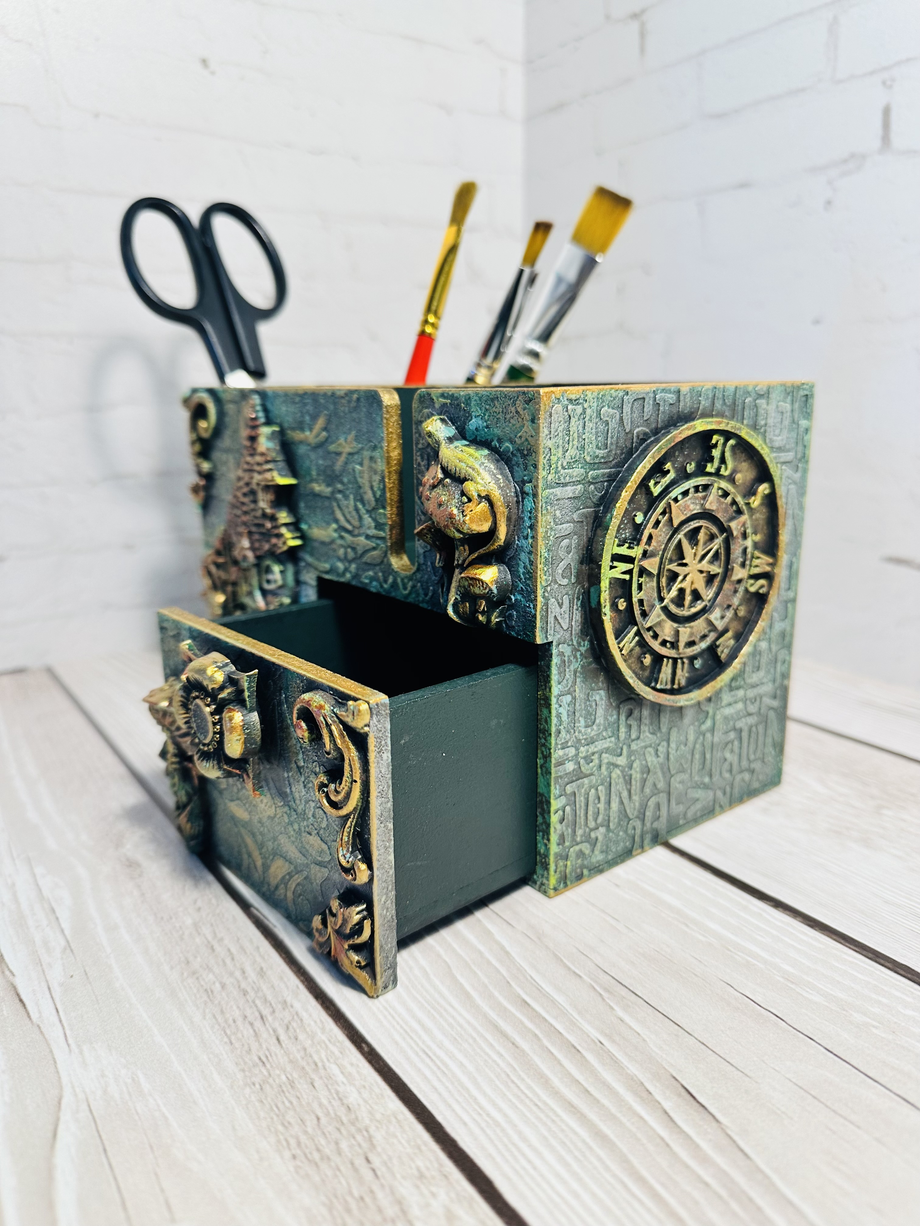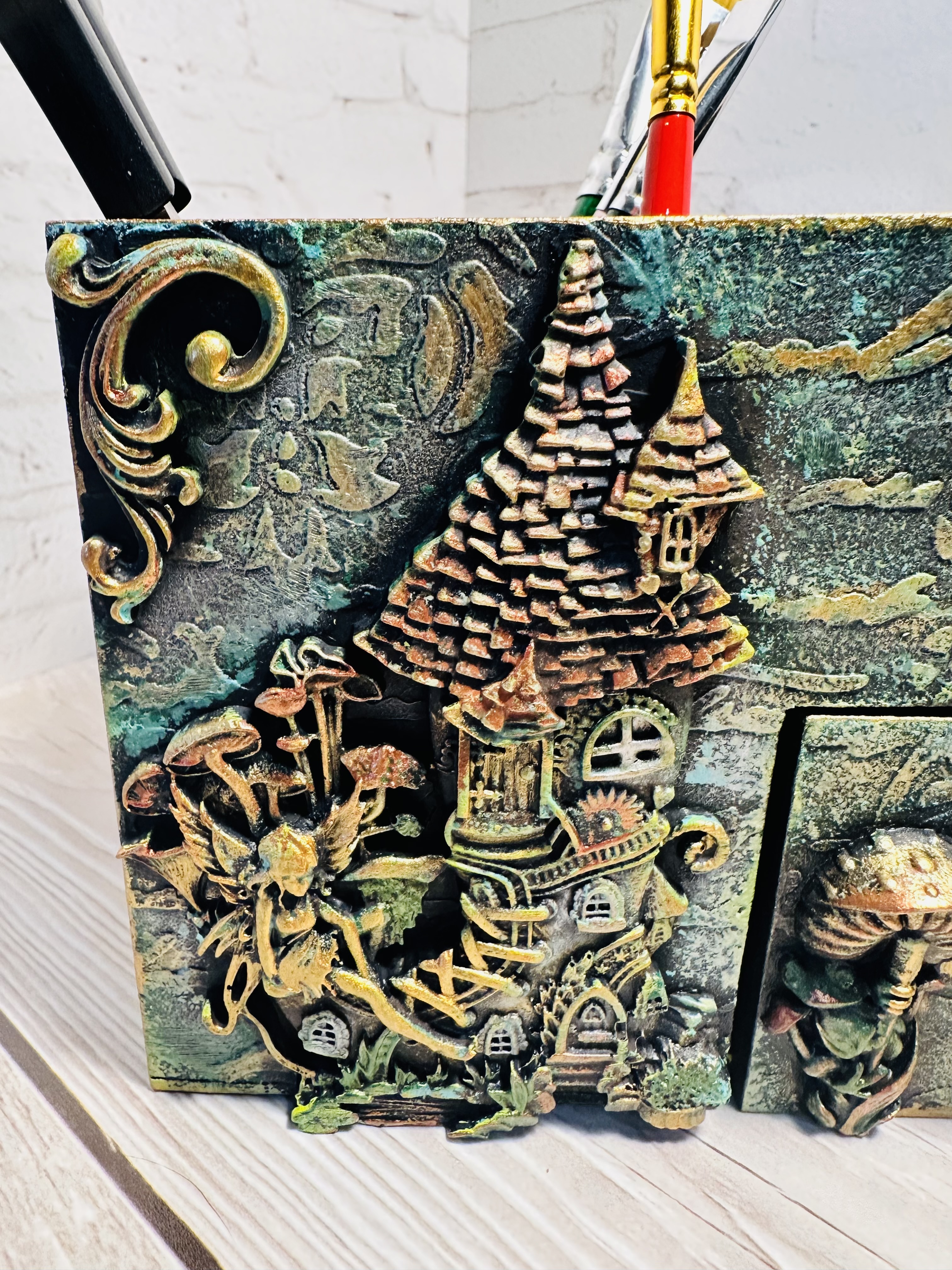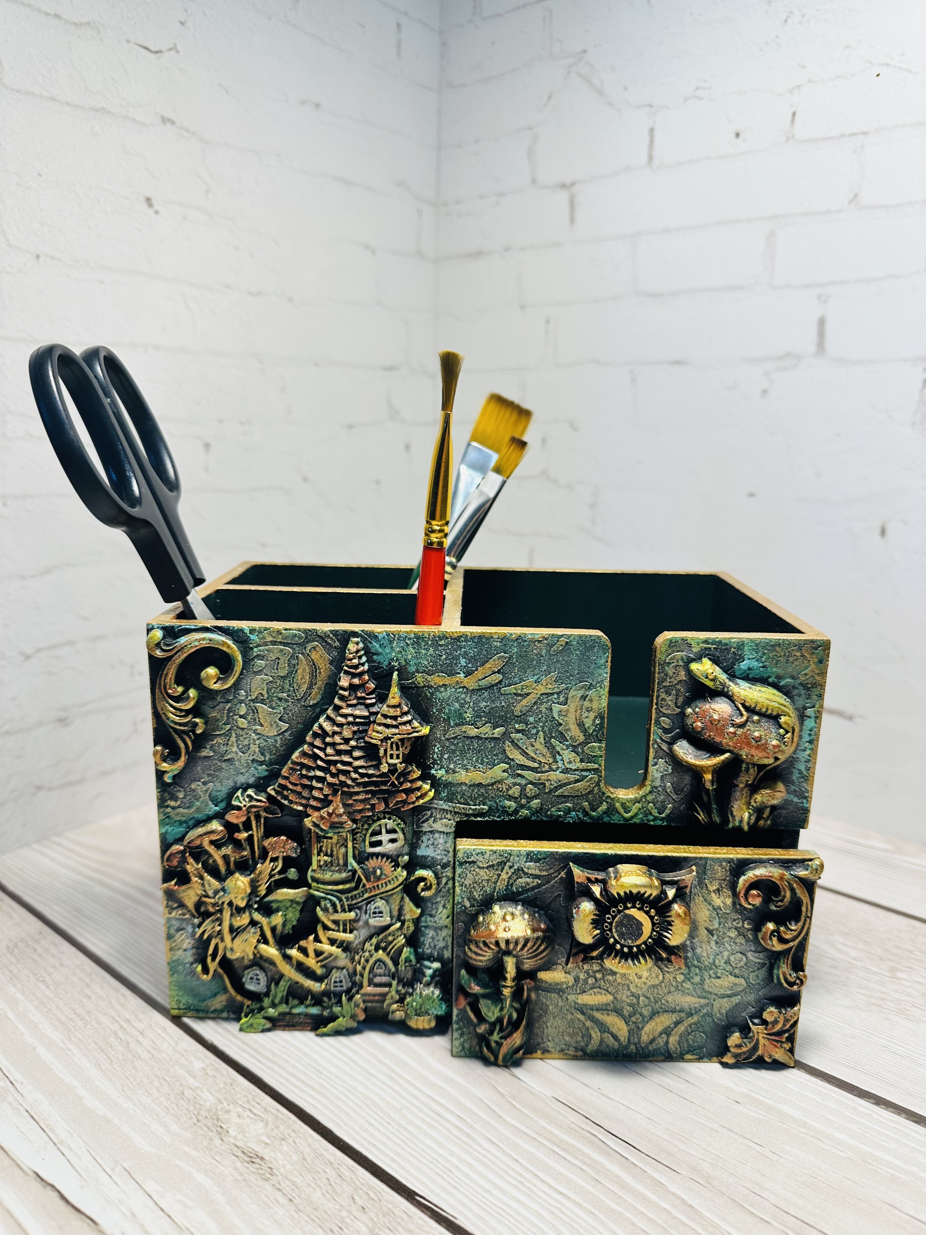 Этот оригинальный органайзер выполнен из натурального МДФ в сказочной стилистике с применением техник Mix Media: декоративные элементы, художественная паста, воски и акриловые краски придают изделию особую выразительность и очарование.