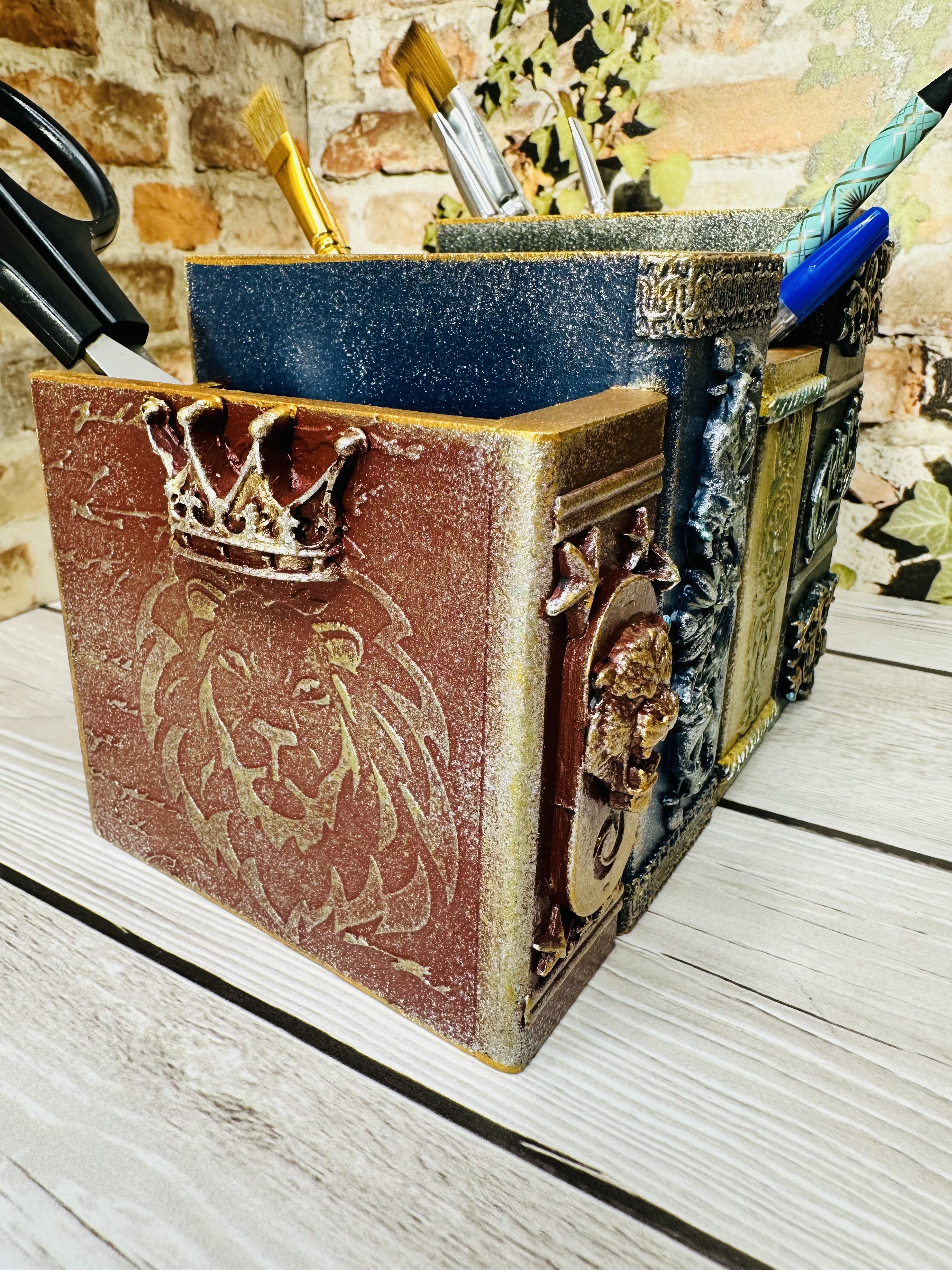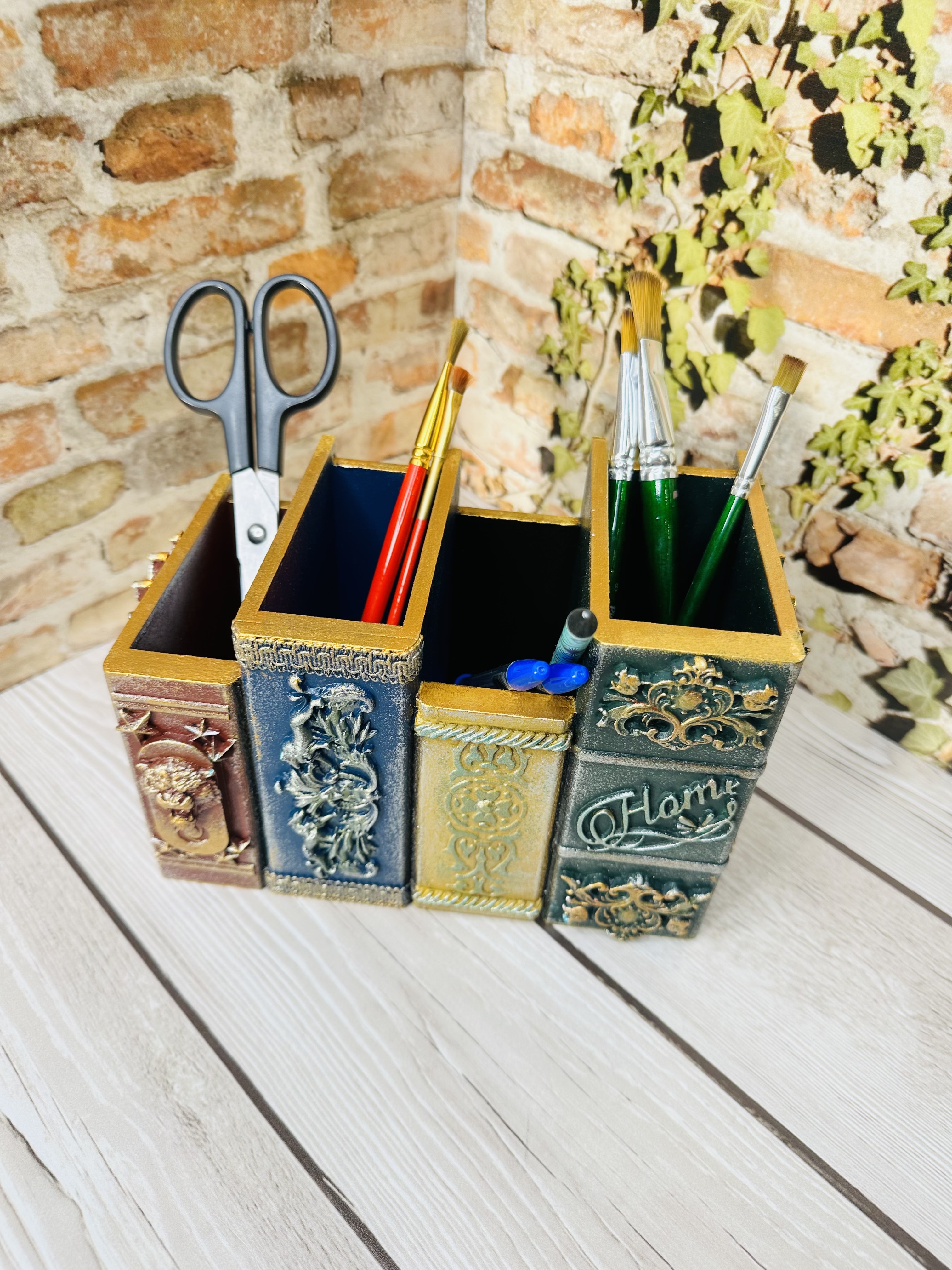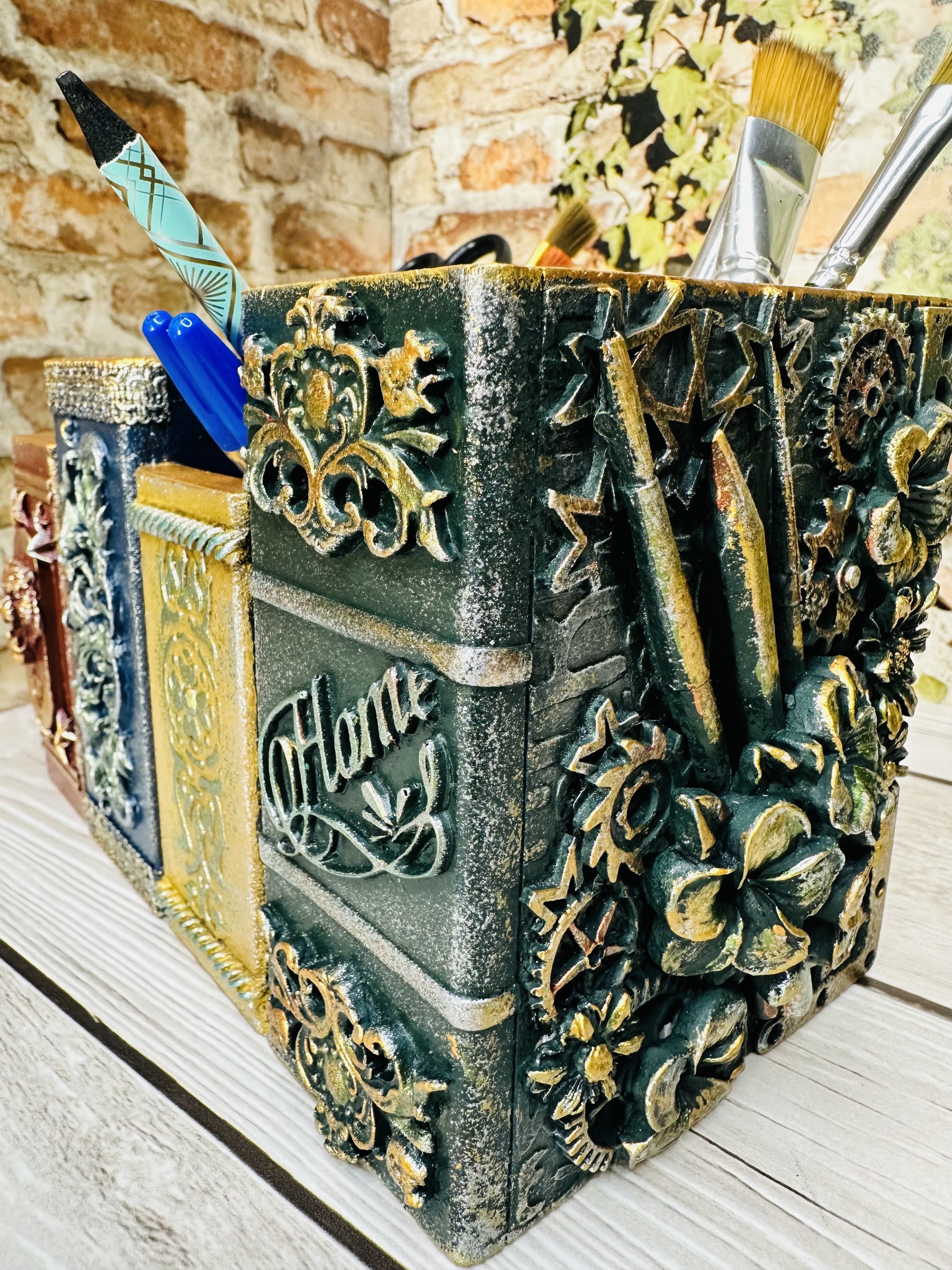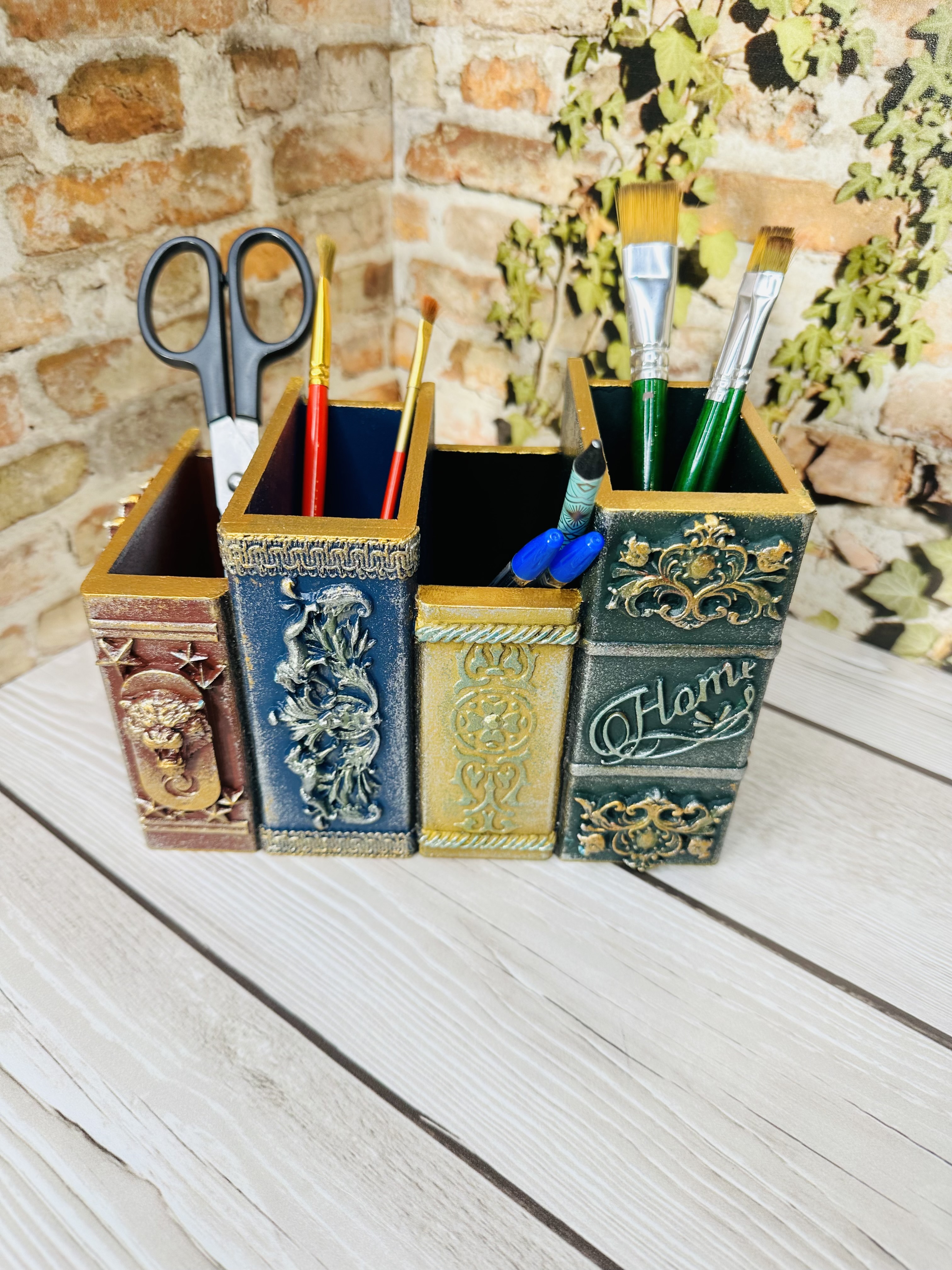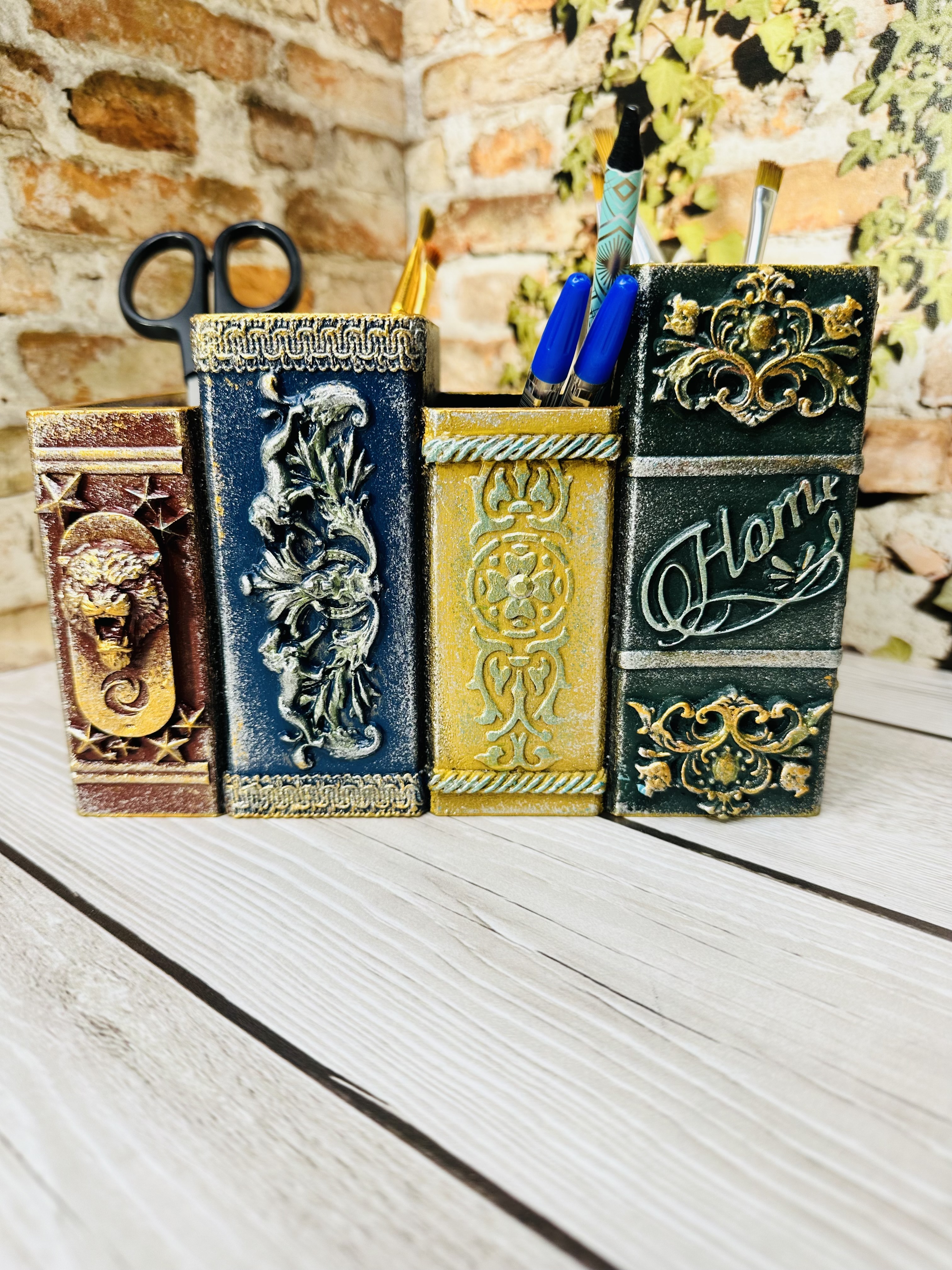Уникальный органайзер в виде четырёх книг, изготовленный из экологичного МДФ с применением техник Mix Media. Красивое оформление с помощью художественной пасты, восков и акриловых красок придаёт изделию особый шарм. Полезен для аккуратного размещения канцелярских принадлежностей и мелких предметов. Организует пространство на столе, помогает поддерживать порядок и вдохновляет своим необычным дизайном. Подходит как взрослым, так и детям. Сделайте ваш рабочий уголок особенным!