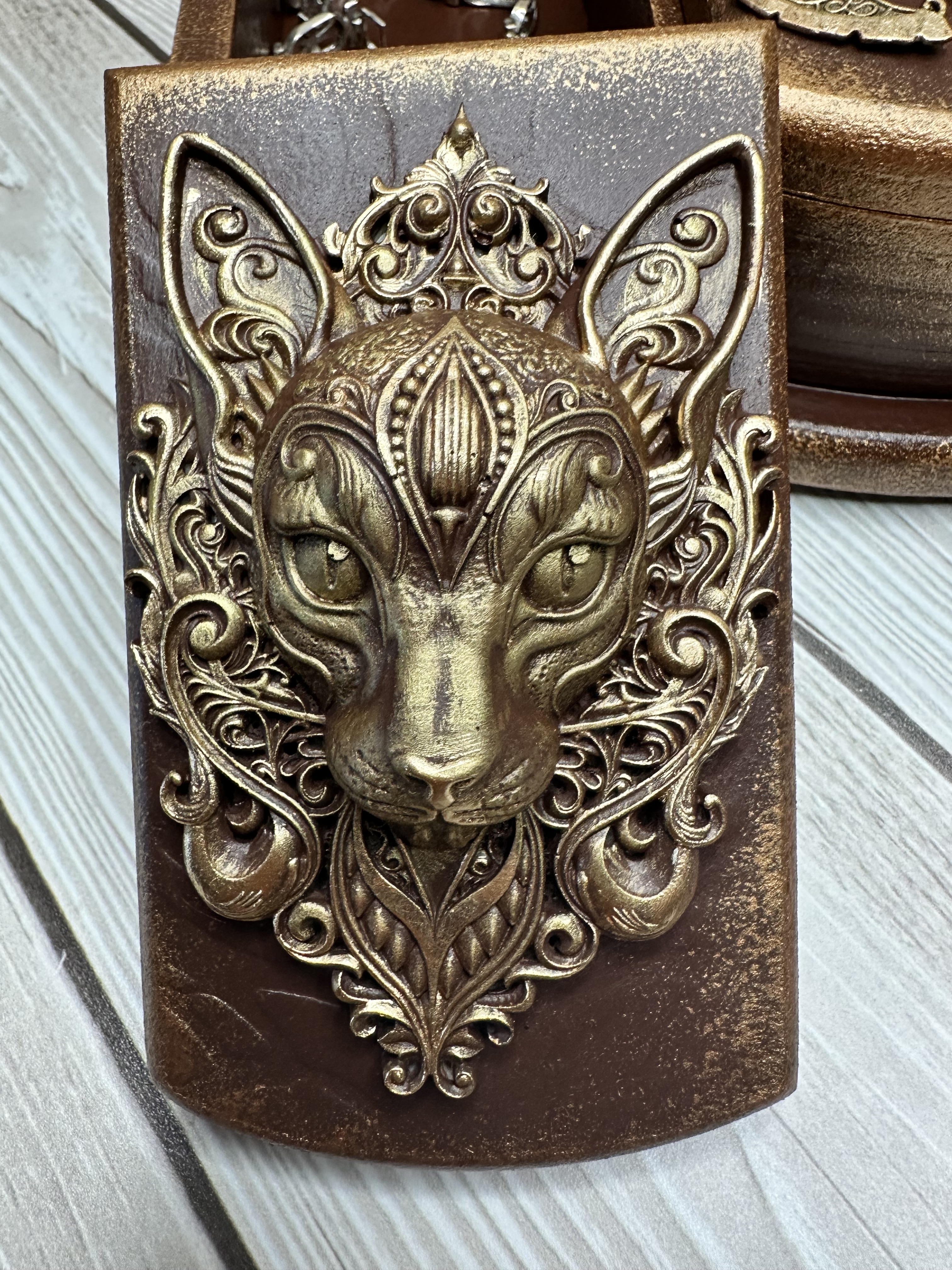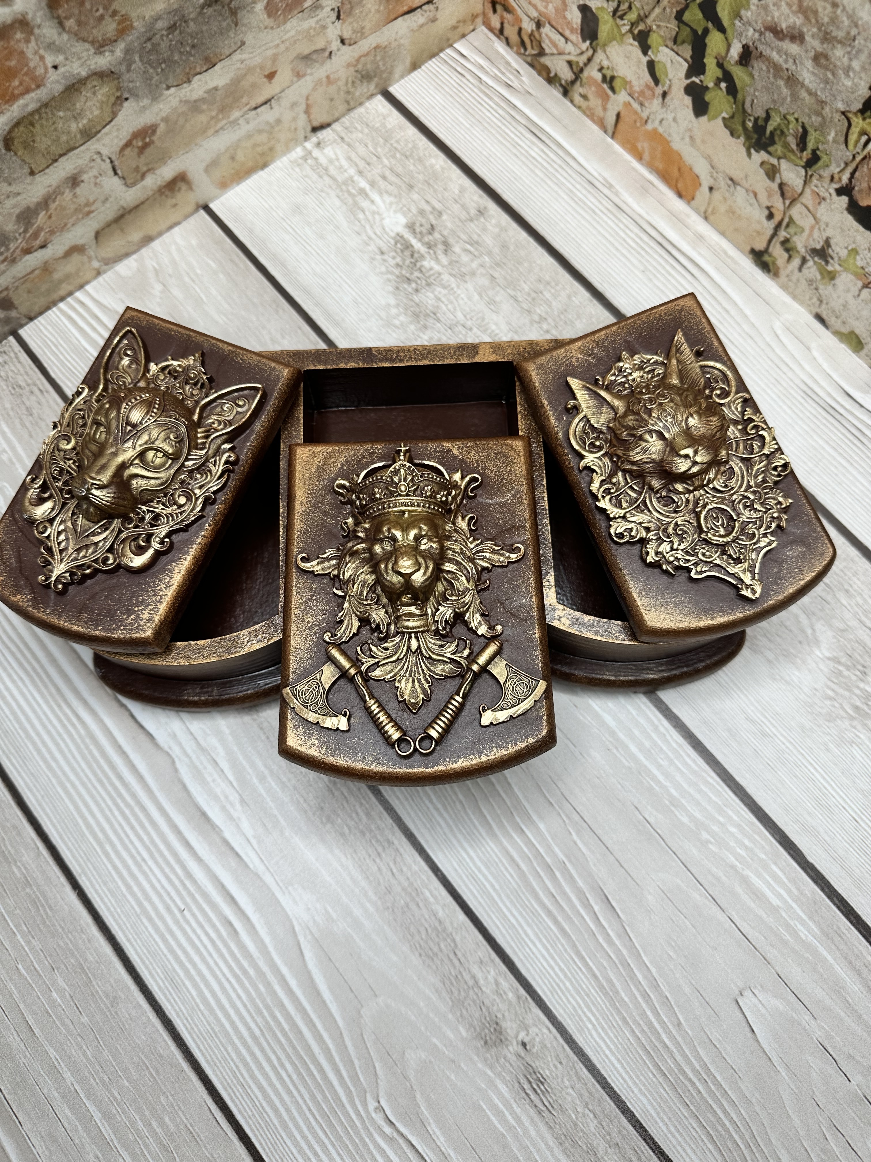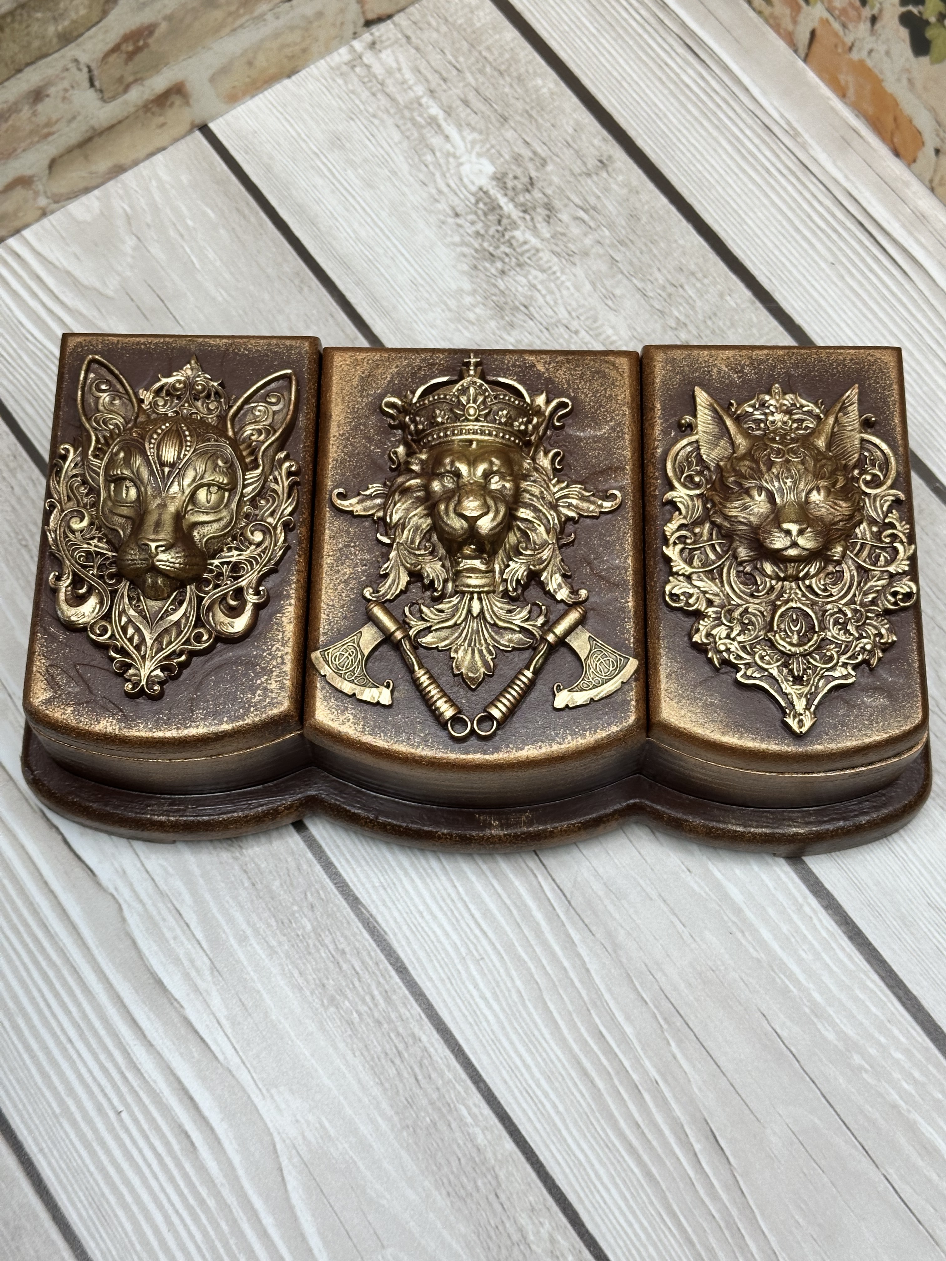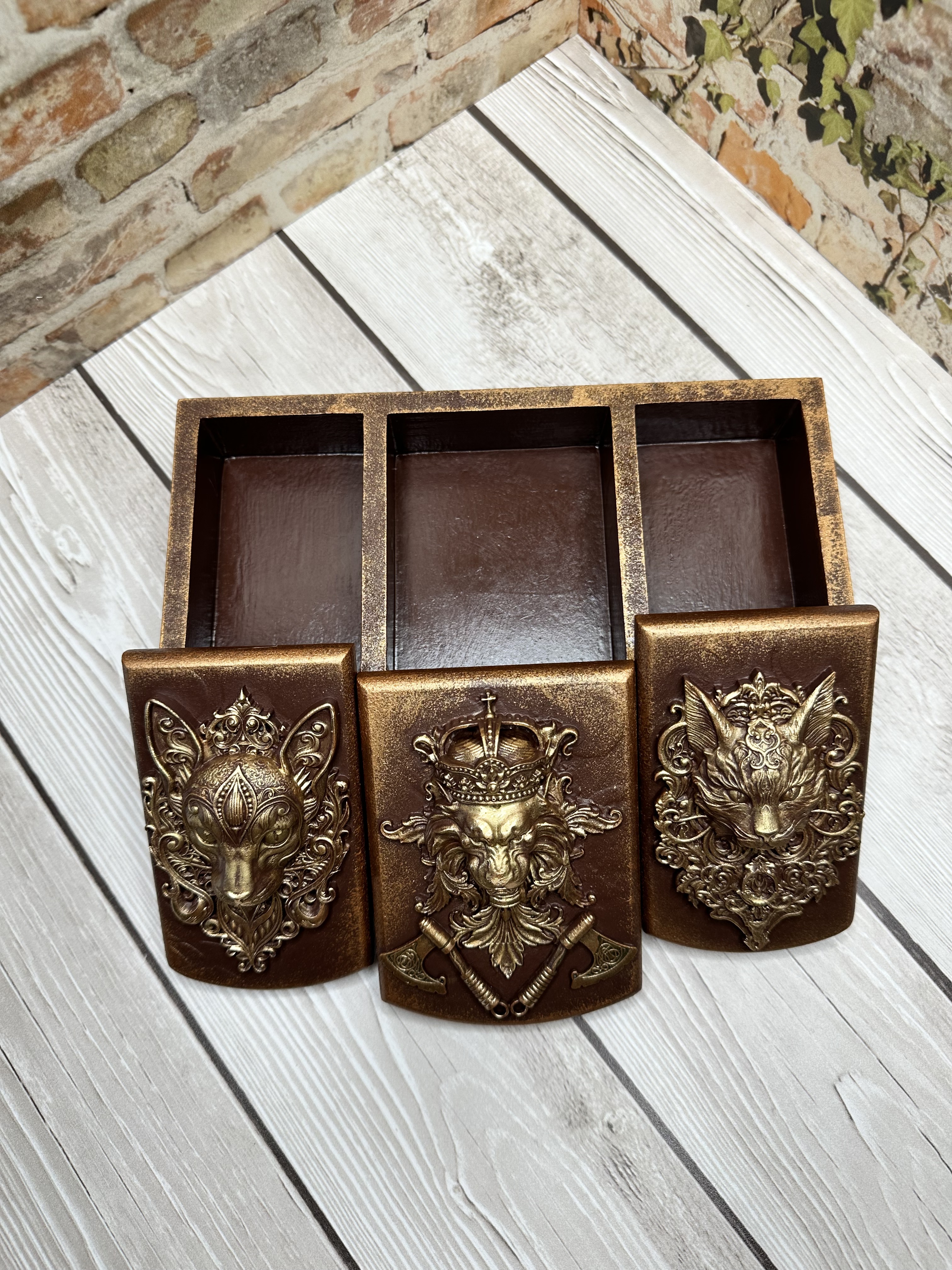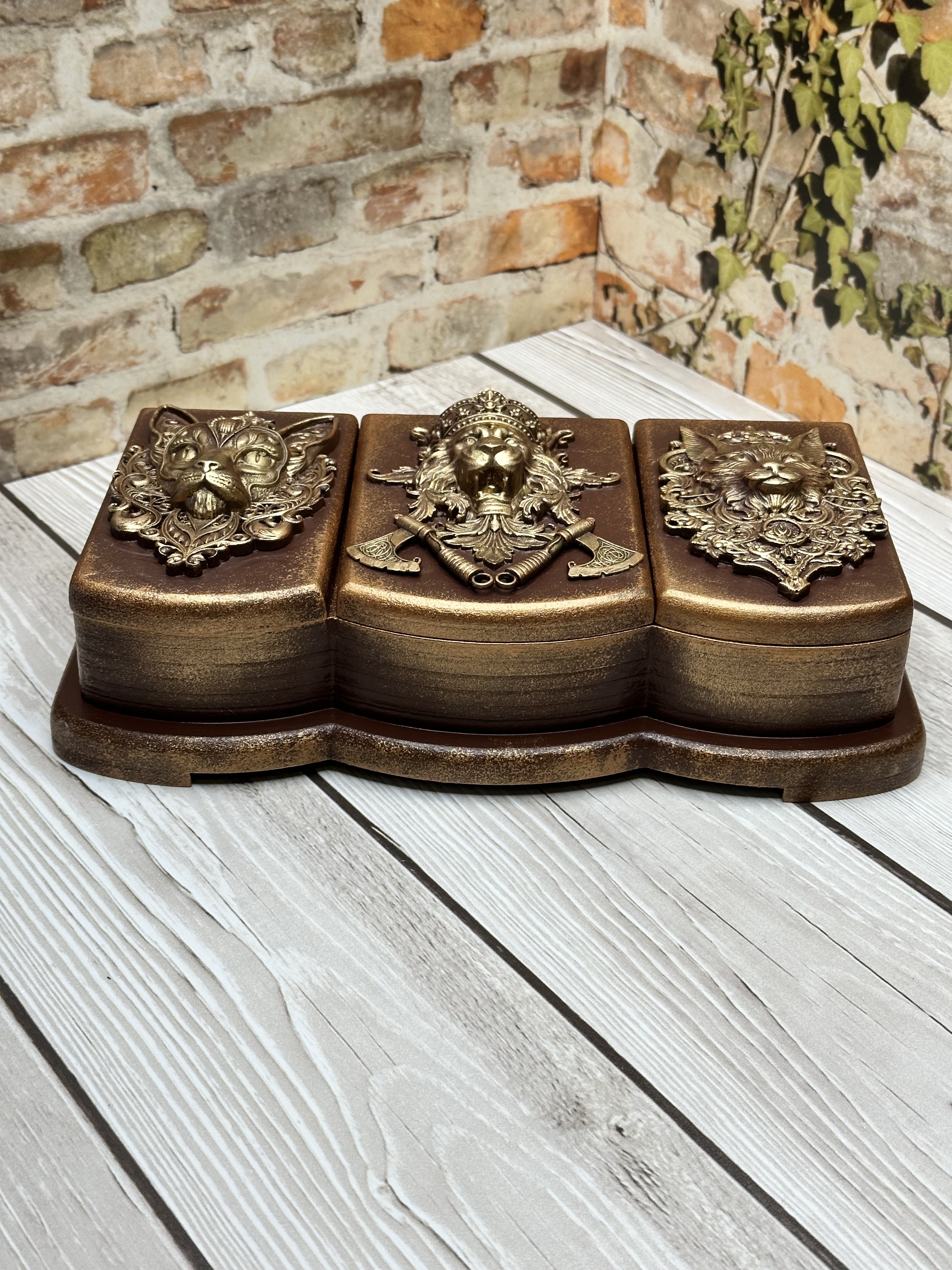 Брутальная шкатулка, разделённая на три секции, изготовлена из натурального МДФ и украшена декоративными элементами в технике Mix Media. Моделирующая паста, художественные воски и акриловые краски создают неповторимый дизайн, который украсит любой интерьер и поможет аккуратно хранить украшения, аксессуары и мелкие предметы. Идеально подойдёт девушкам и женщинам, предпочитающим уникальные вещи, способные подчеркнуть индивидуальность пространства. Создайте уютную обстановку вокруг себя и подарите себе радость от обладания эксклюзивной вещью.