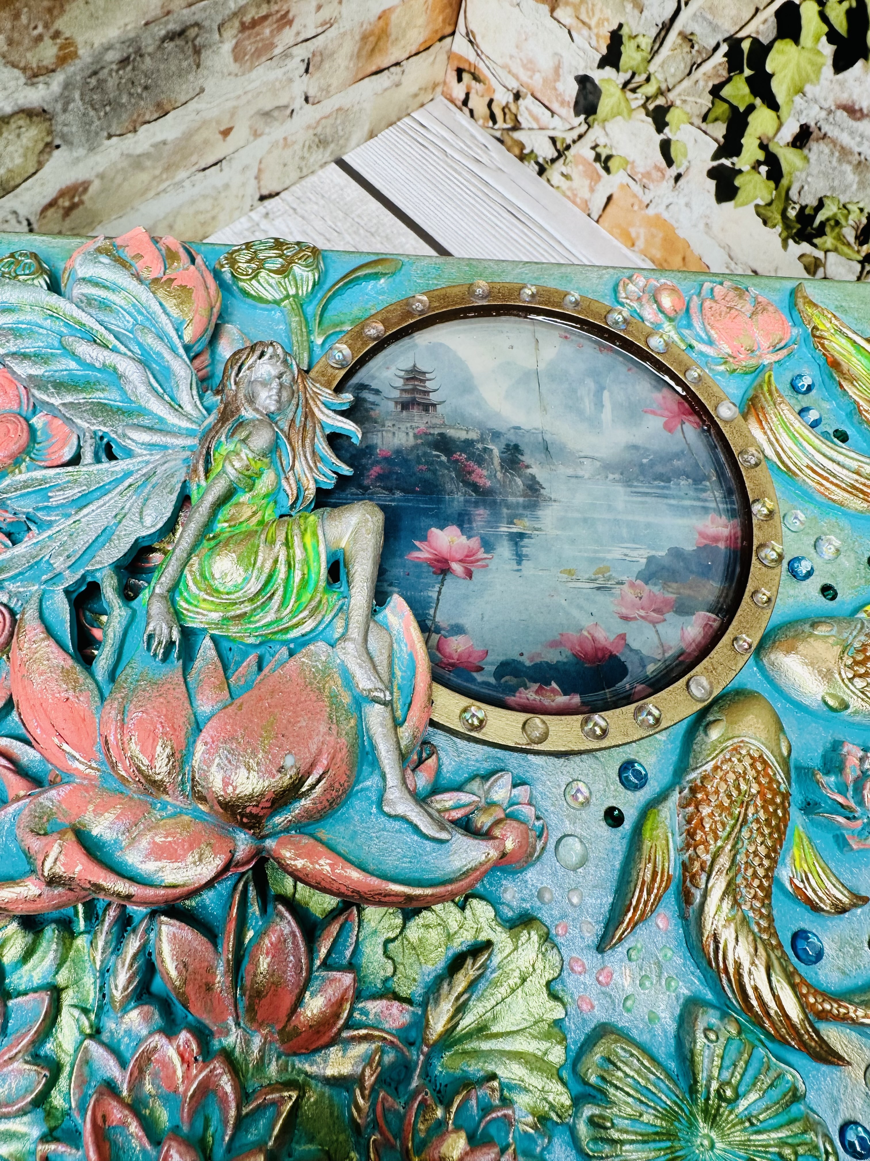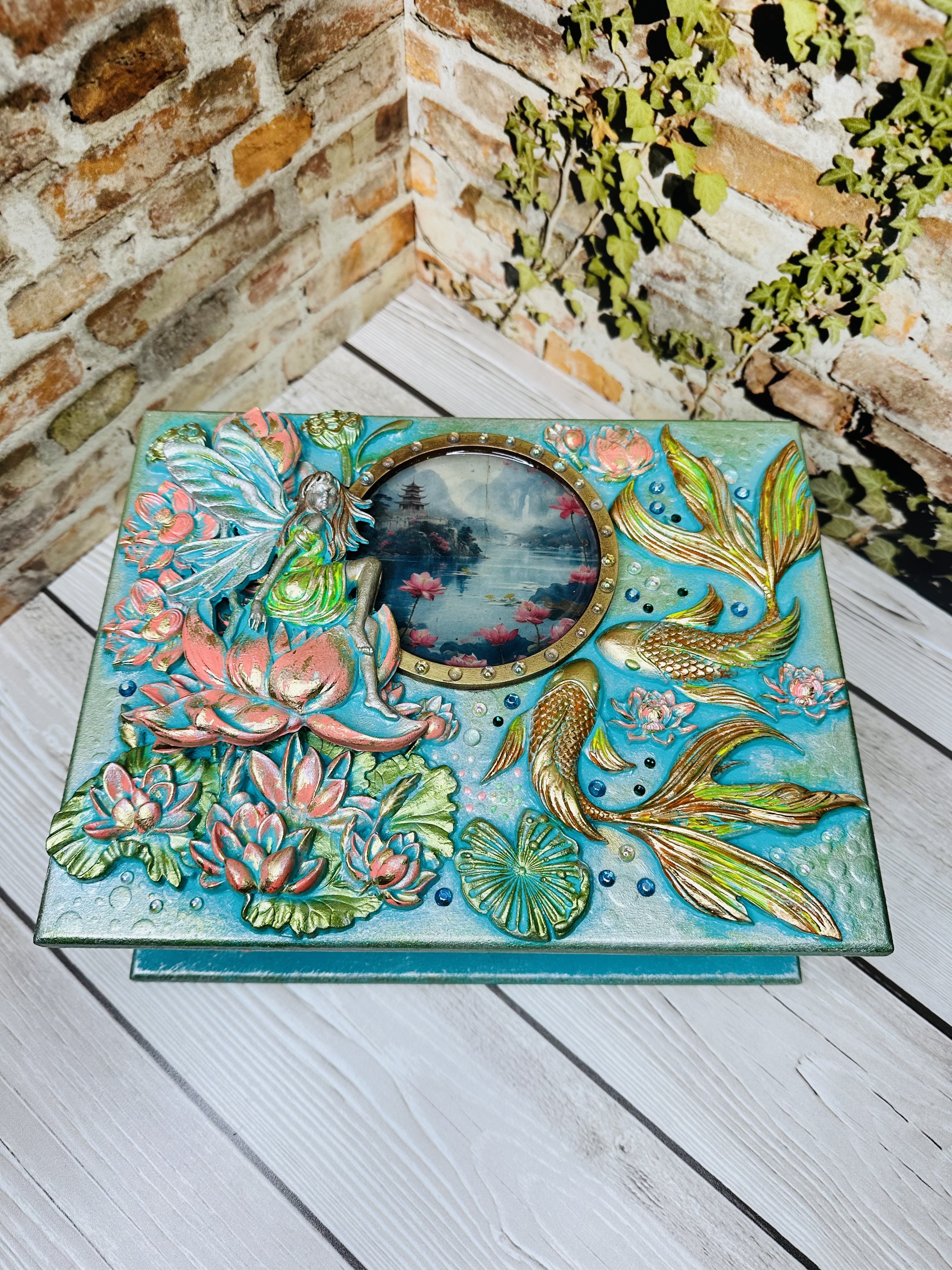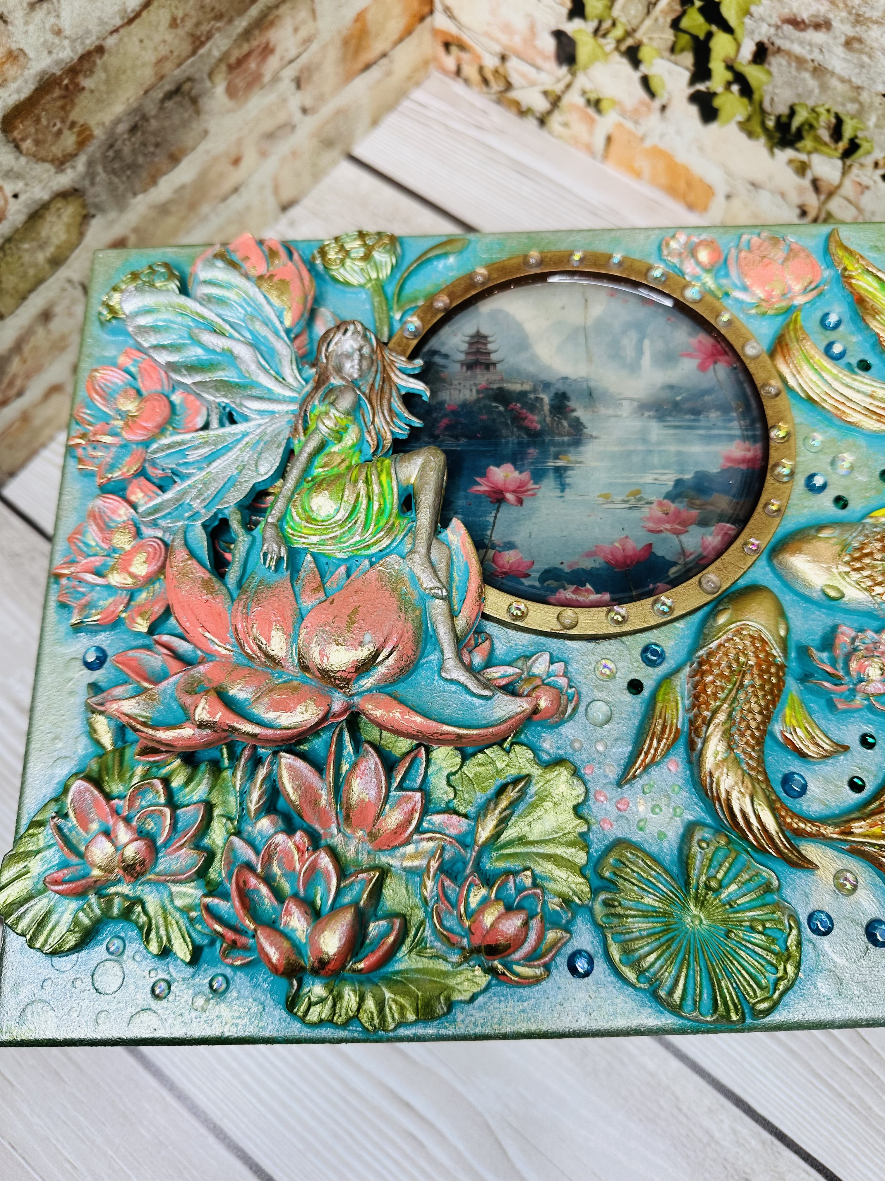 Эта эксклюзивная шкатулка создана вручную в технике Mix Media из натурального МДФ, дополнена декоративными элементами, такими как природные ракушки, моделирующая паста, художественный воск и акриловая краска. Прекрасное решение для бережного хранения ювелирных украшений, личных мелочей и сувениров.Хотите создать уютную обстановку и подарить себе или близким частичку сказочной атмосферы? Шкатулка "Фея на лотосе" привнесёт гармонию и красоту в ваш дом, став оригинальным аксессуаром интерьера и практичным решением для организации личного пространства.