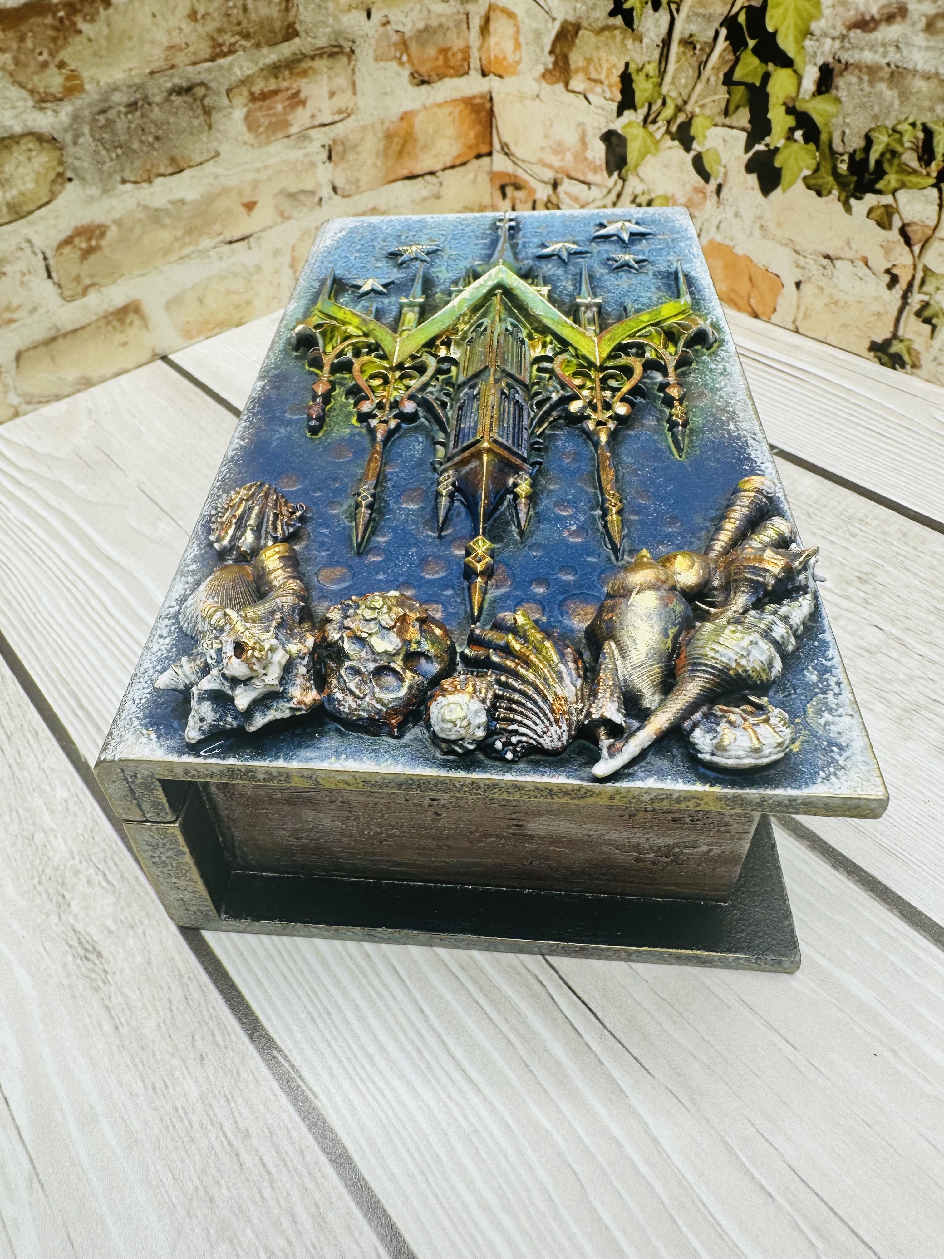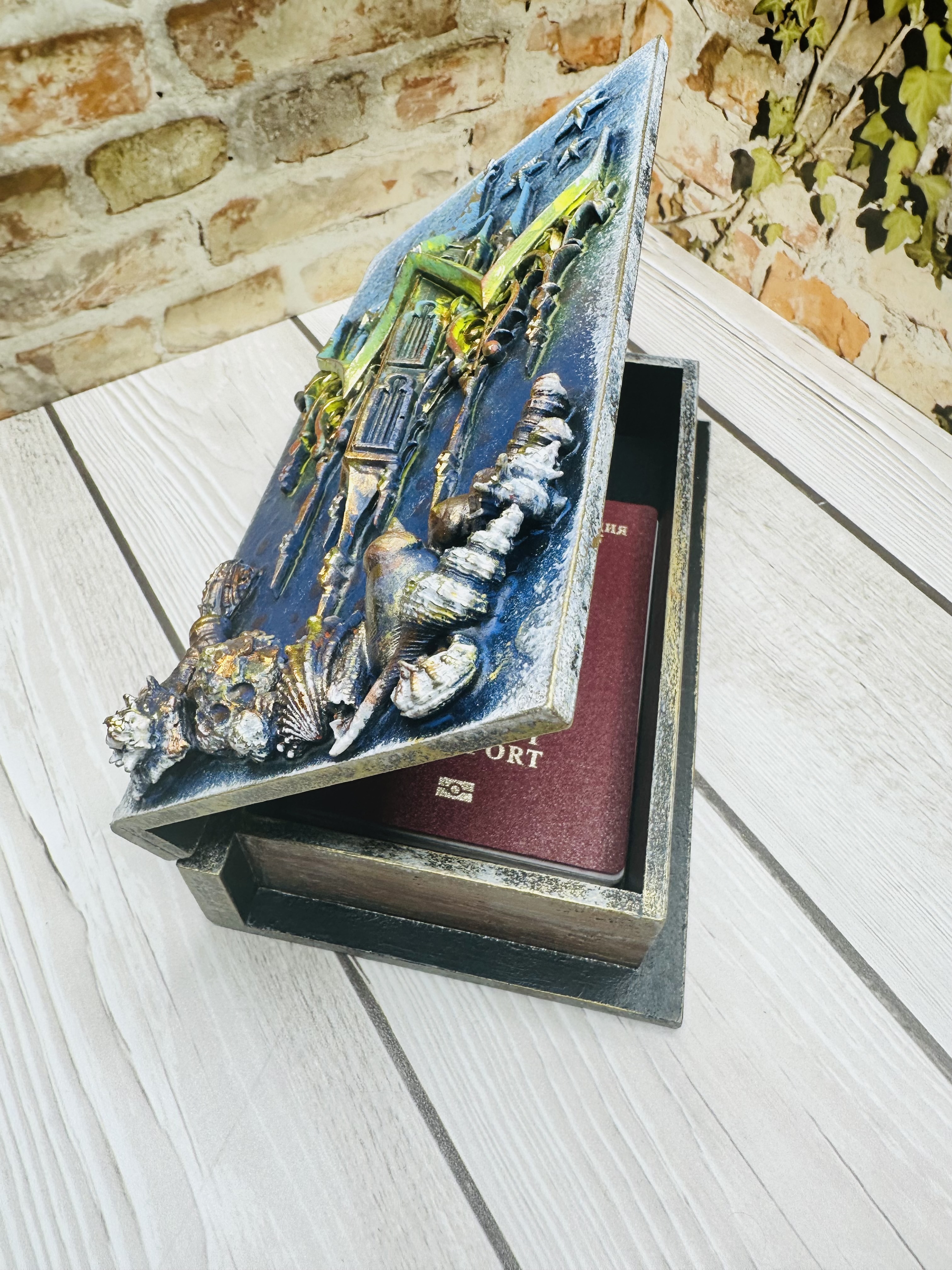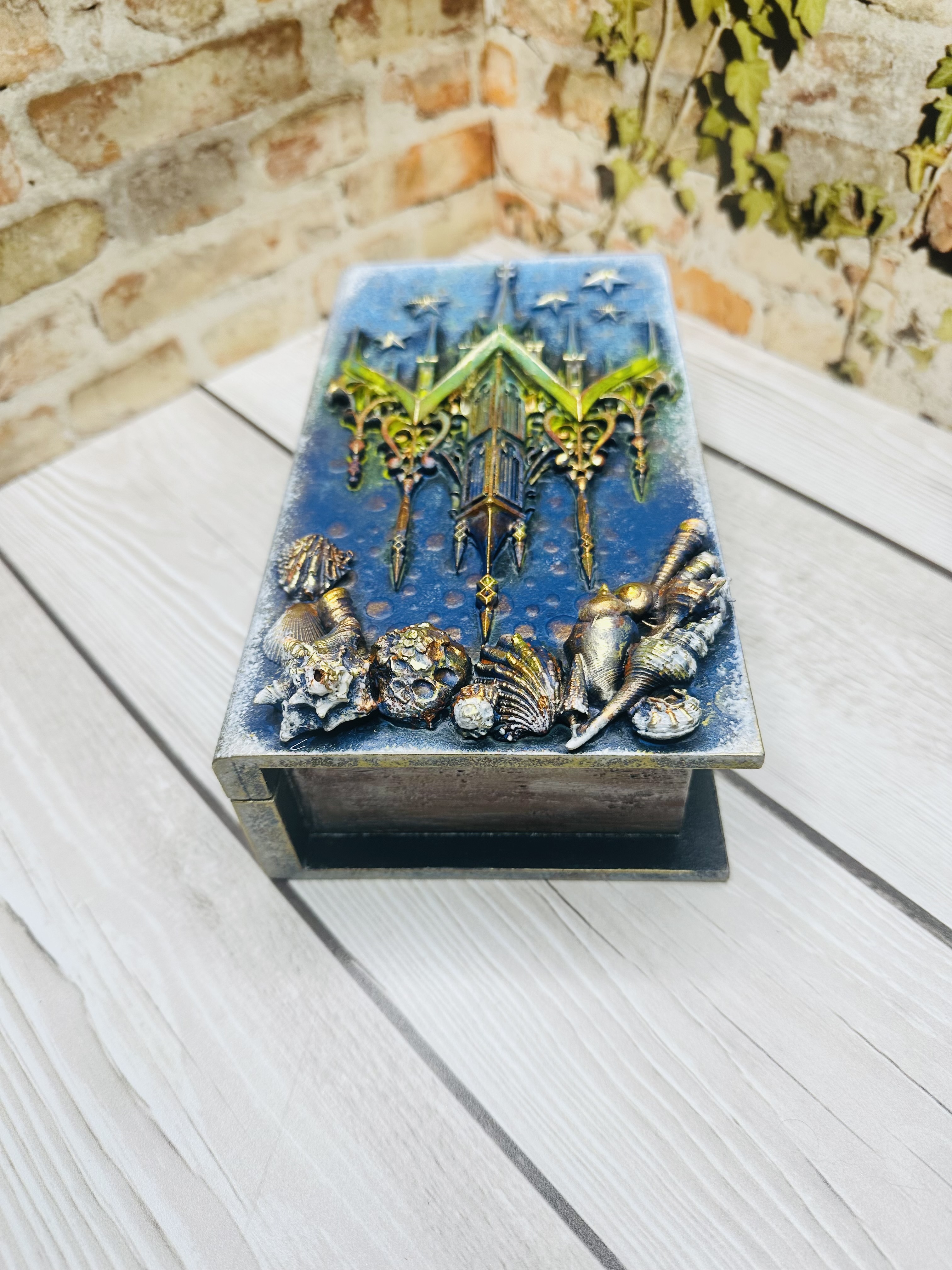 Эксклюзивная шкатулка ручной работы в оригинальном дизайне Mix Media. В форме книги с живописной композицией подводных глубин и небесных просторов. Материал — экологичный МДФ, декорирован натуральной моделью из ракушек, художественной пастой, воском и акриловыми красками. Надежное хранение ювелирных изделий, сувениров и ценных мелочей. Прекрасный подарок для женщин, стремящихся подчеркнуть индивидуальность своего пространства. Добавьте нотки волшебства и стиля вашему интерьеру вместе с шкатулкой "Айсберг".