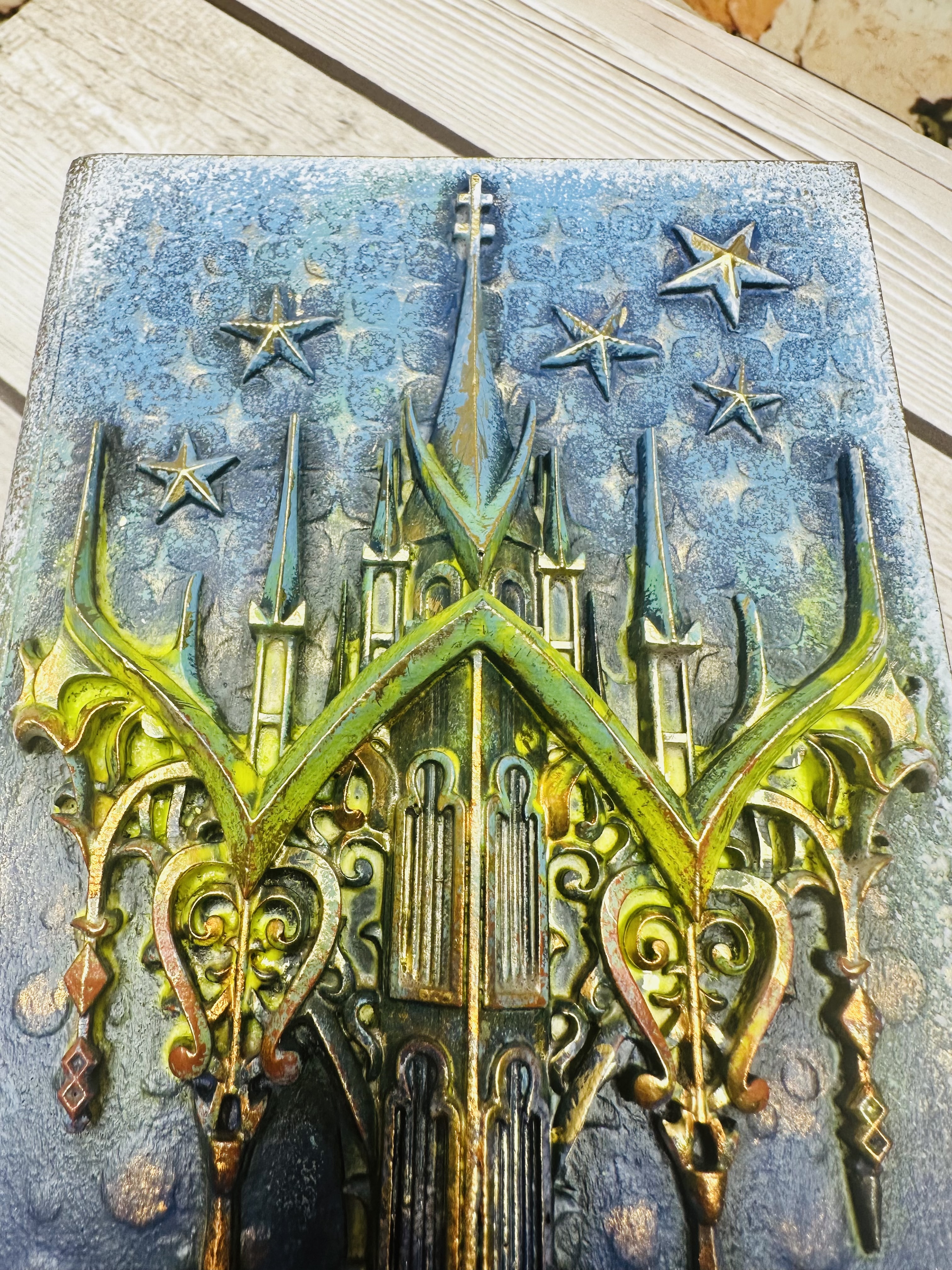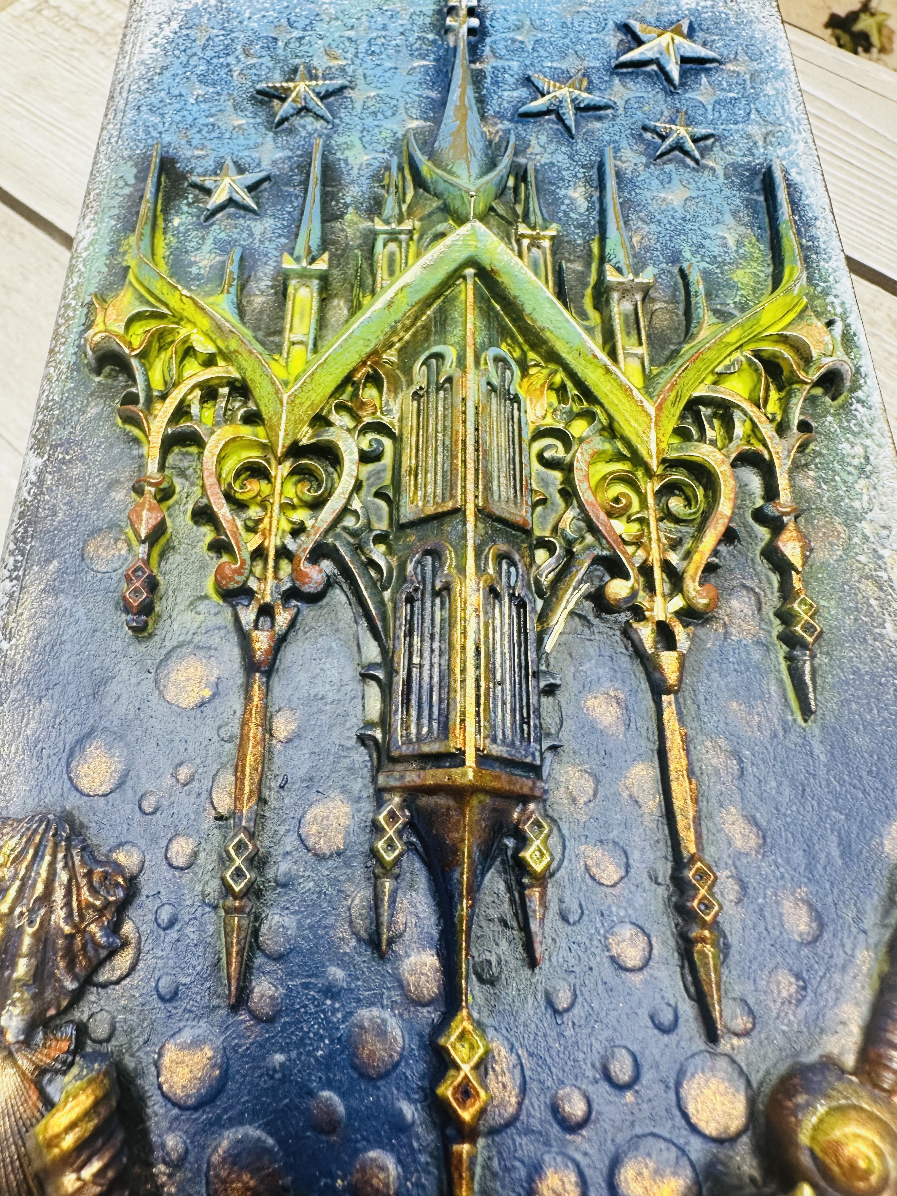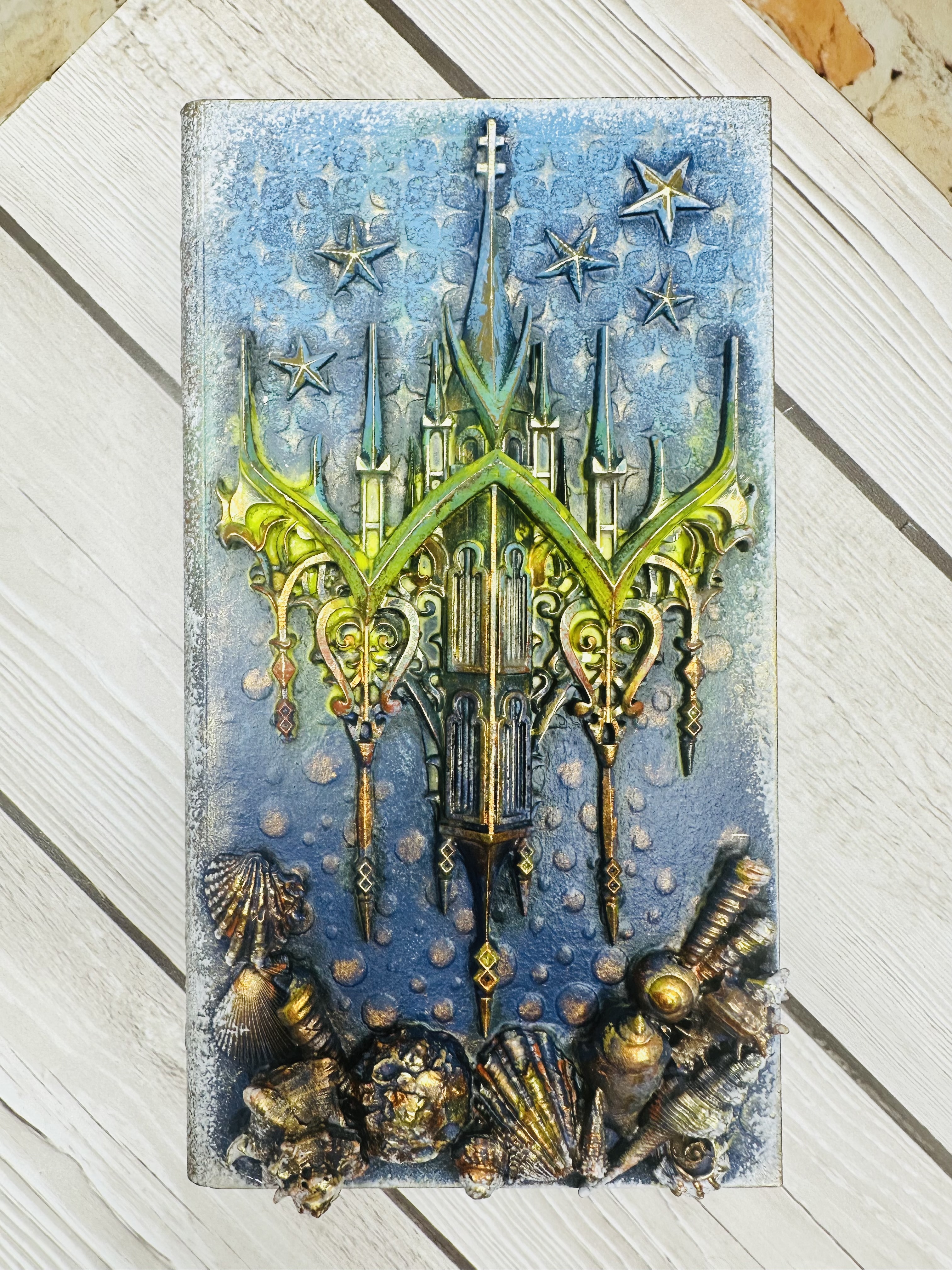 Эксклюзивная шкатулка ручной работы в оригинальном дизайне Mix Media. В форме книги с живописной композицией подводных глубин и небесных просторов. Материал — экологичный МДФ, декорирован натуральной моделью из ракушек, художественной пастой, воском и акриловыми красками. Надежное хранение ювелирных изделий, сувениров и ценных мелочей. Прекрасный подарок для женщин, стремящихся подчеркнуть индивидуальность своего пространства. Добавьте нотки волшебства и стиля вашему интерьеру вместе с шкатулкой "Айсберг".