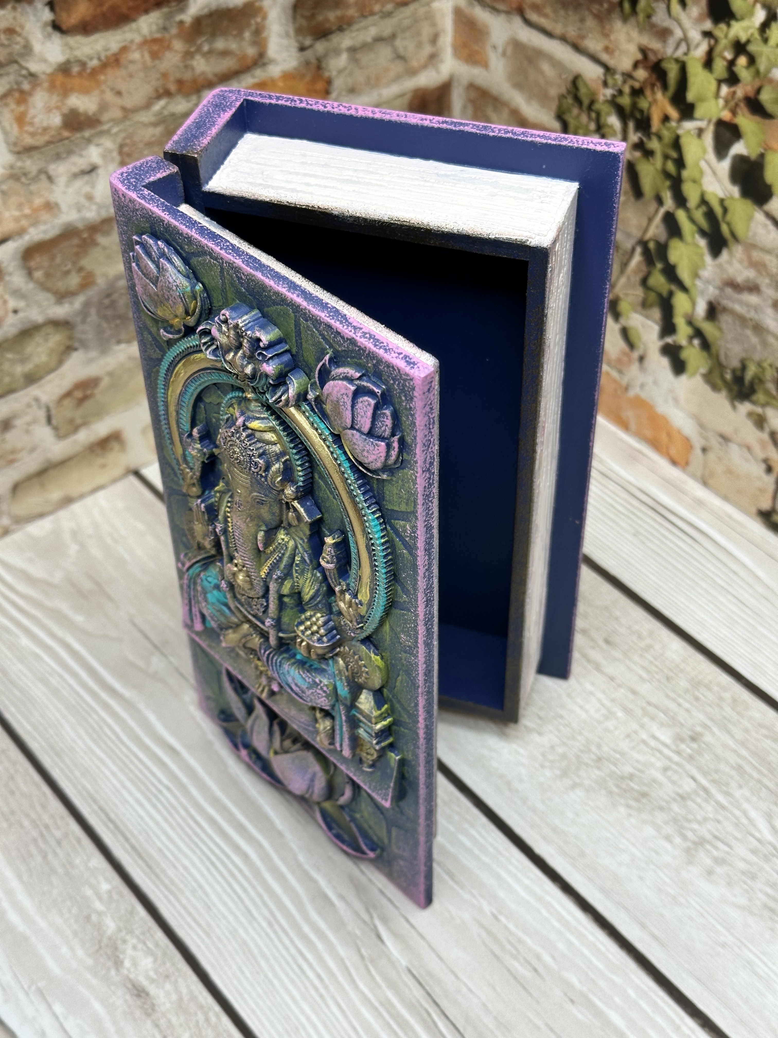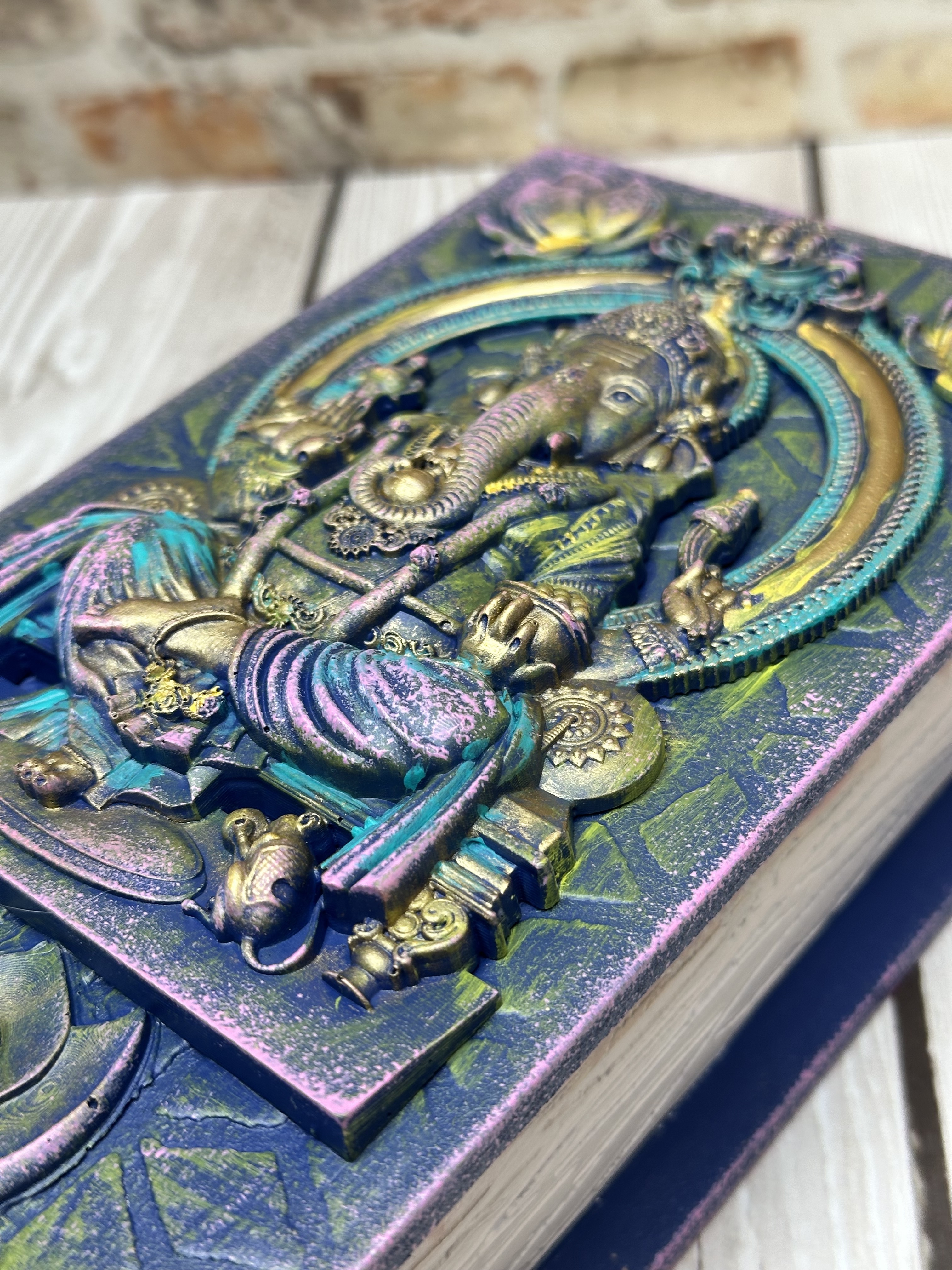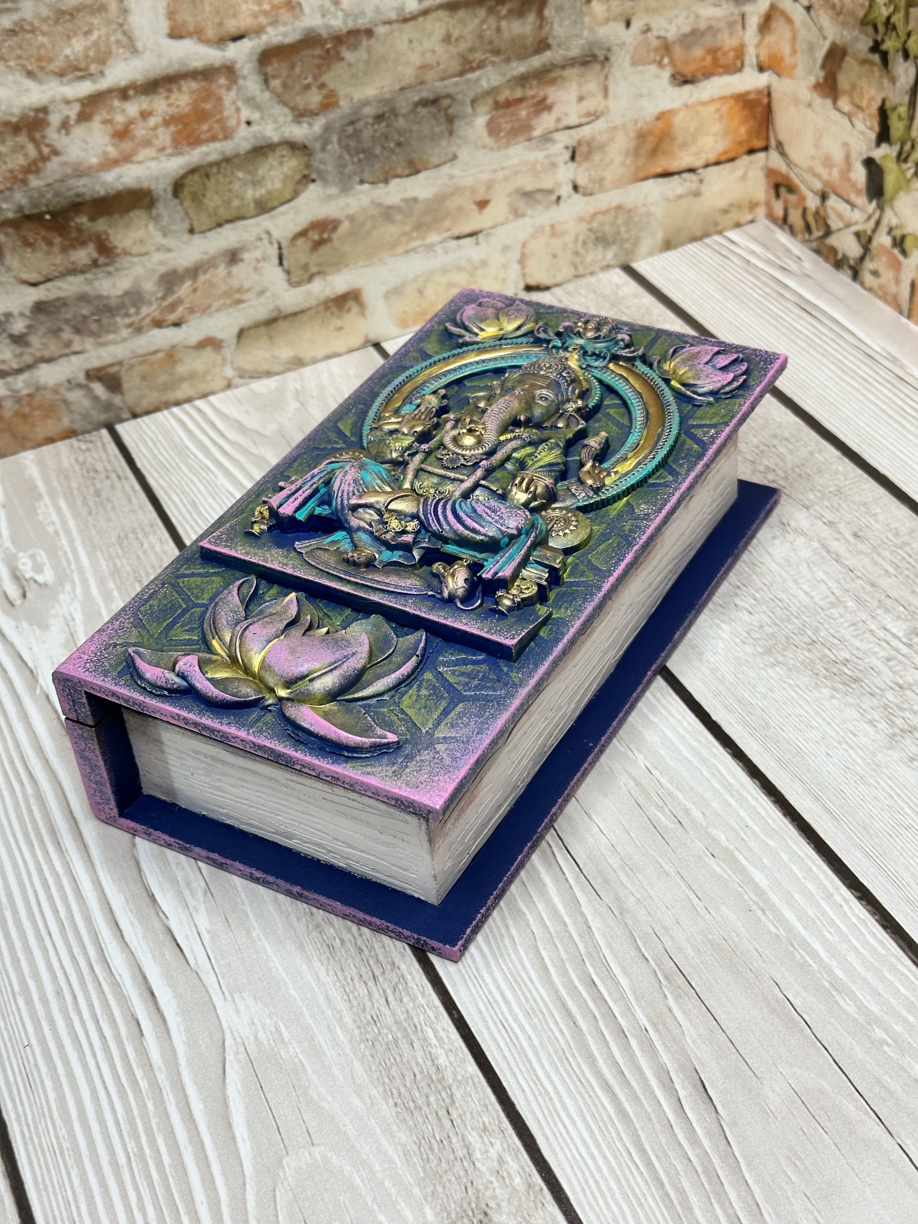 Уникальная шкатулка ручной работы в форме книги. На крышке шкатулки изображен индийский бог Ганеша, известный как покровитель мудрости, успеха и устранения препятствий. Этот символический образ выполнен с особой тщательностью и детализацией, что придает изделию особую ценность и значимость. Шкатулка выполнена из экологичного МДФ и оформлена в технике Mix Media с применением декоративных элементов, моделирующей пасты, художественных восков и акриловых красок. Прекрасное решение для аккуратного хранения украшений, ценных мелочей и памятных предметов. Добавляет особую атмосферу и эстетическое удовольствие любому интерьеру. Подчеркнет ваше чувство стиля и станет отличным выбором подарка для близких.