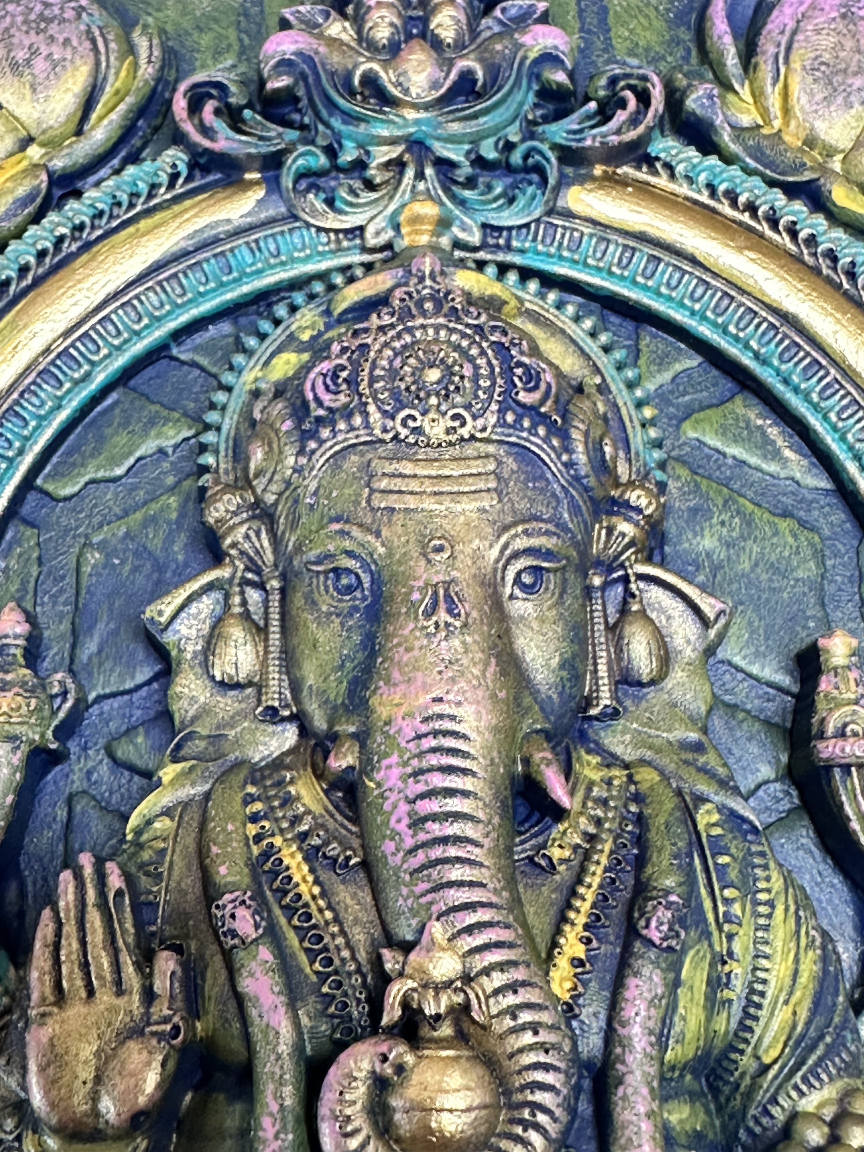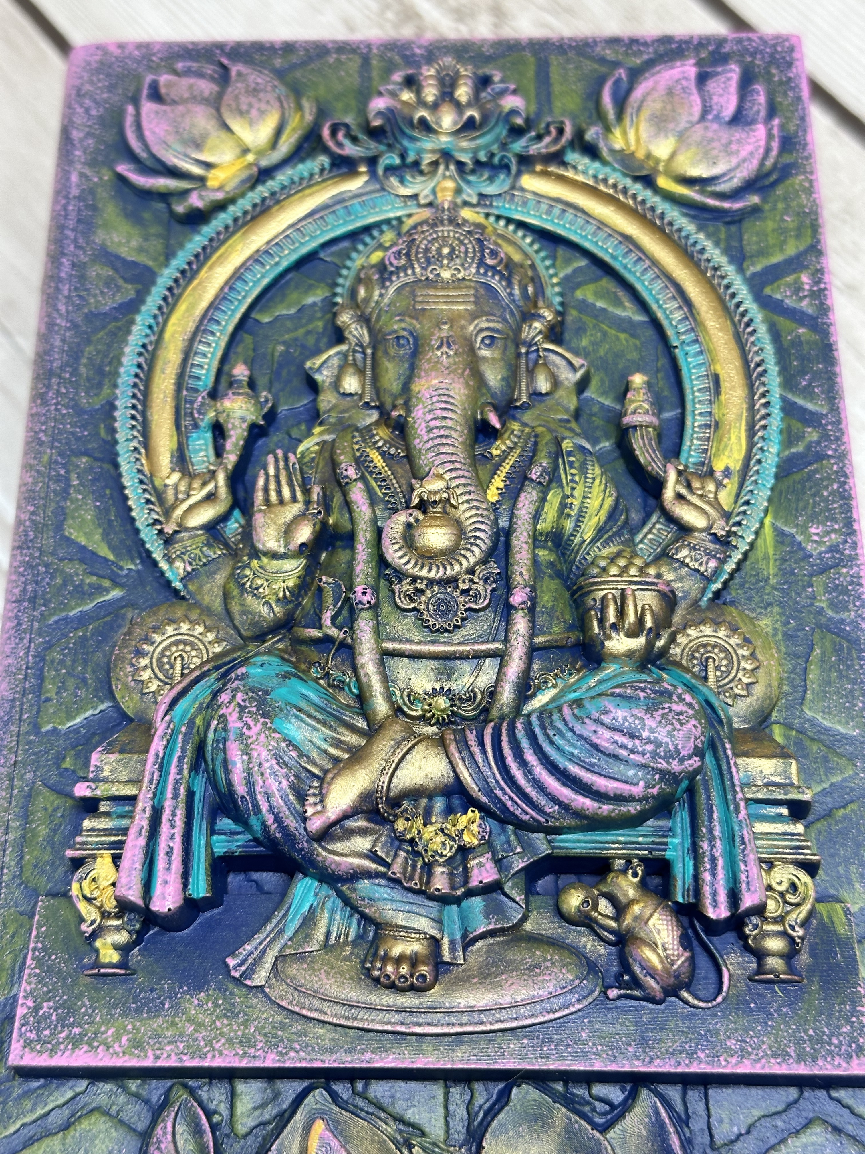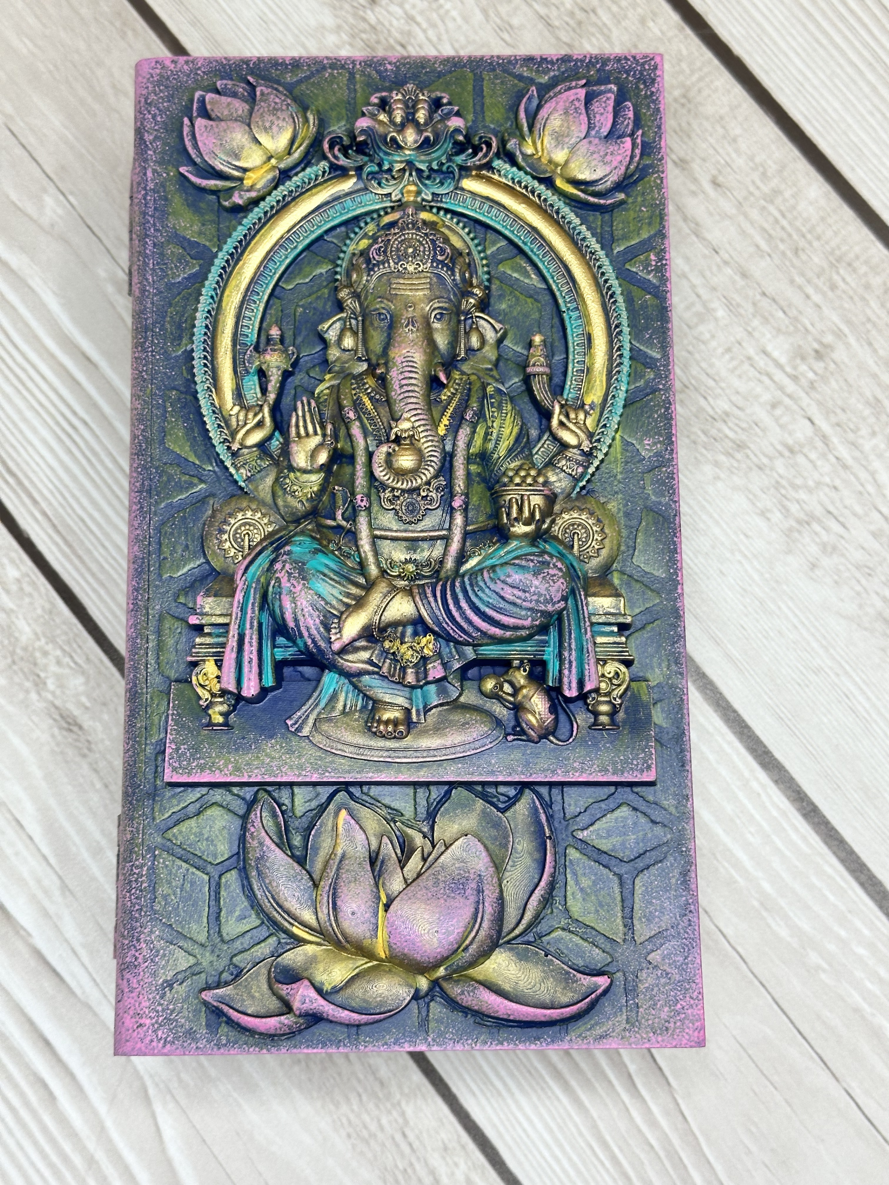 Уникальная шкатулка ручной работы в форме книги. На крышке шкатулки изображен индийский бог Ганеша, известный как покровитель мудрости, успеха и устранения препятствий. Этот символический образ выполнен с особой тщательностью и детализацией, что придает изделию особую ценность и значимость. Шкатулка выполнена из экологичного МДФ и оформлена в технике Mix Media с применением декоративных элементов, моделирующей пасты, художественных восков и акриловых красок. Прекрасное решение для аккуратного хранения украшений, ценных мелочей и памятных предметов. Добавляет особую атмосферу и эстетическое удовольствие любому интерьеру. Подчеркнет ваше чувство стиля и станет отличным выбором подарка для близких.
