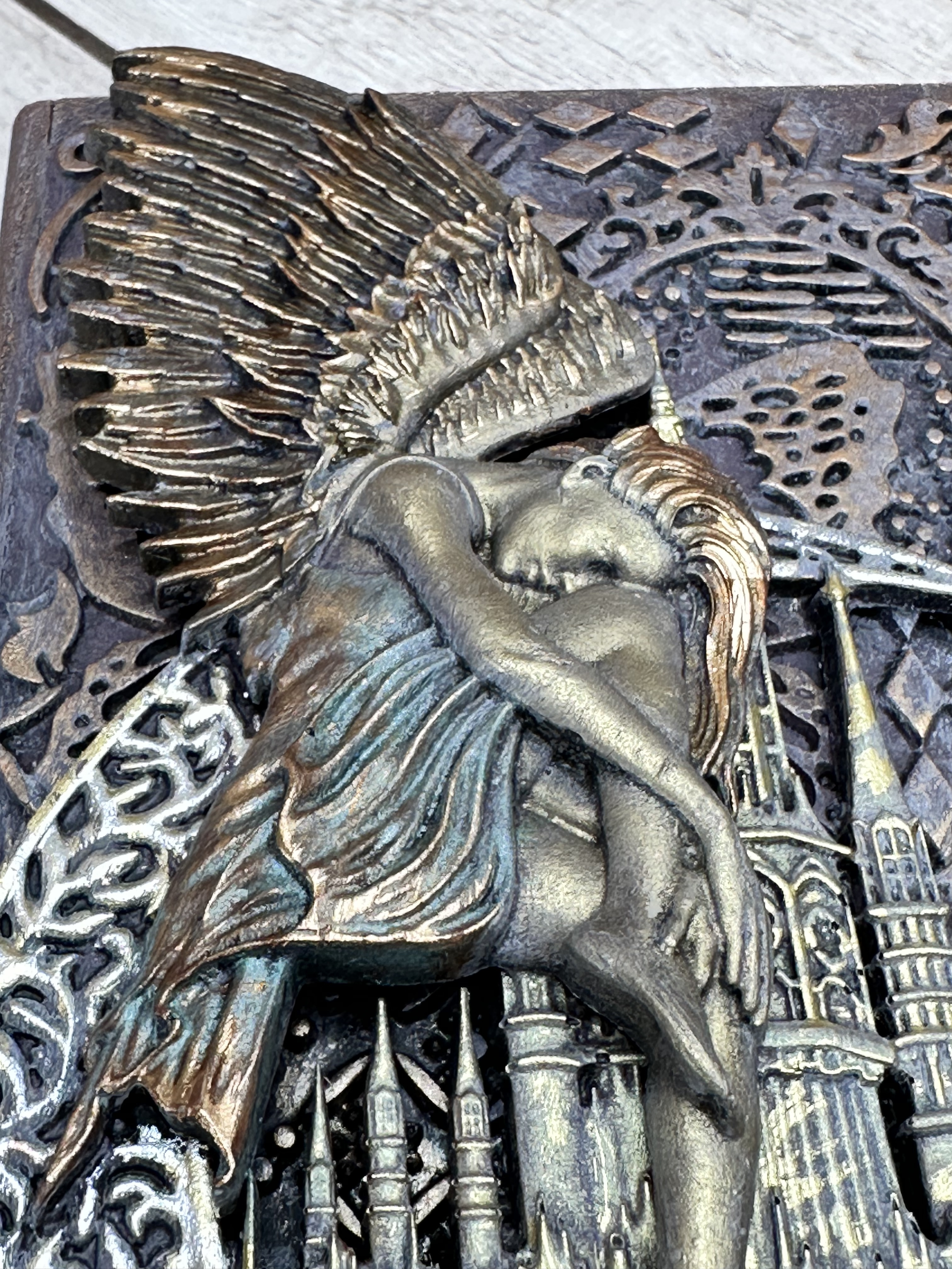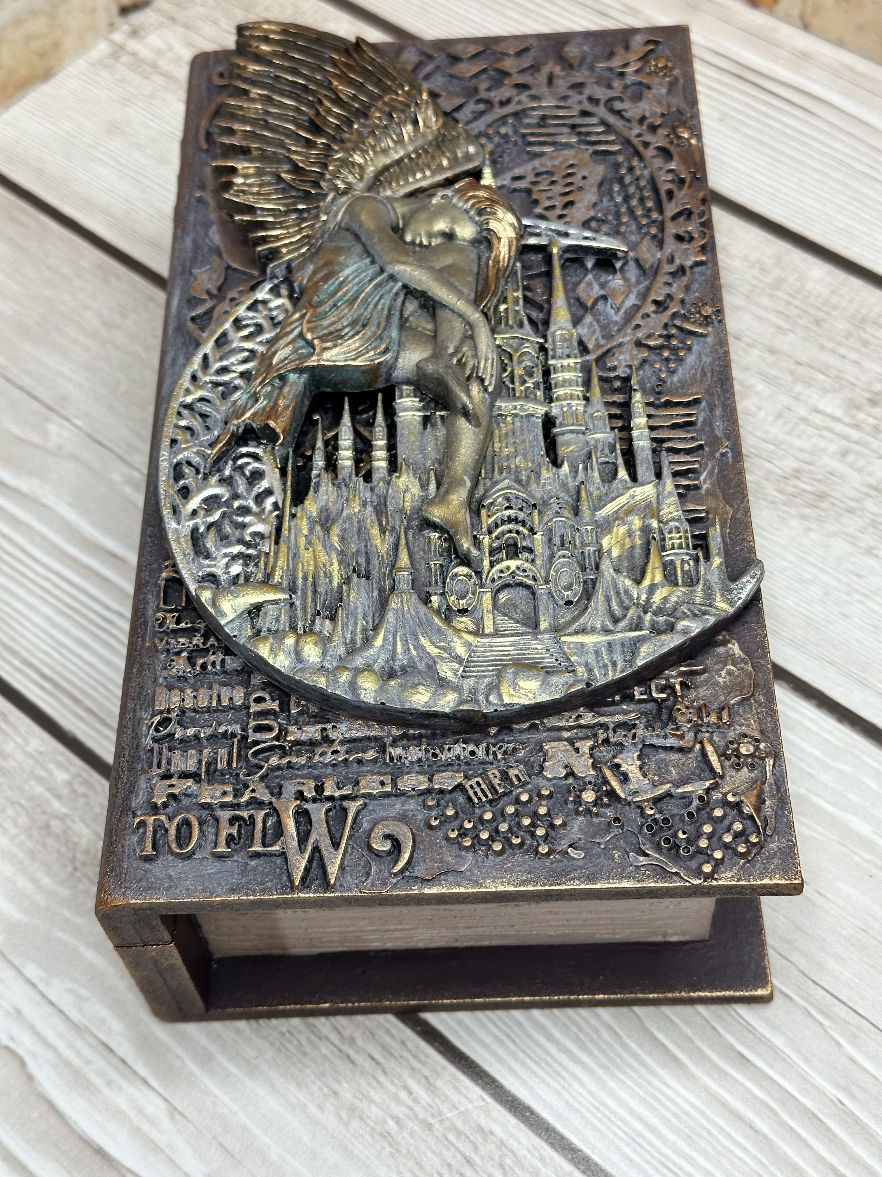 Оригинальная шкатулка в форме книги, созданная вручную в уникальной технике Mix Media. Она изготовлена из качественного МДФ и украшена деталями из моделирующей пасты, отливок из пластика, художественных восков и акриловых красок. Отличается утончённым дизайном и способна стать украшением интерьера любого дома. Идеально подойдёт для хранения украшений, драгоценных мелочей или милых сердцу сувениров. Станьте обладательницей уникального аксессуара, который подчеркнёт ваш вкус и создаст особенную атмосферу в вашем пространстве. Захотите привнести больше индивидуальности в обстановку своего жилища?