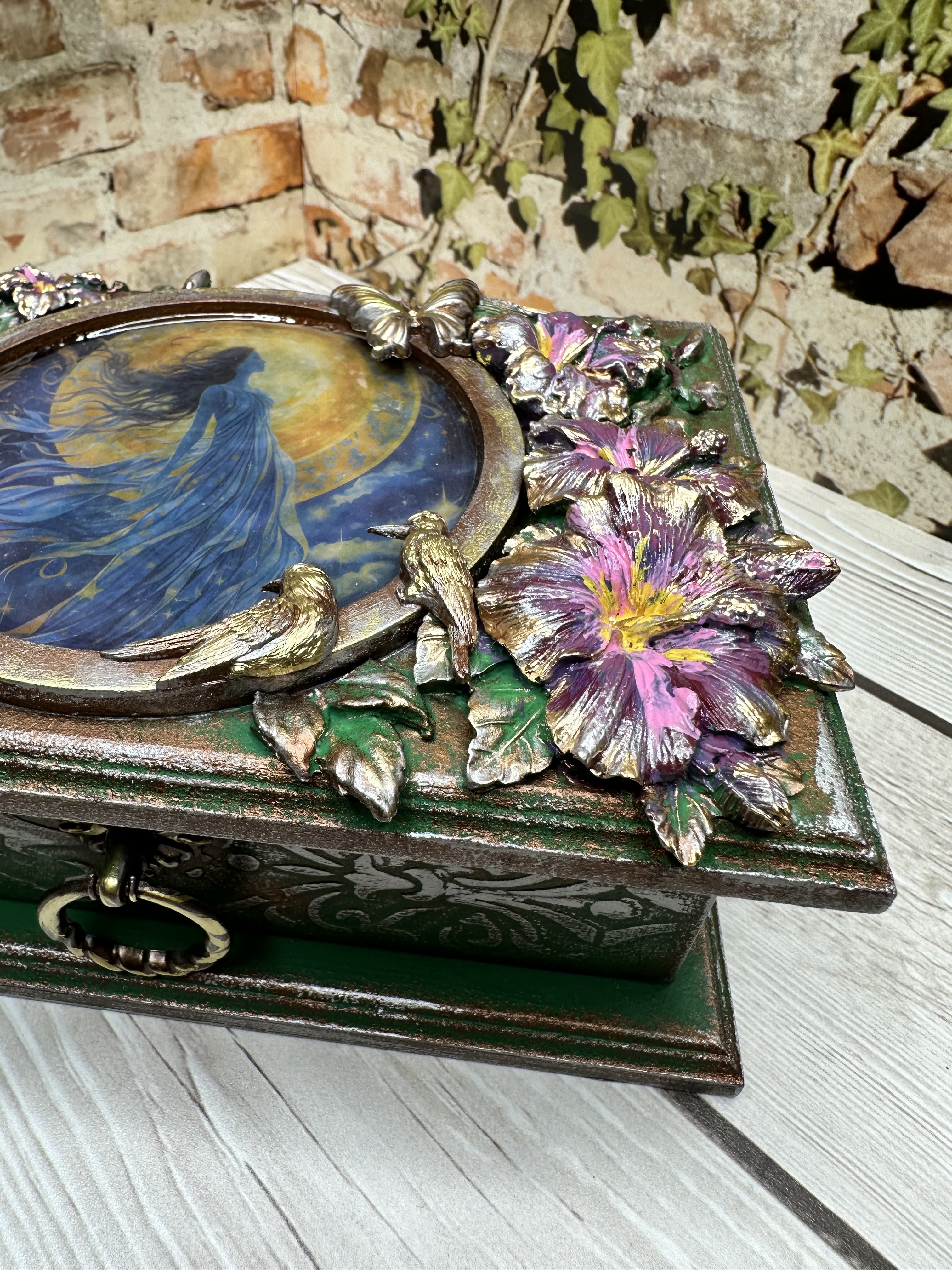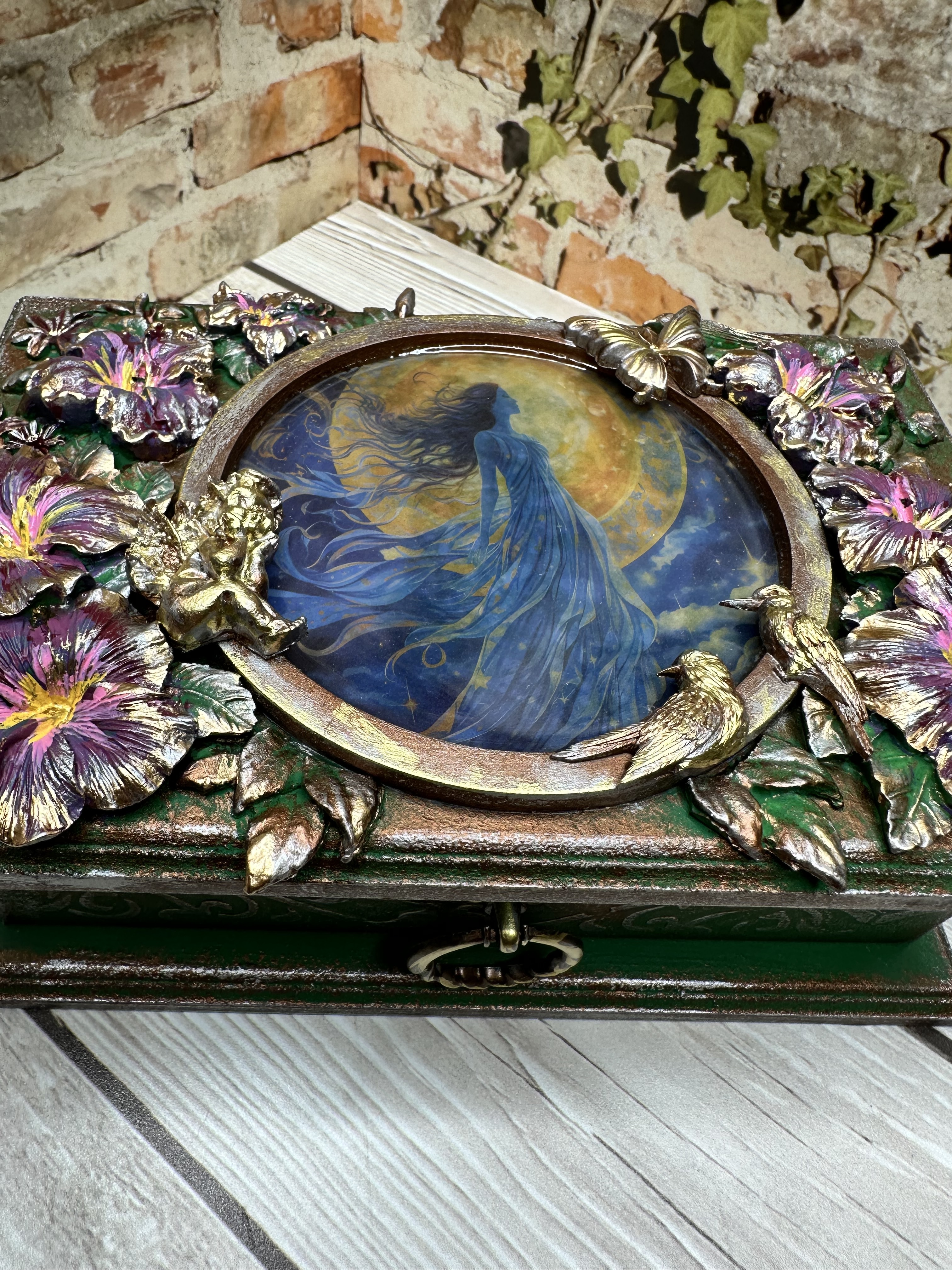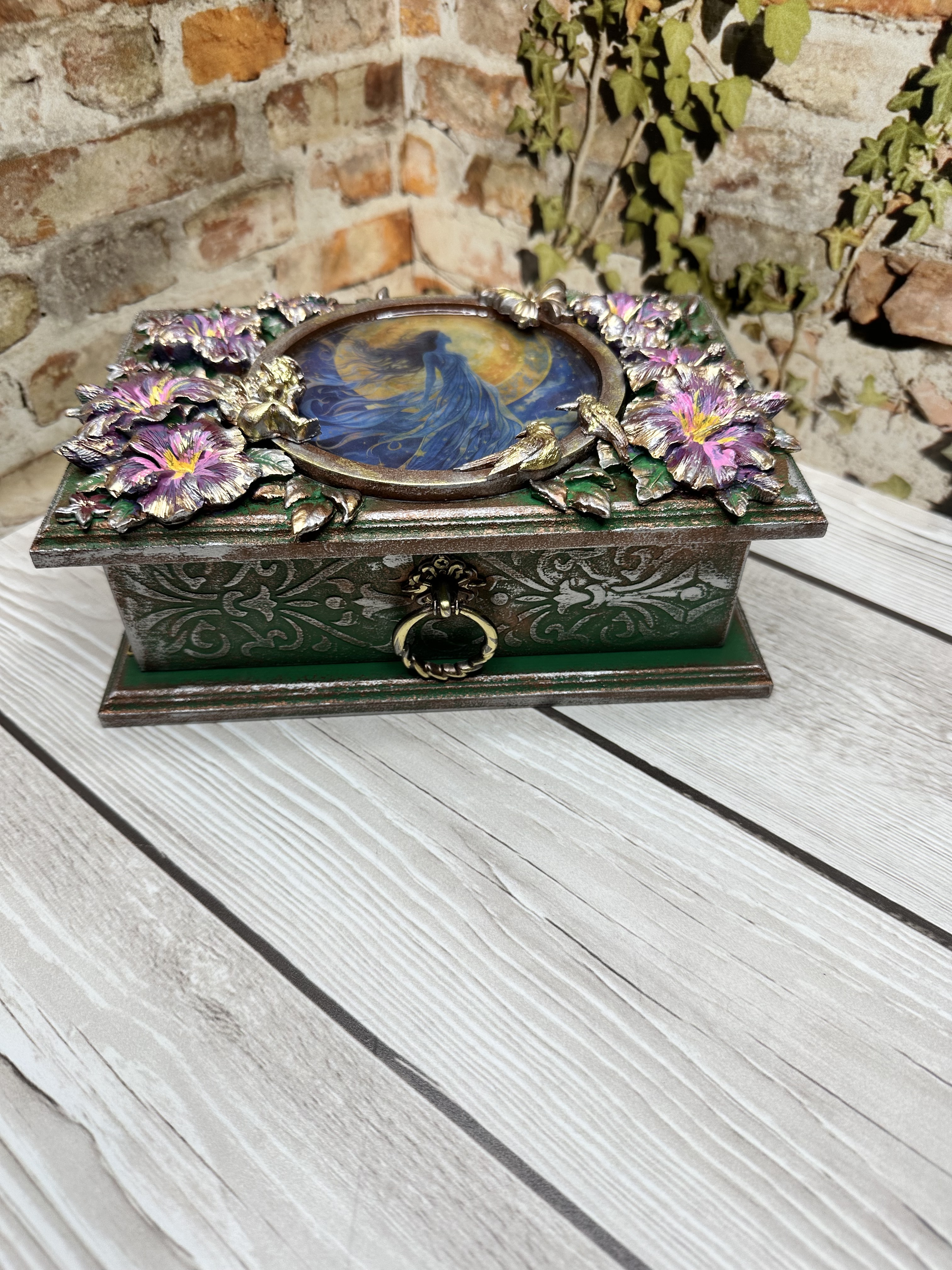 Очаровательная шкатулка ручной работы, созданная в нежном романтическом стиле. Вдохновлённая образом прекрасной девушки на фоне луны и ангела среди цветов, она изготовлена из натурального МДФ с использованием моделирующей пасты, декоративных элементов и ярких акриловых красок. Это идеальное место для бережного хранения ваших любимых украшений и ценных мелочей. Эта уникальная вещь станет прекрасным дополнением домашнего декора, привнесёт уют и очарование в любой интерьер. Она идеально подойдёт девушкам и женщинам, ценящим красоту и оригинальность. Дарите близким людям тепло и внимание вместе с этой очаровательной шкатулкой.