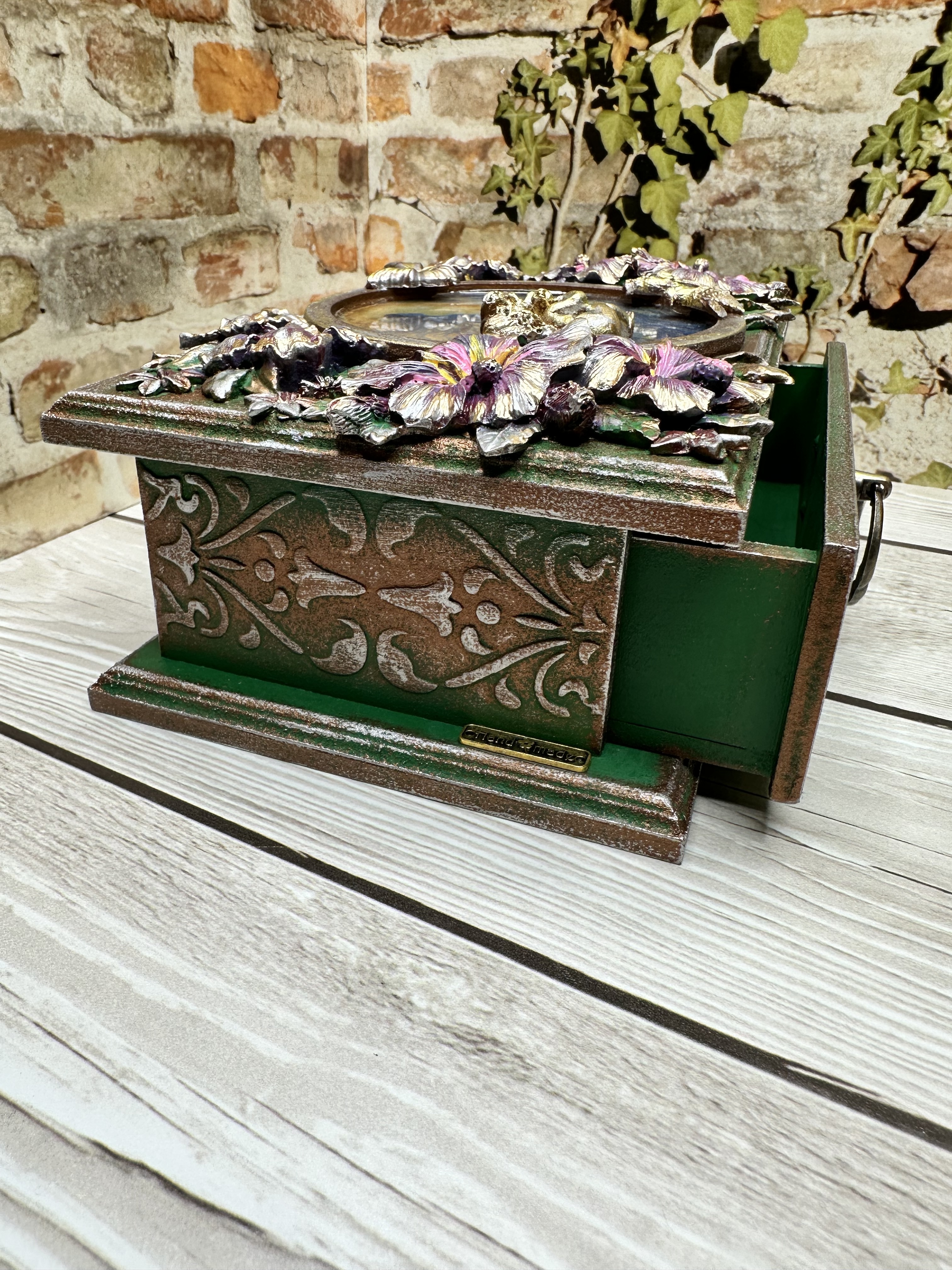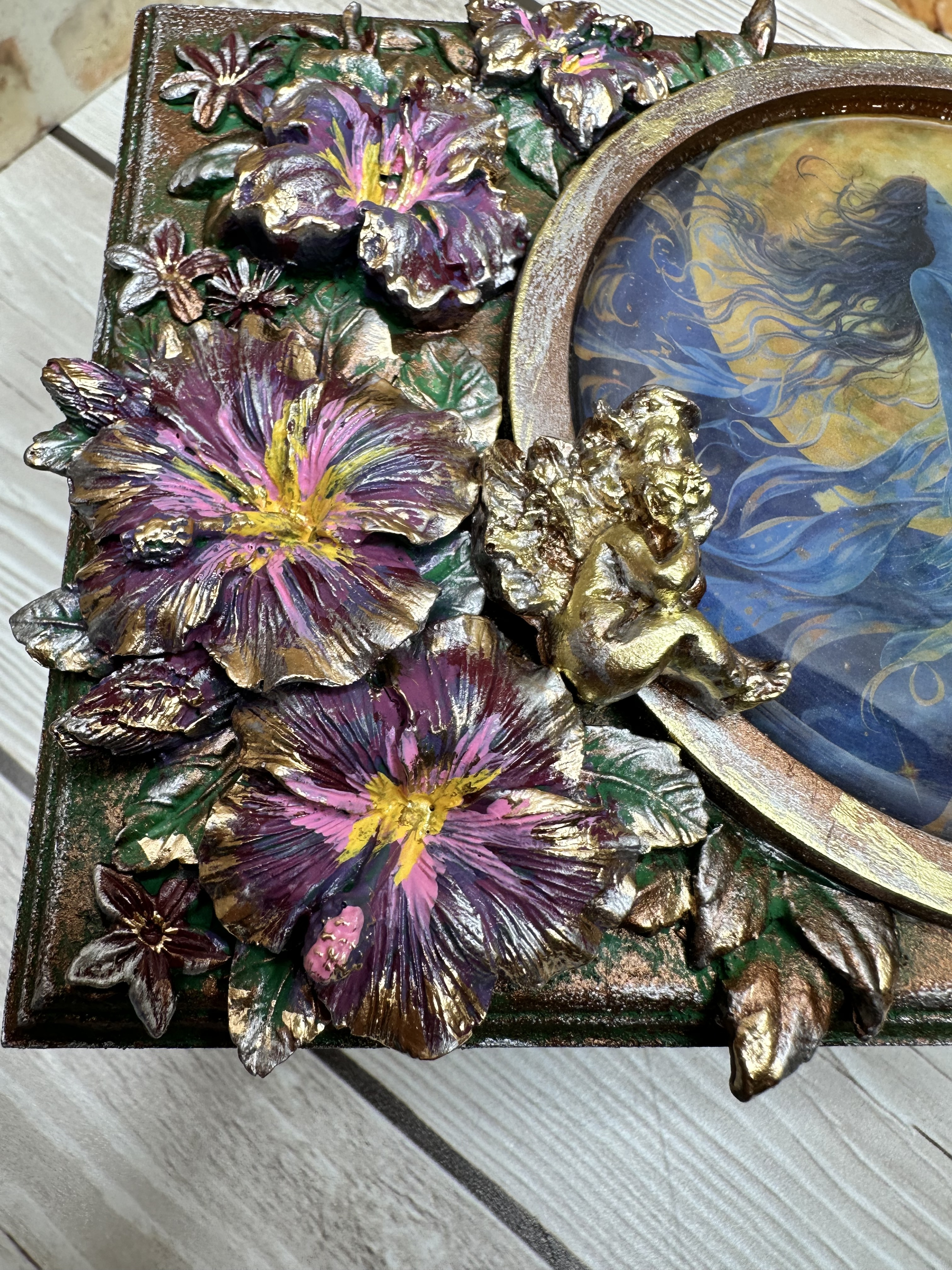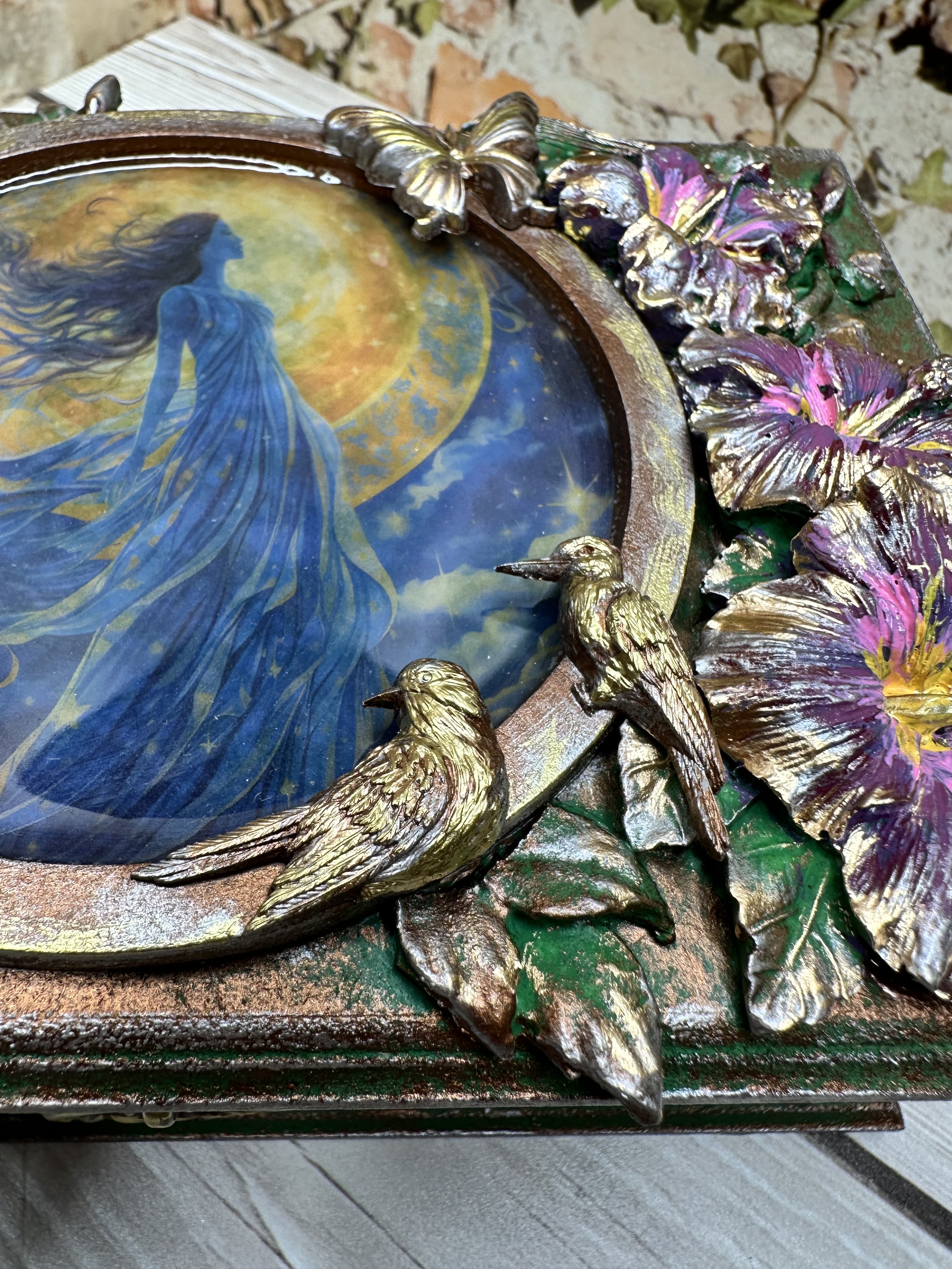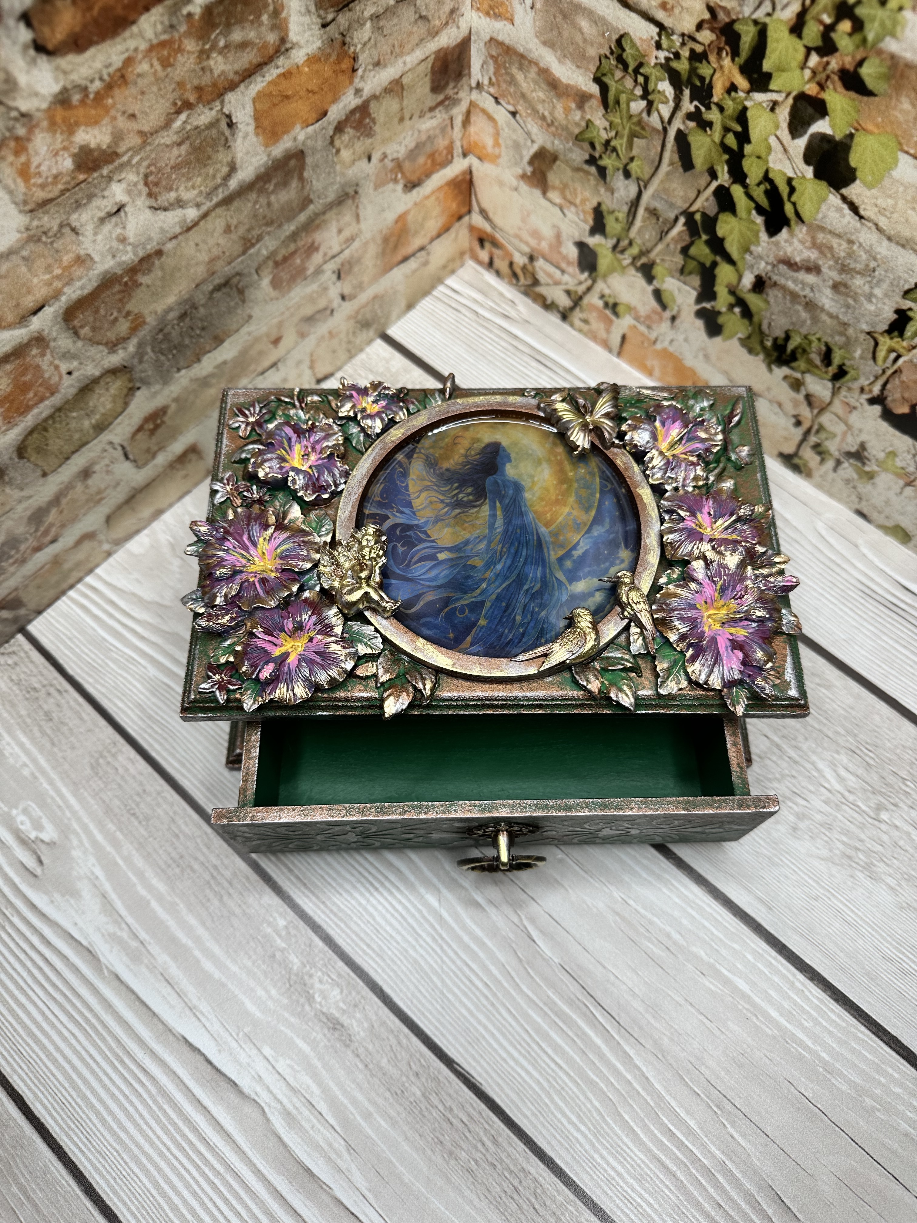 Очаровательная шкатулка ручной работы, созданная в нежном романтическом стиле. Вдохновлённая образом прекрасной девушки на фоне луны и ангела среди цветов, она изготовлена из натурального МДФ с использованием моделирующей пасты, декоративных элементов и ярких акриловых красок. Это идеальное место для бережного хранения ваших любимых украшений и ценных мелочей. Эта уникальная вещь станет прекрасным дополнением домашнего декора, привнесёт уют и очарование в любой интерьер. Она идеально подойдёт девушкам и женщинам, ценящим красоту и оригинальность. Дарите близким людям тепло и внимание вместе с этой очаровательной шкатулкой.