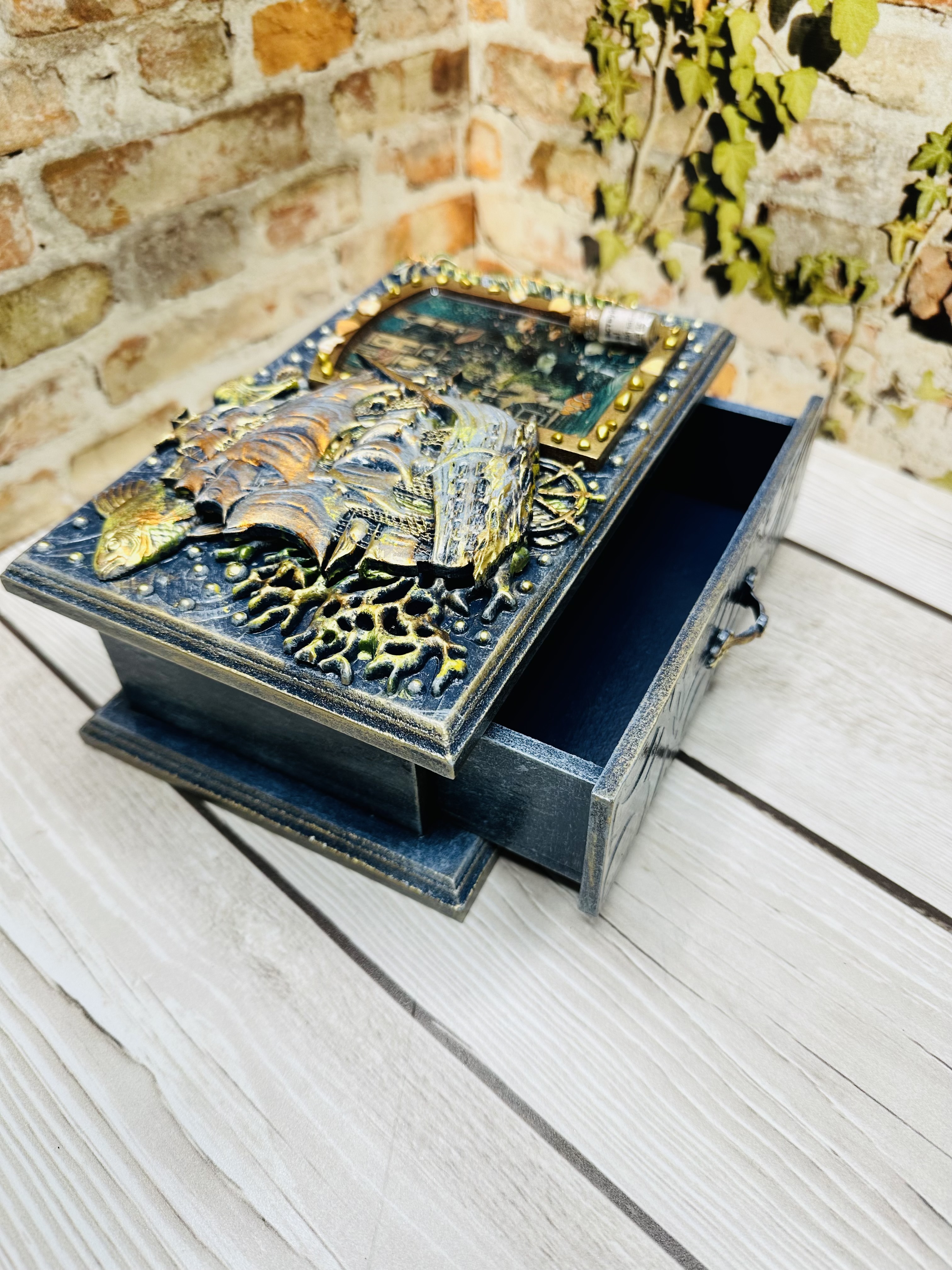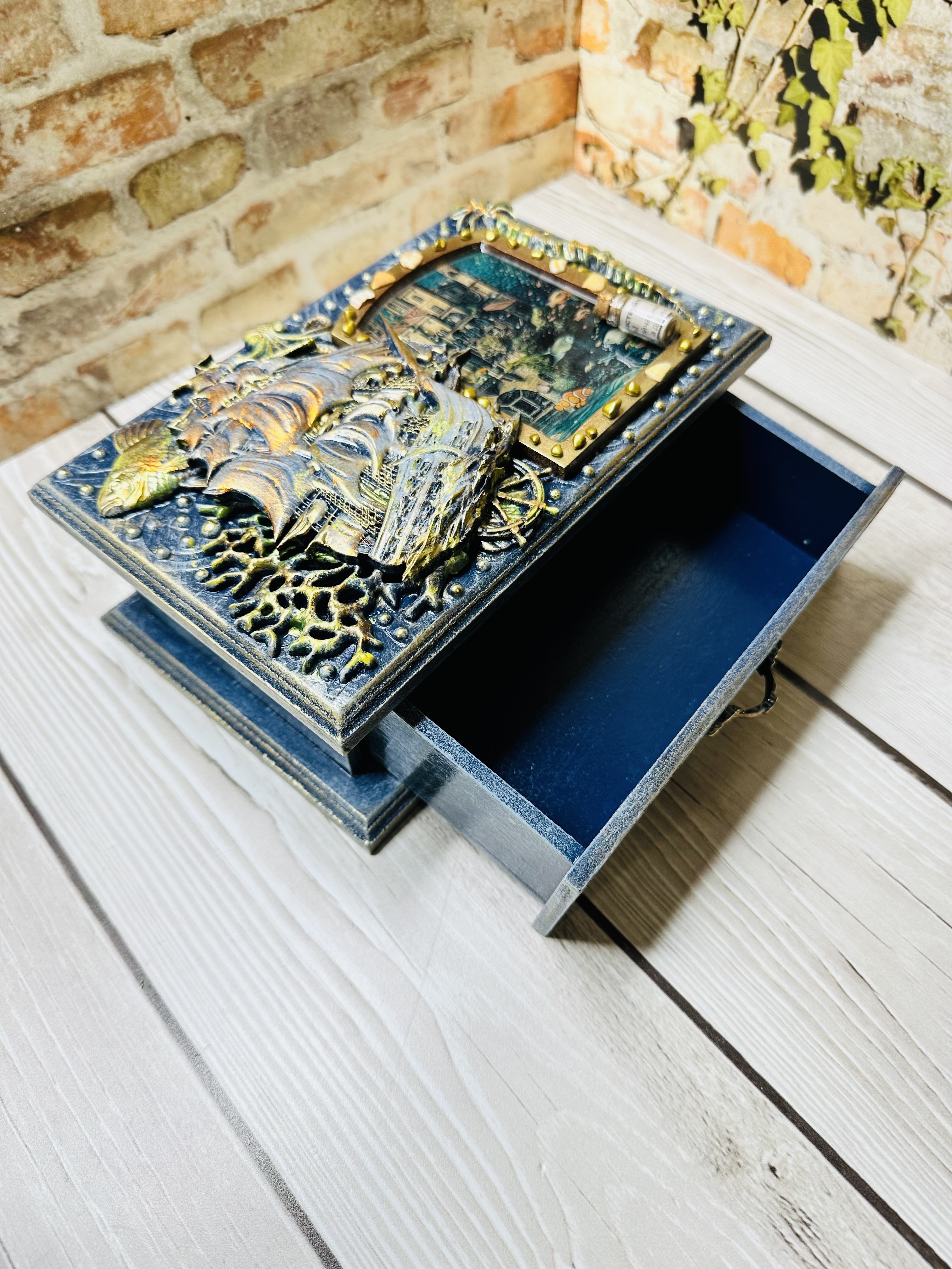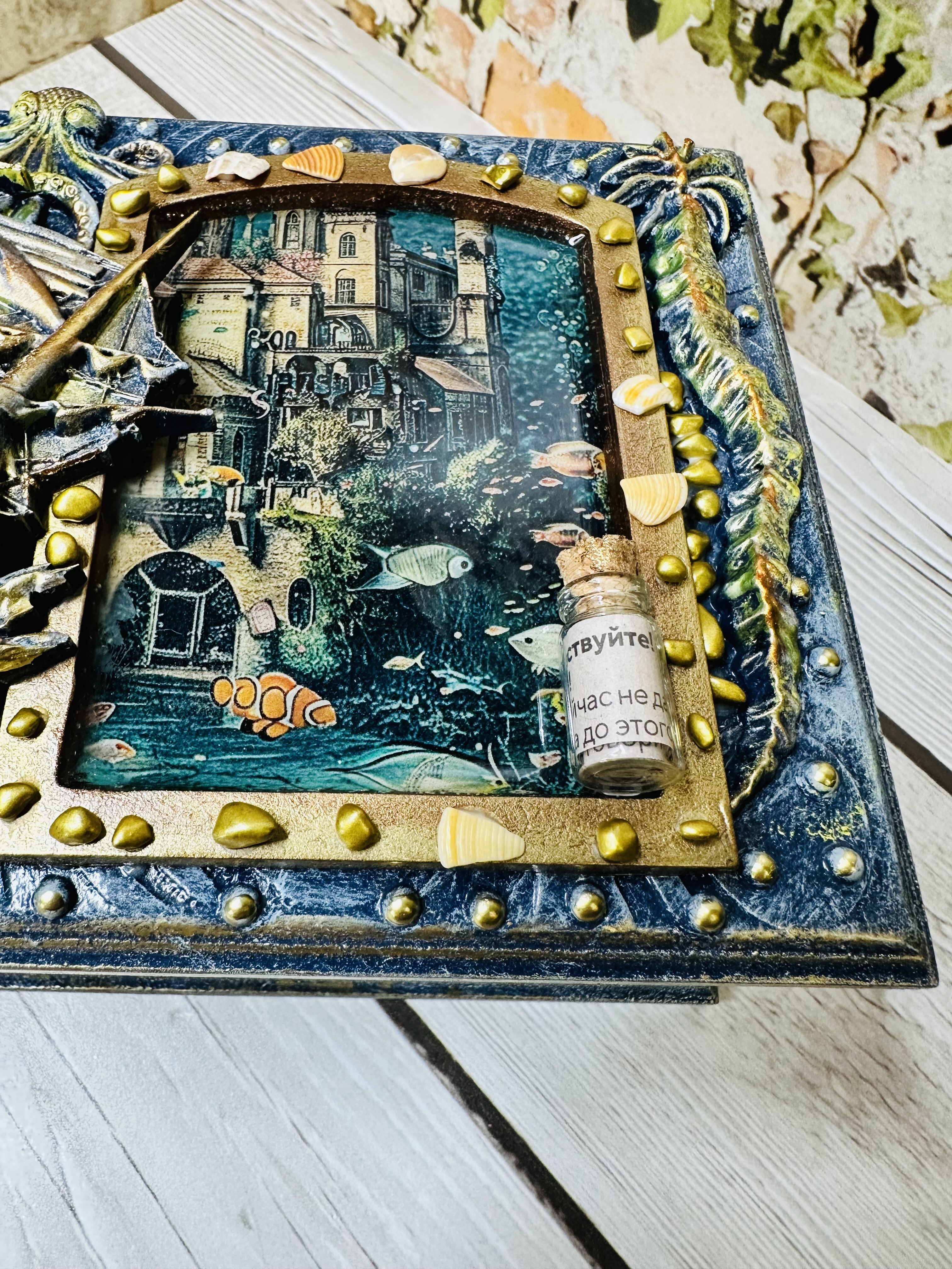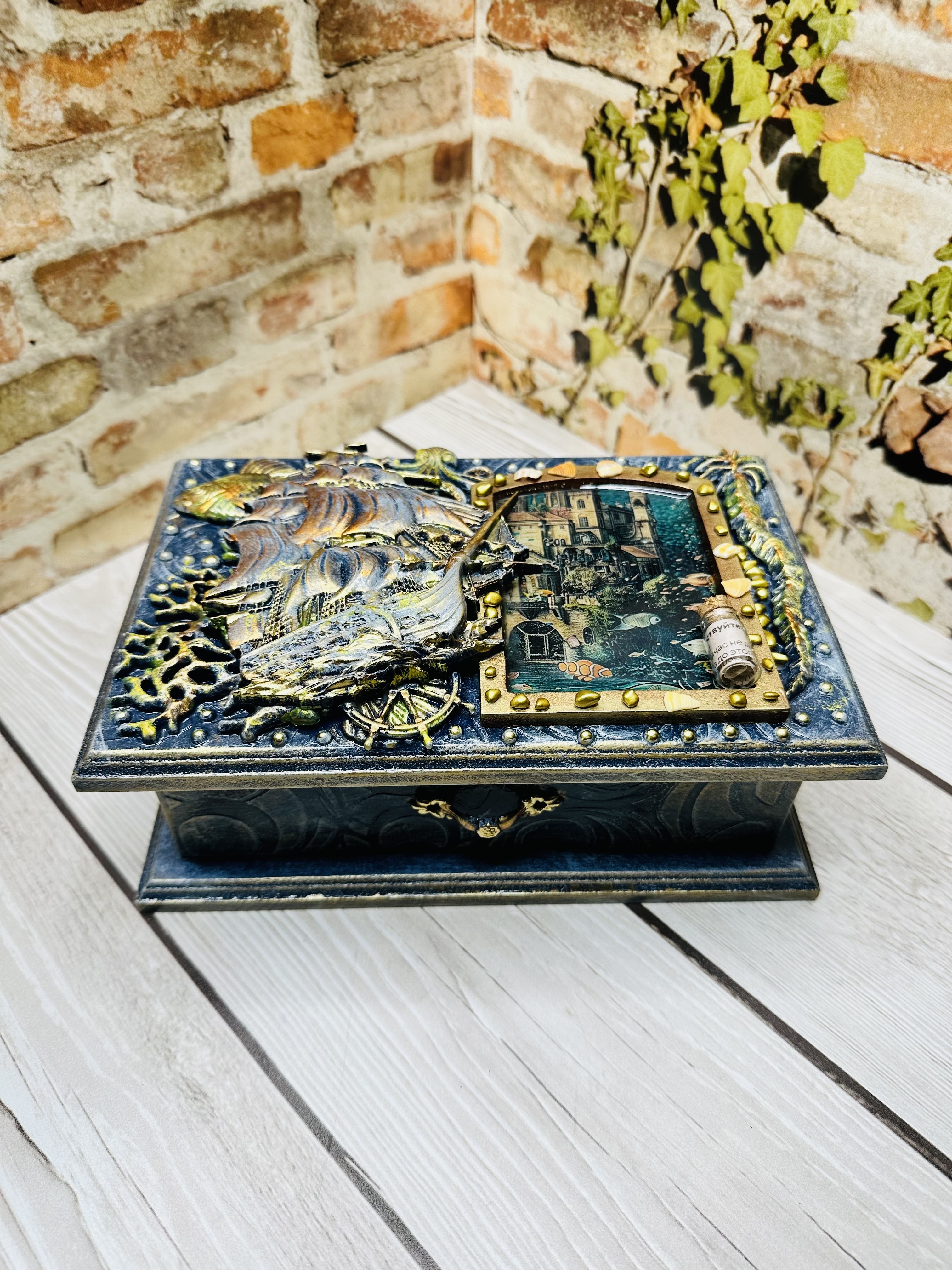 Оригинальная шкатулка ручной работы, созданная в уникальной технике Mix Media. Выполнена из натурального МДФ, дополненного декоративными элементами: натуральными ракушками, художественными восками и акриловыми красками. Идеально подходит для бережного хранения украшений, драгоценных мелочей и личных тайн. Создадите уютное пространство дома или подарите незабываемый подарок близким? Эта шкатулка привнесёт атмосферу романтики морских путешествий и станет изысканным украшением интерьера. Сделайте заказ сегодня и ощутите магию морского приключения!