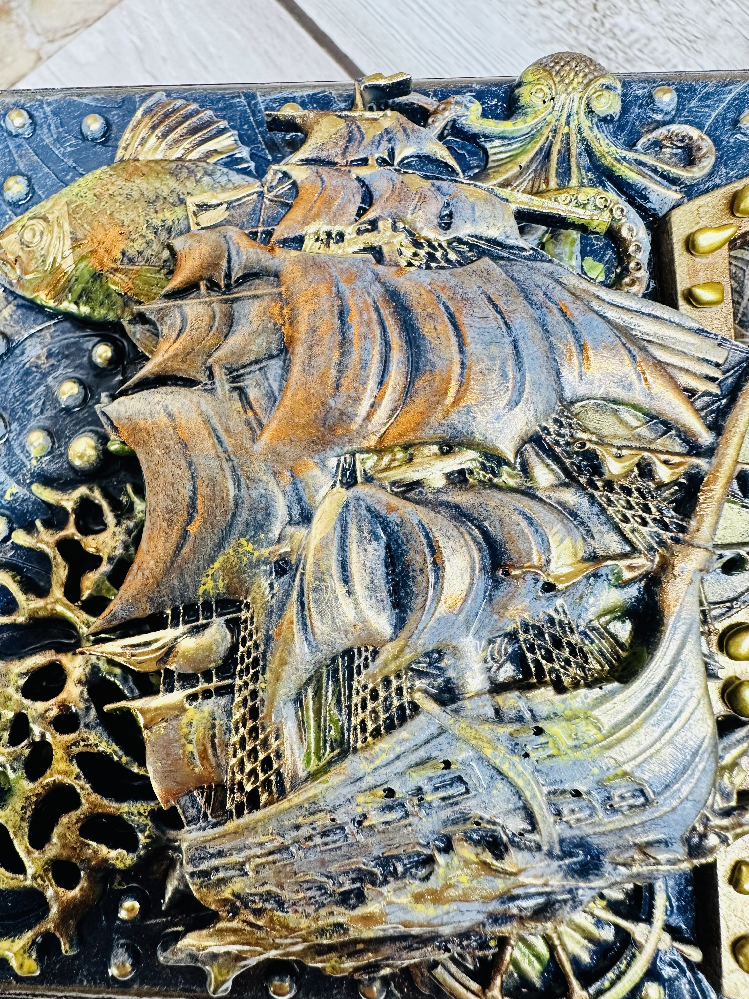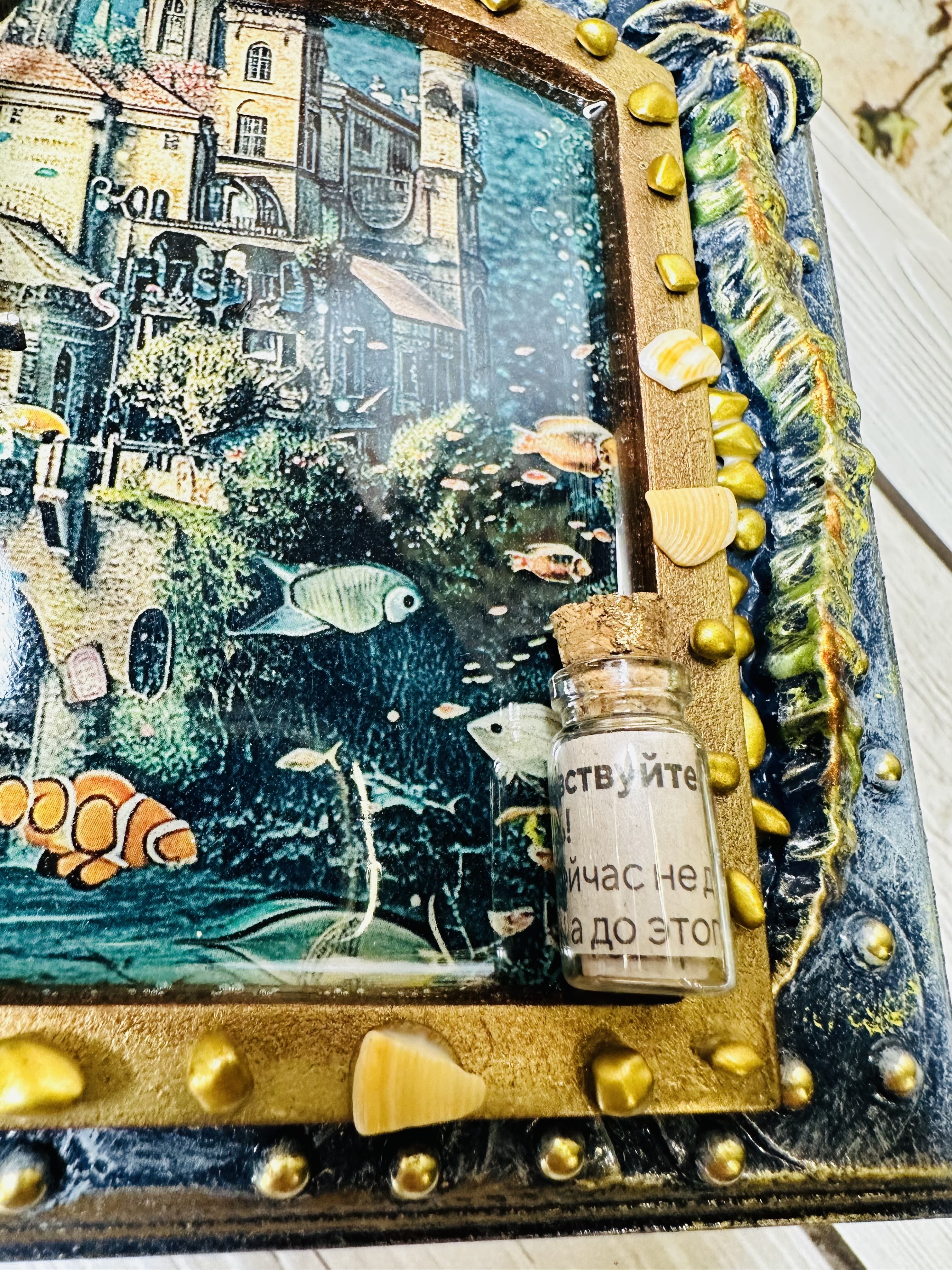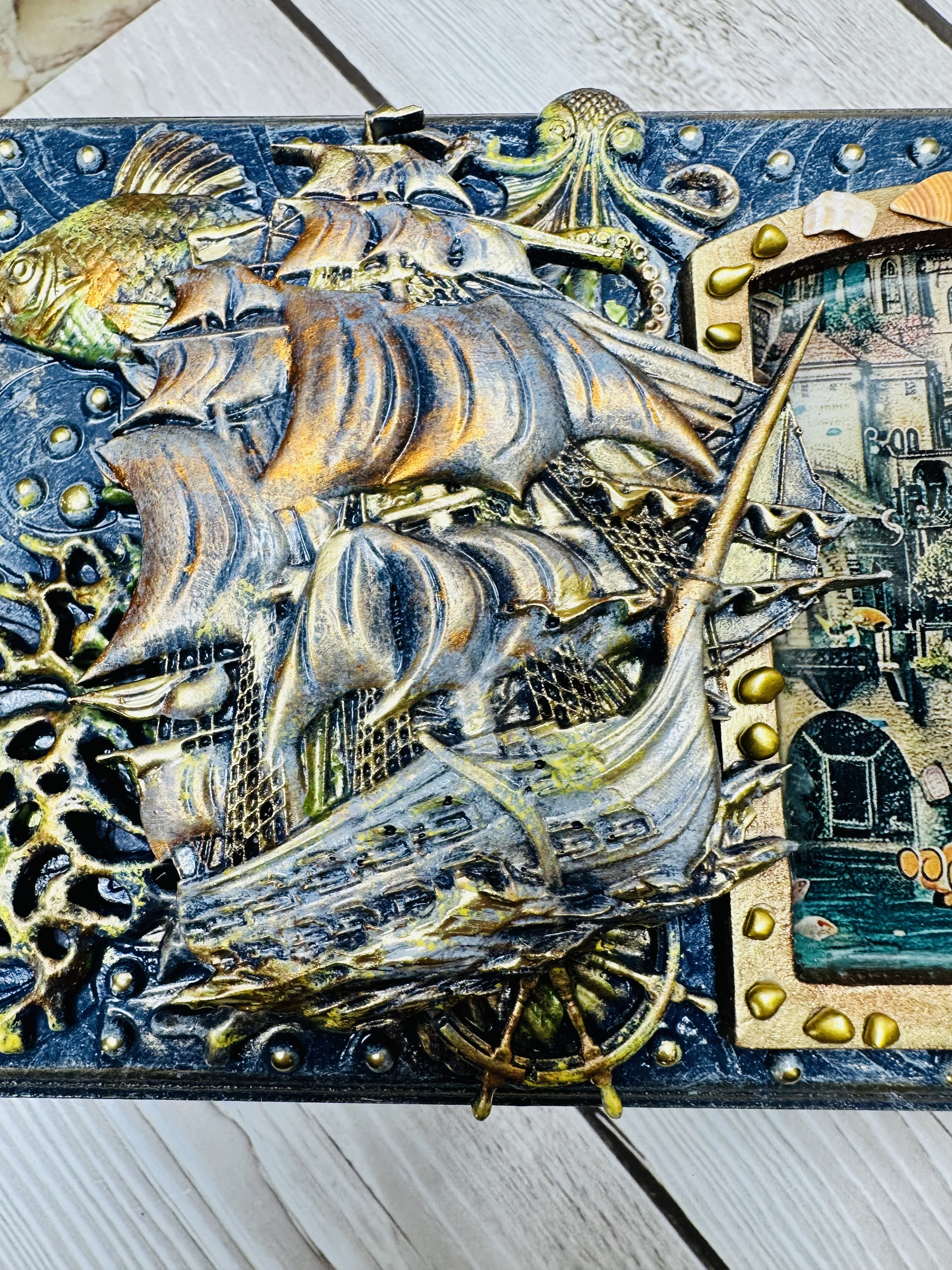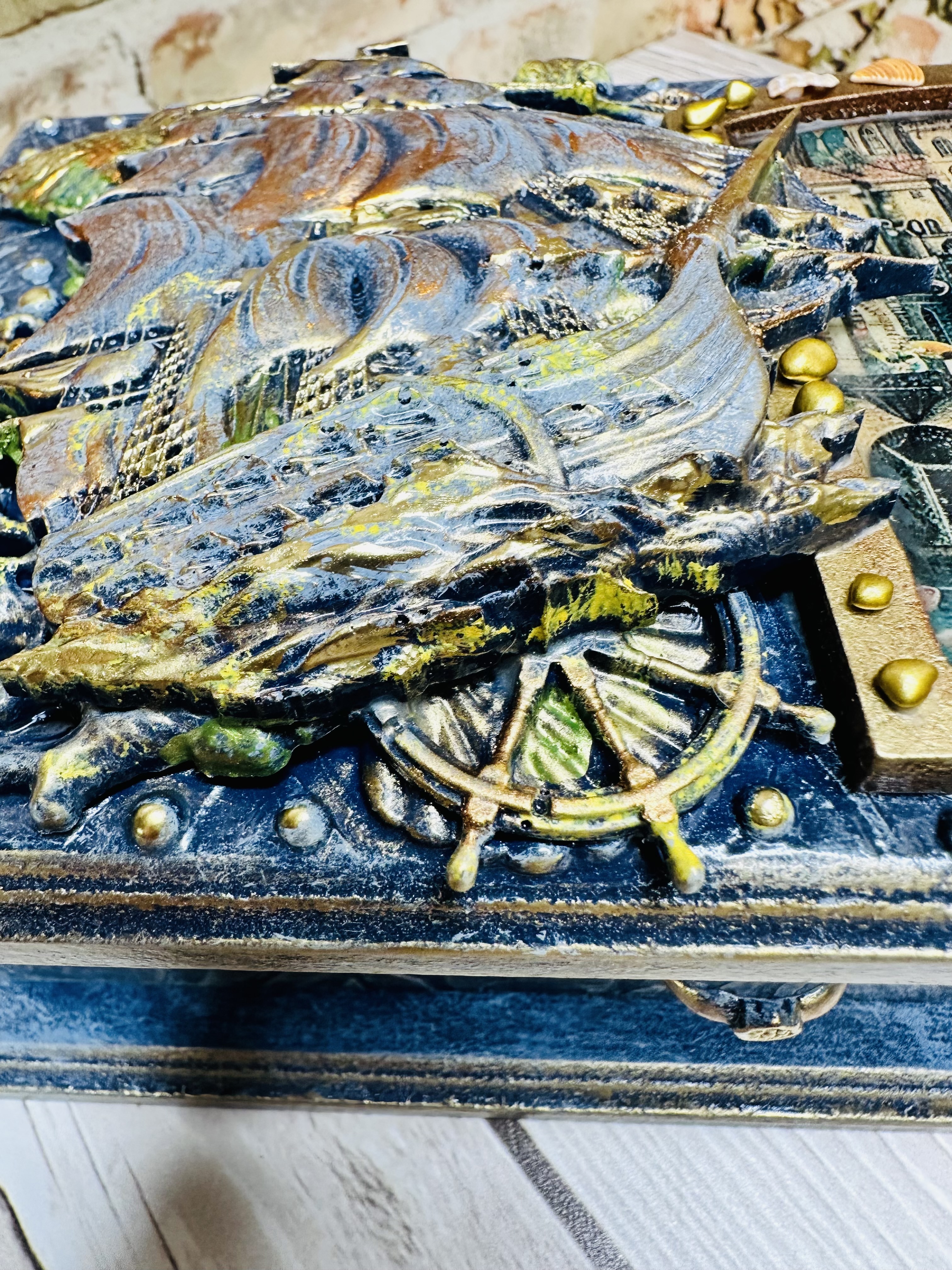 Оригинальная шкатулка ручной работы, созданная в уникальной технике Mix Media. Выполнена из натурального МДФ, дополненного декоративными элементами: натуральными ракушками, художественными восками и акриловыми красками. Идеально подходит для бережного хранения украшений, драгоценных мелочей и личных тайн. Создадите уютное пространство дома или подарите незабываемый подарок близким? Эта шкатулка привнесёт атмосферу романтики морских путешествий и станет изысканным украшением интерьера. Сделайте заказ сегодня и ощутите магию морского приключения!