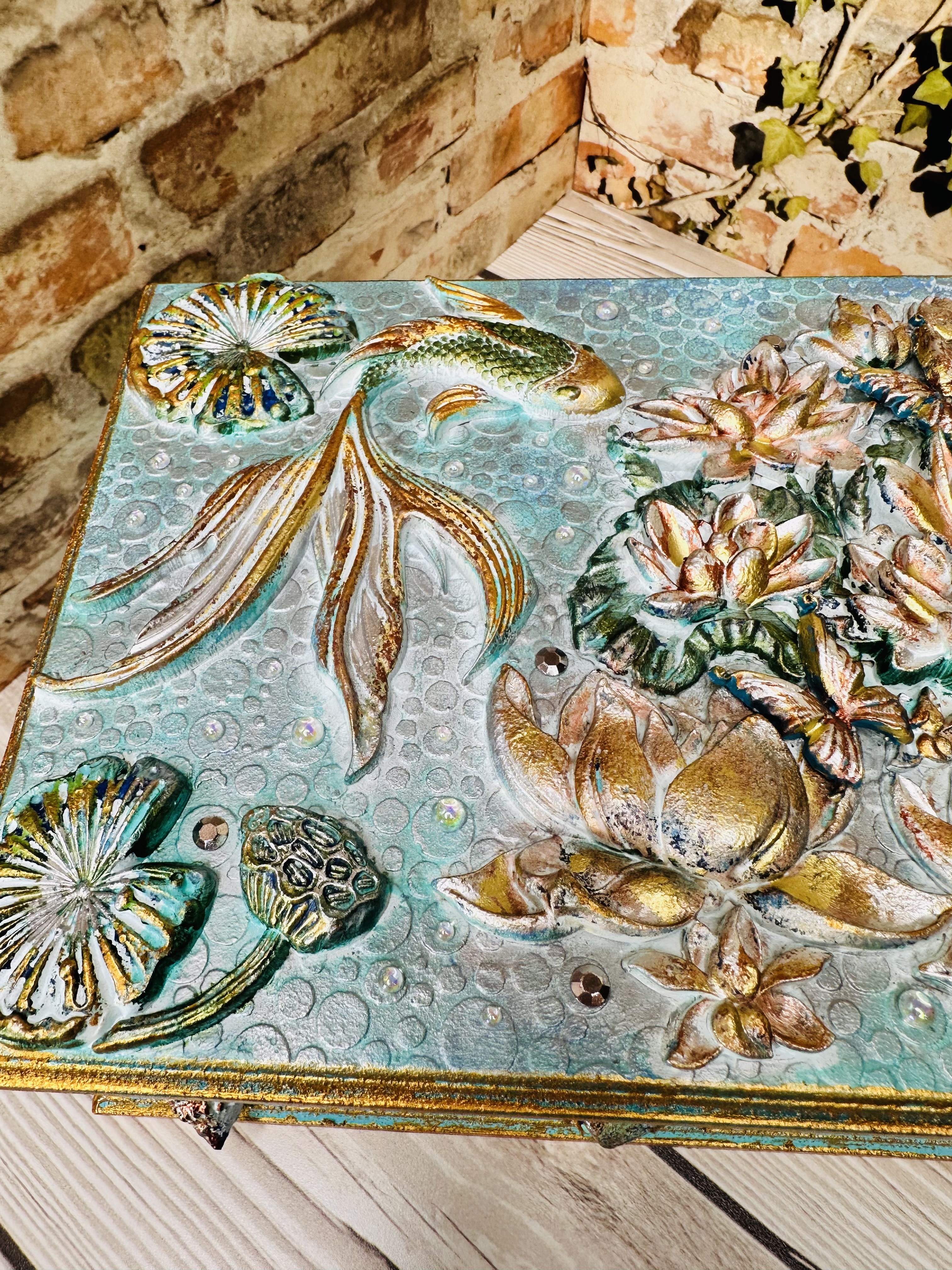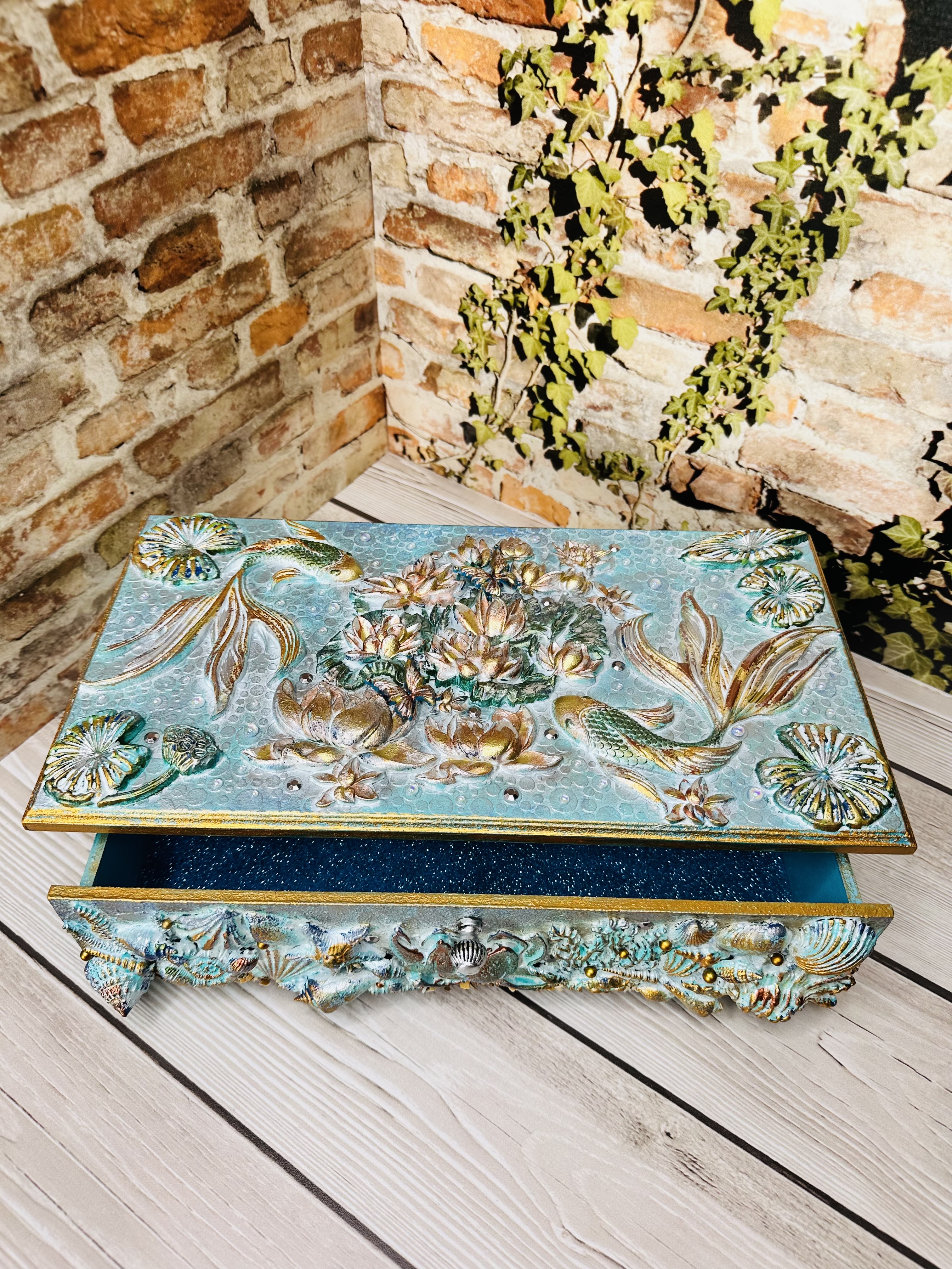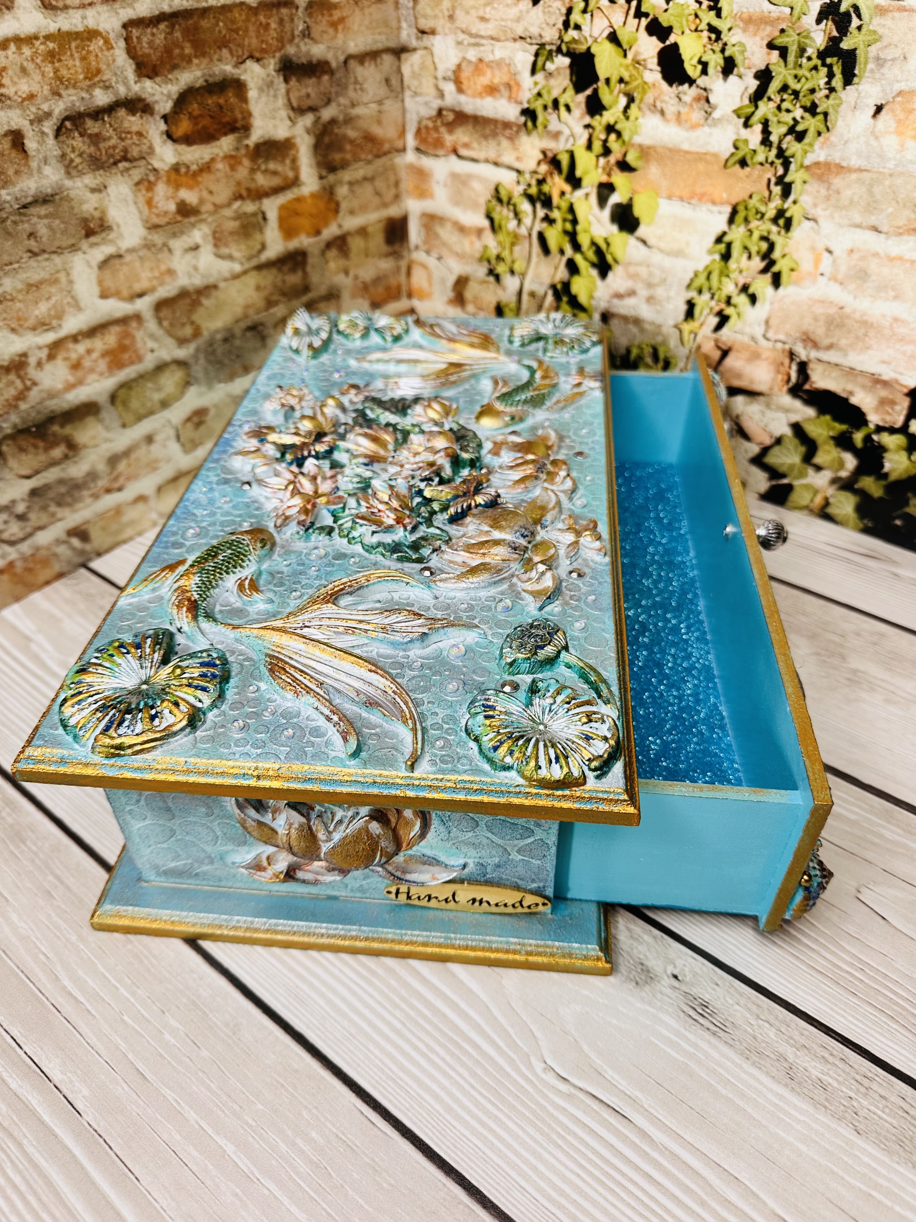Эта уникальная шкатулка изготовлена из экологически чистого материала — МДФ, оформлена в виде миниатюрного комода с изысканным декором в технике Mix Media. Поверхность украшена живописью с золотистыми рыбками среди нежных белых лилий, выполненной вручную с использованием моделей, художественной пасты, восков и акриловых красок.