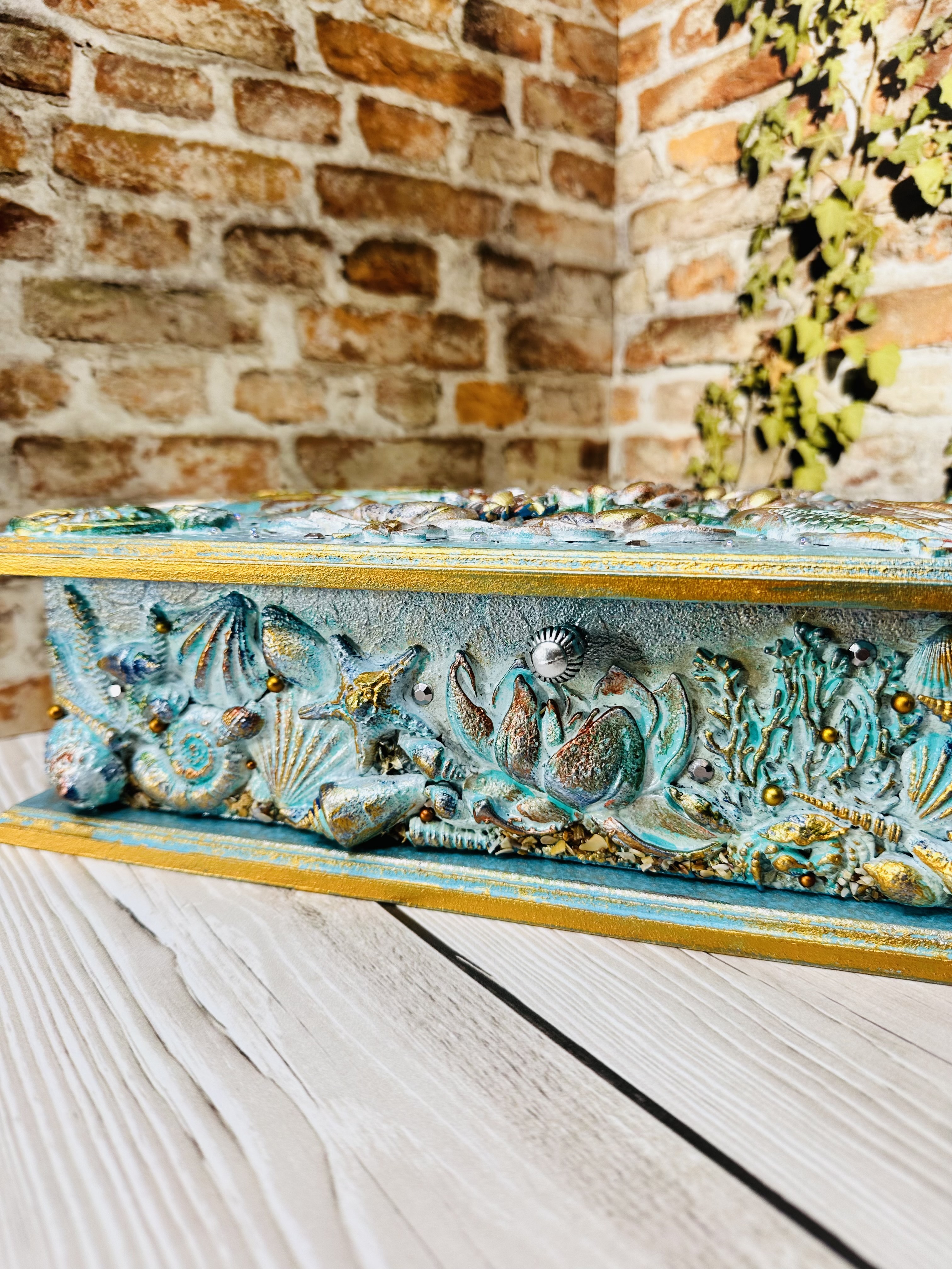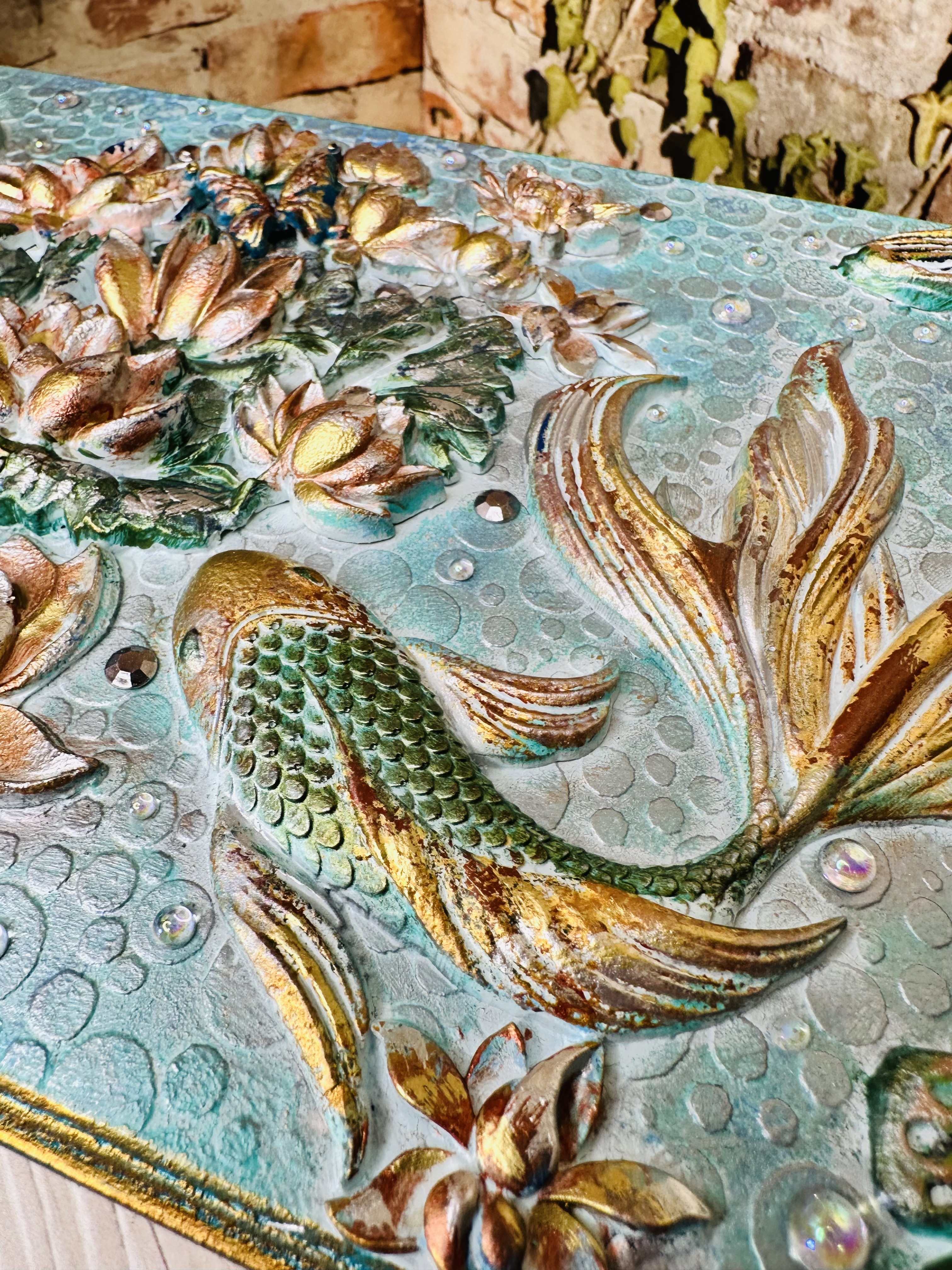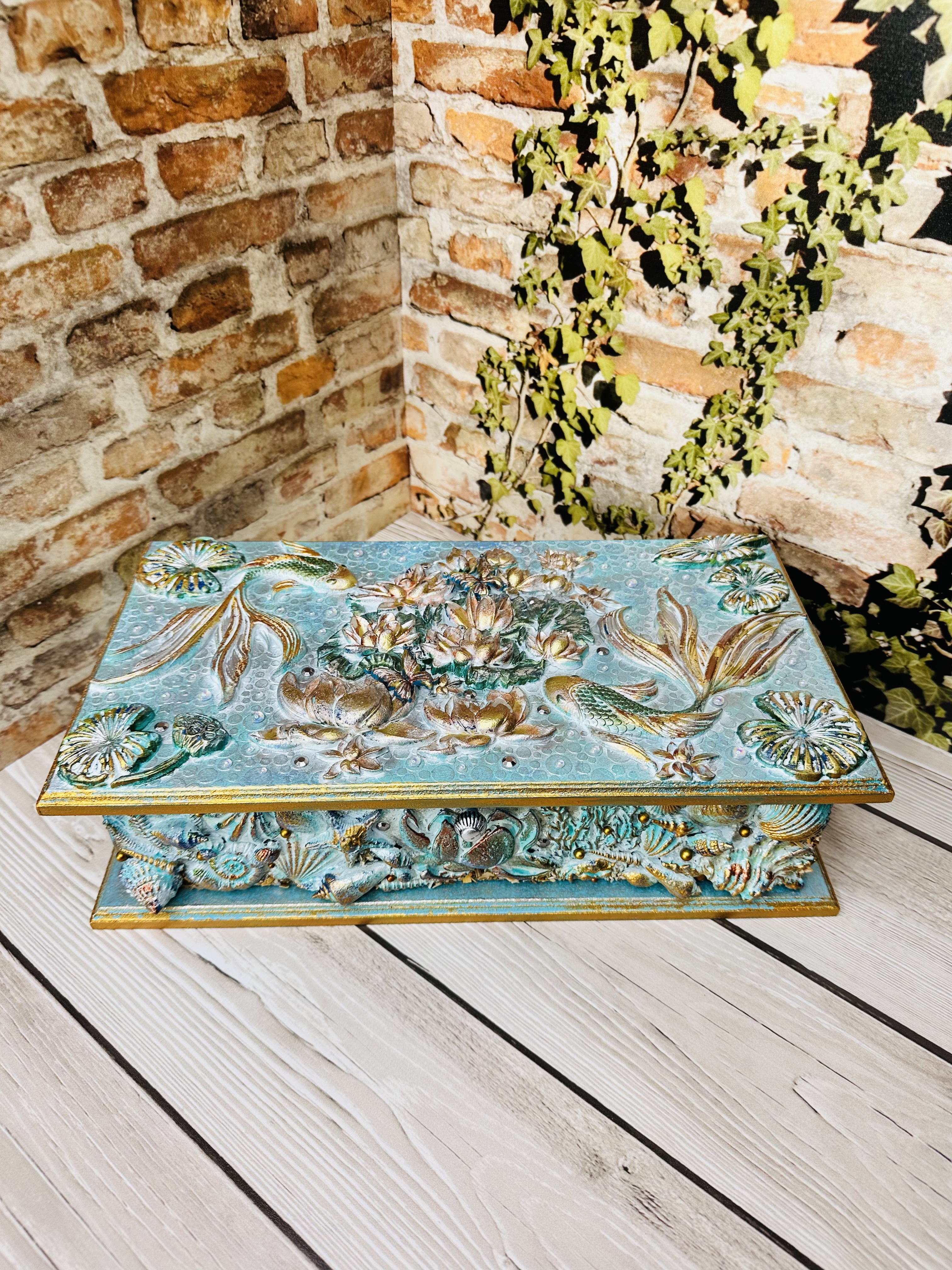 Эта уникальная шкатулка изготовлена из экологически чистого материала — МДФ, оформлена в виде миниатюрного комода с изысканным декором в технике Mix Media. Поверхность украшена живописью с золотистыми рыбками среди нежных белых лилий, выполненной вручную с использованием моделей, художественной пасты, восков и акриловых красок.