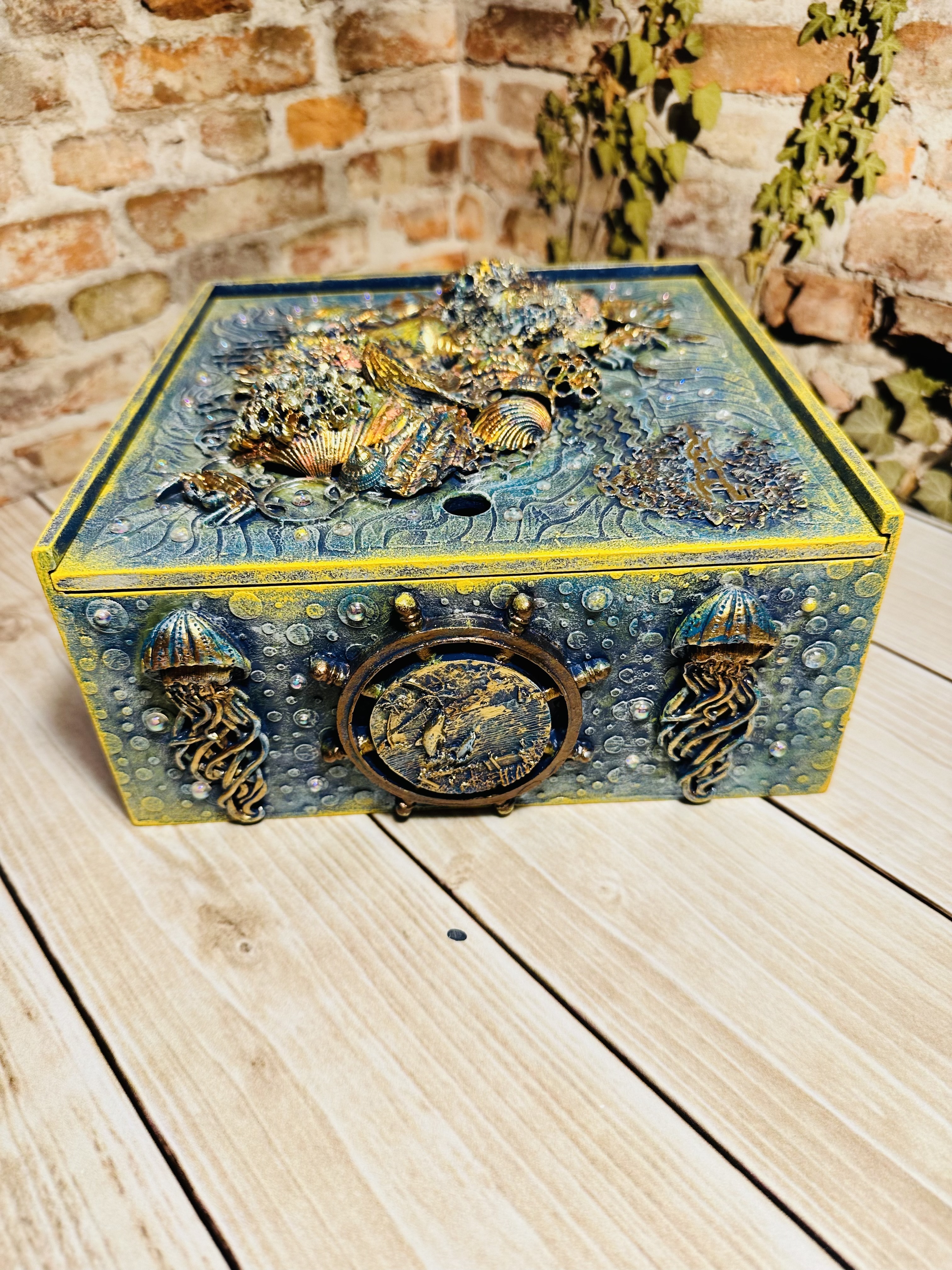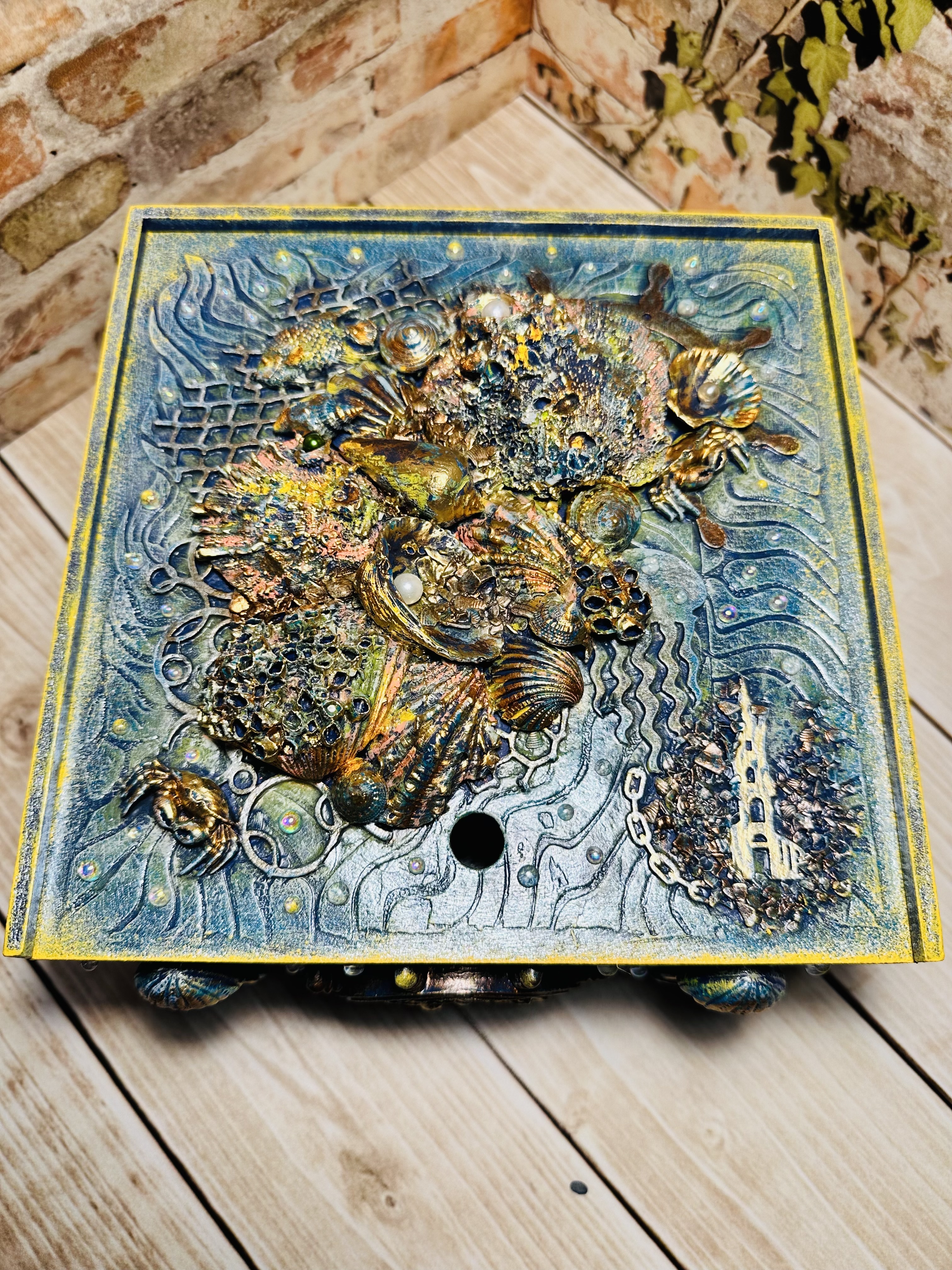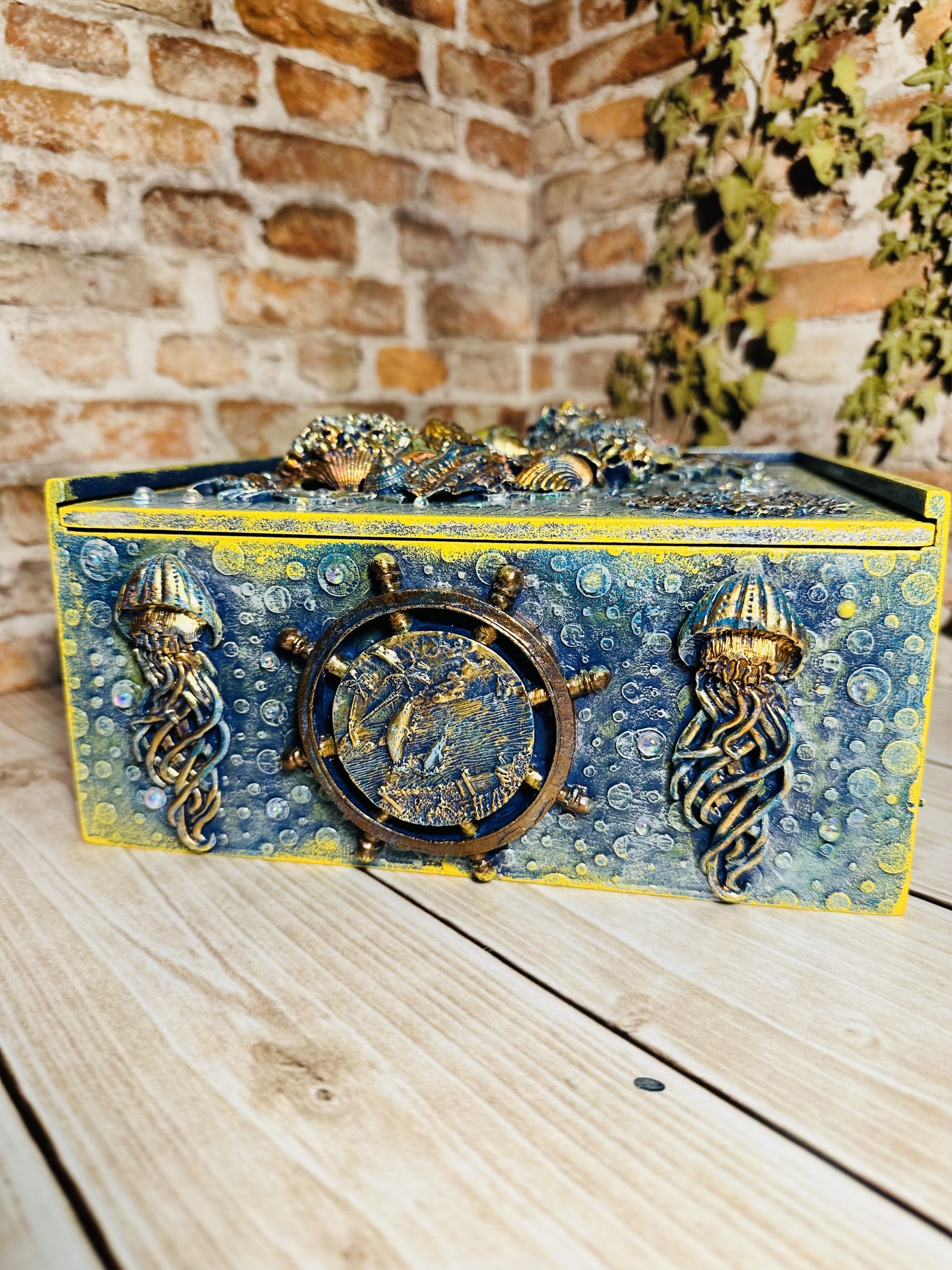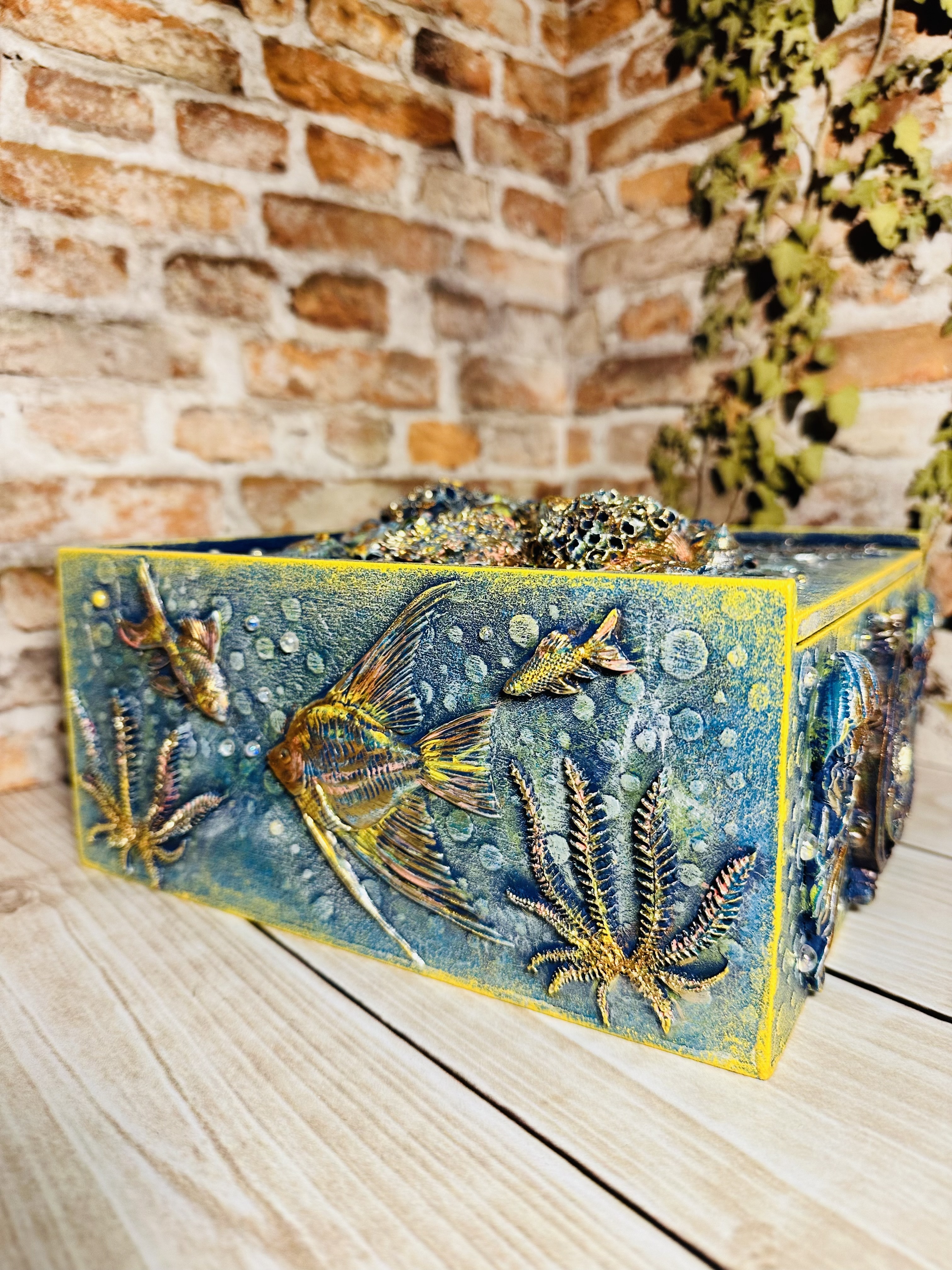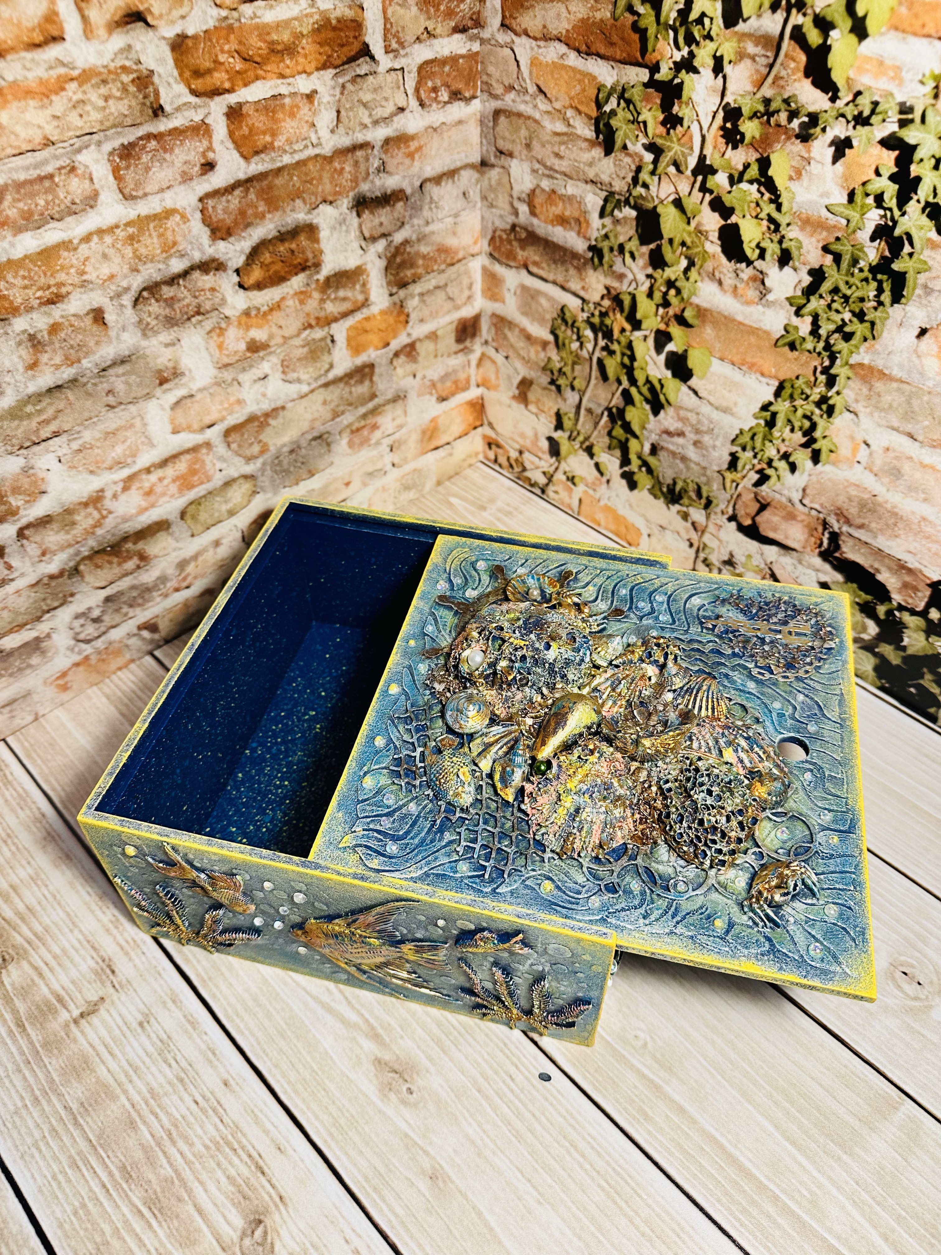 Оригинальная шкатулка ручной работы в виде пенала, созданная в технике Mix Media. Материал — натуральный МДФ, дополненный декоративными элементами, натуральными ракушками, художественным воском и яркими акриловыми красками, с использованием моделирующей пасты,. Идеально подходит для хранения украшений, косметики, канцелярии или чайных пакетиков. Стильный элемент декора, создающий атмосферу морского путешествия прямо у вас дома. Подходит девушкам и женщинам, стремящимся привнести нотки природы и творчества в повседневную обстановку. Хотите сделать ваш дом ещё уютнее и привлекательнее?