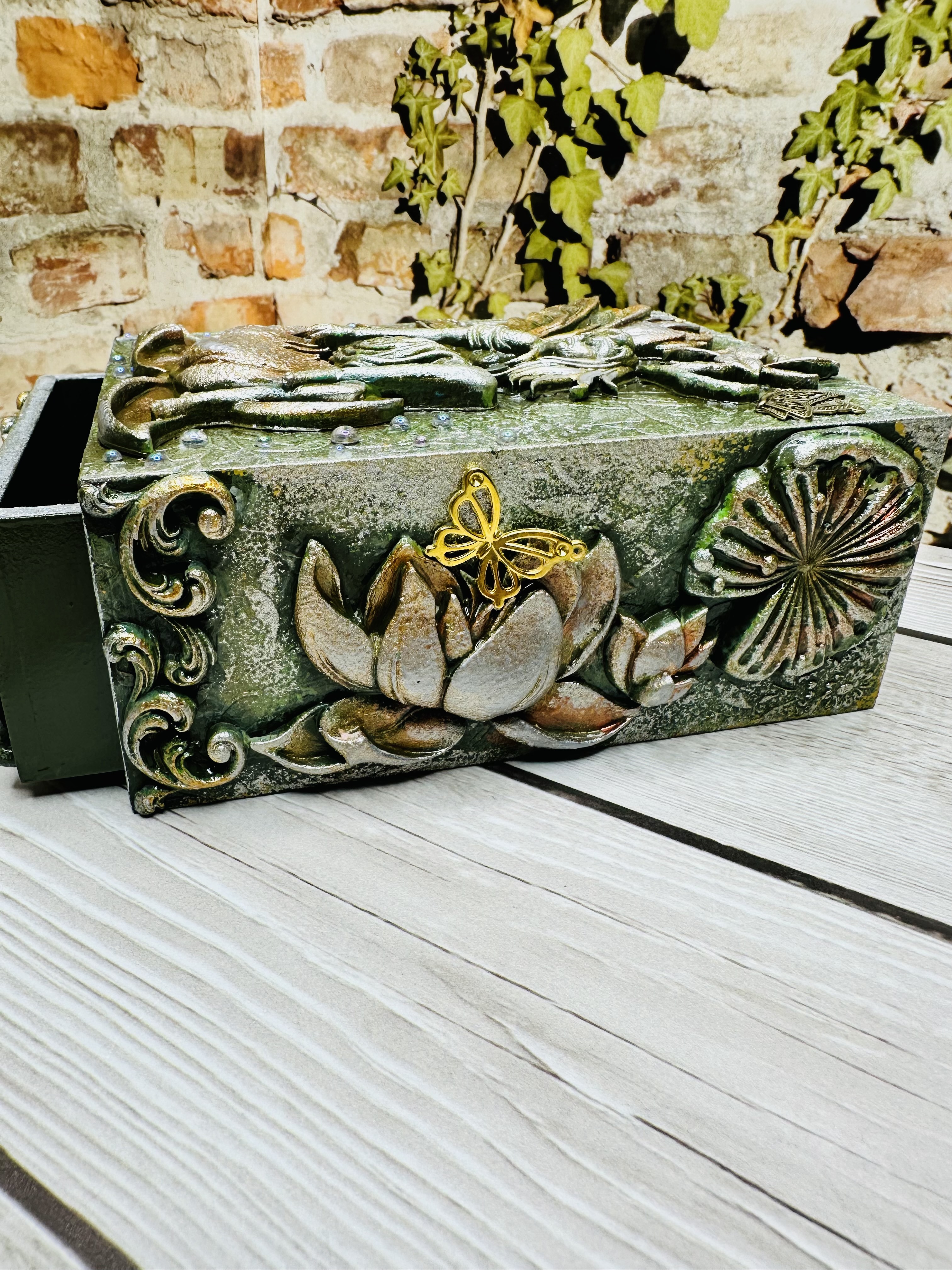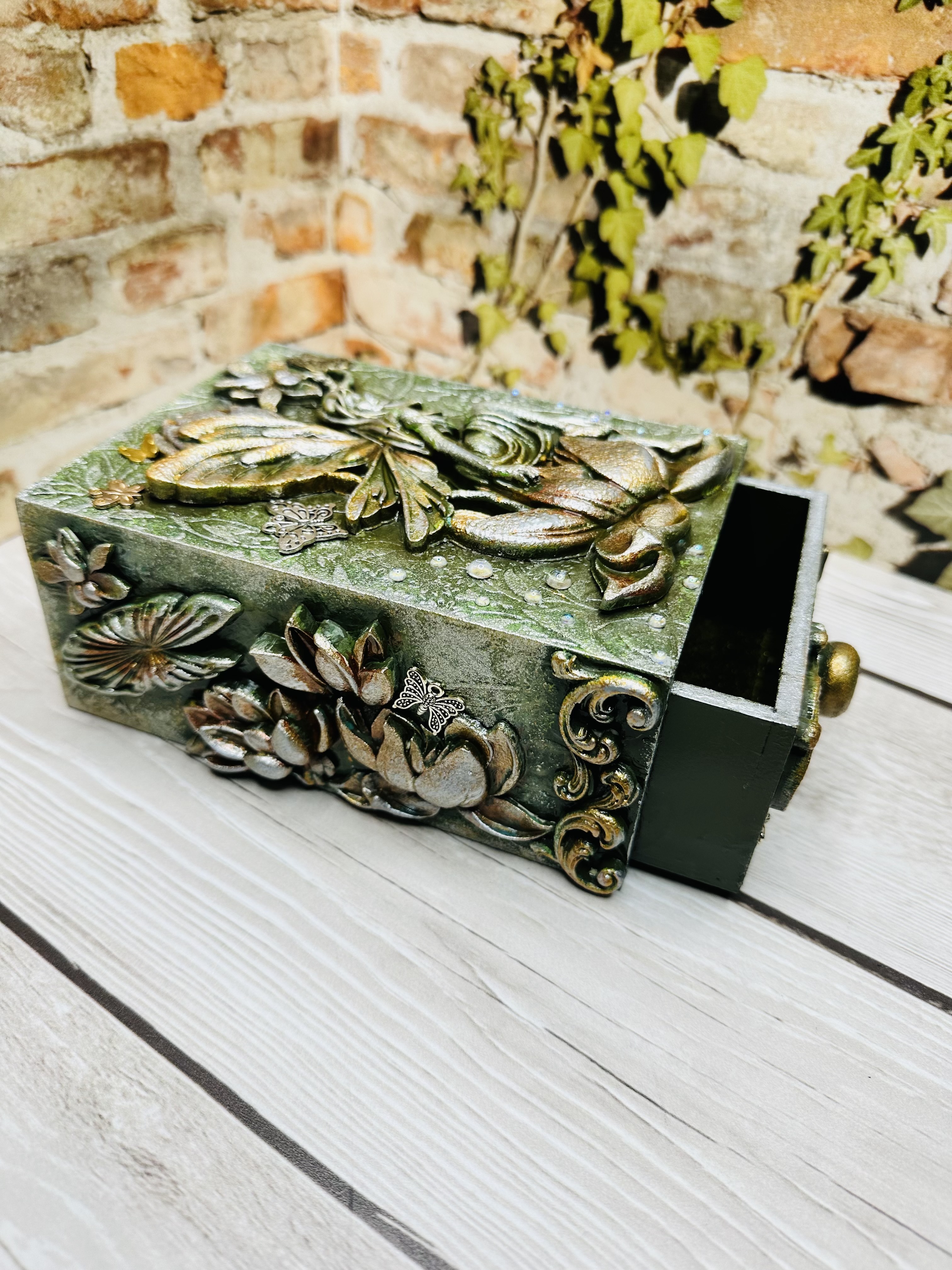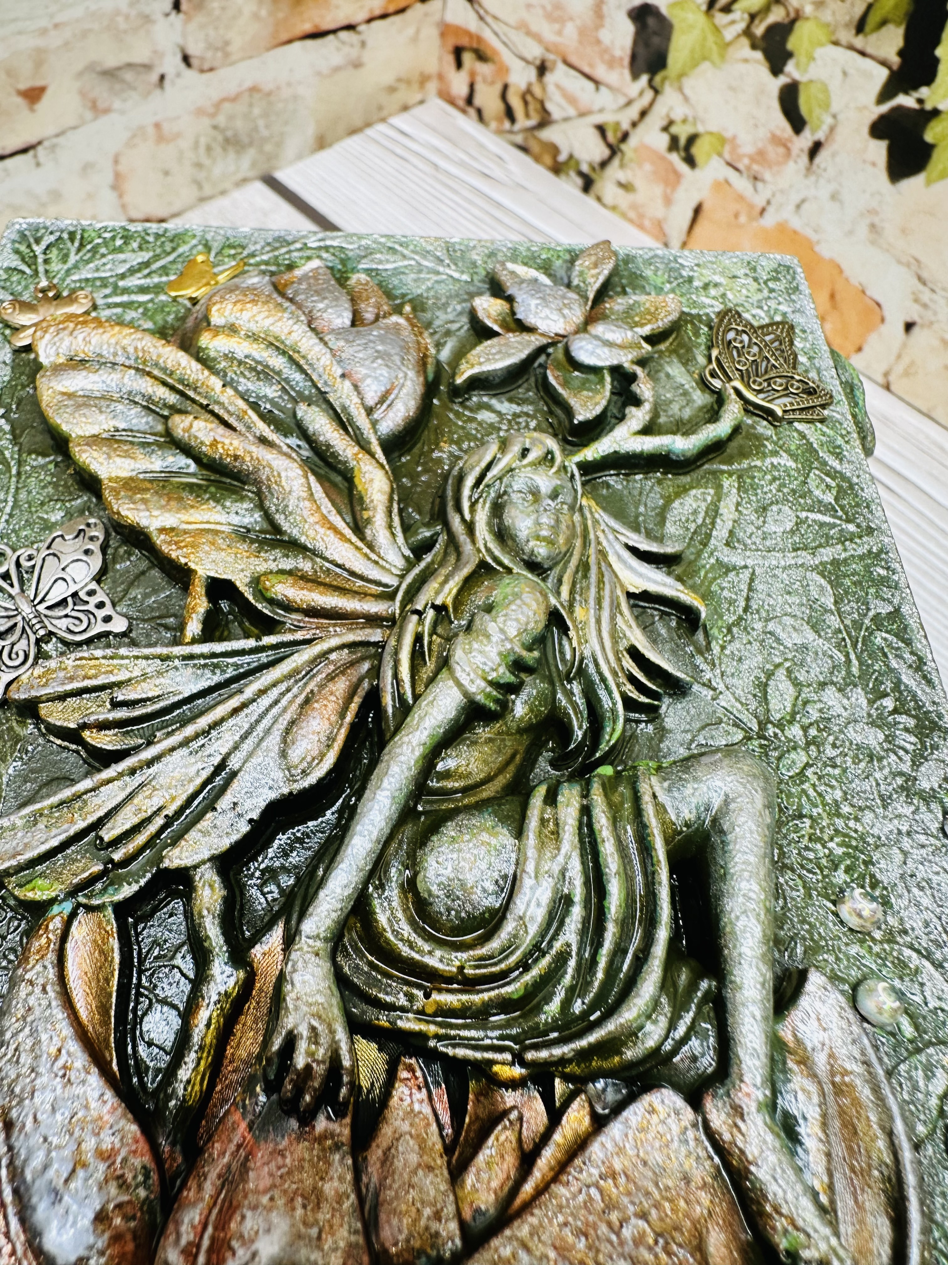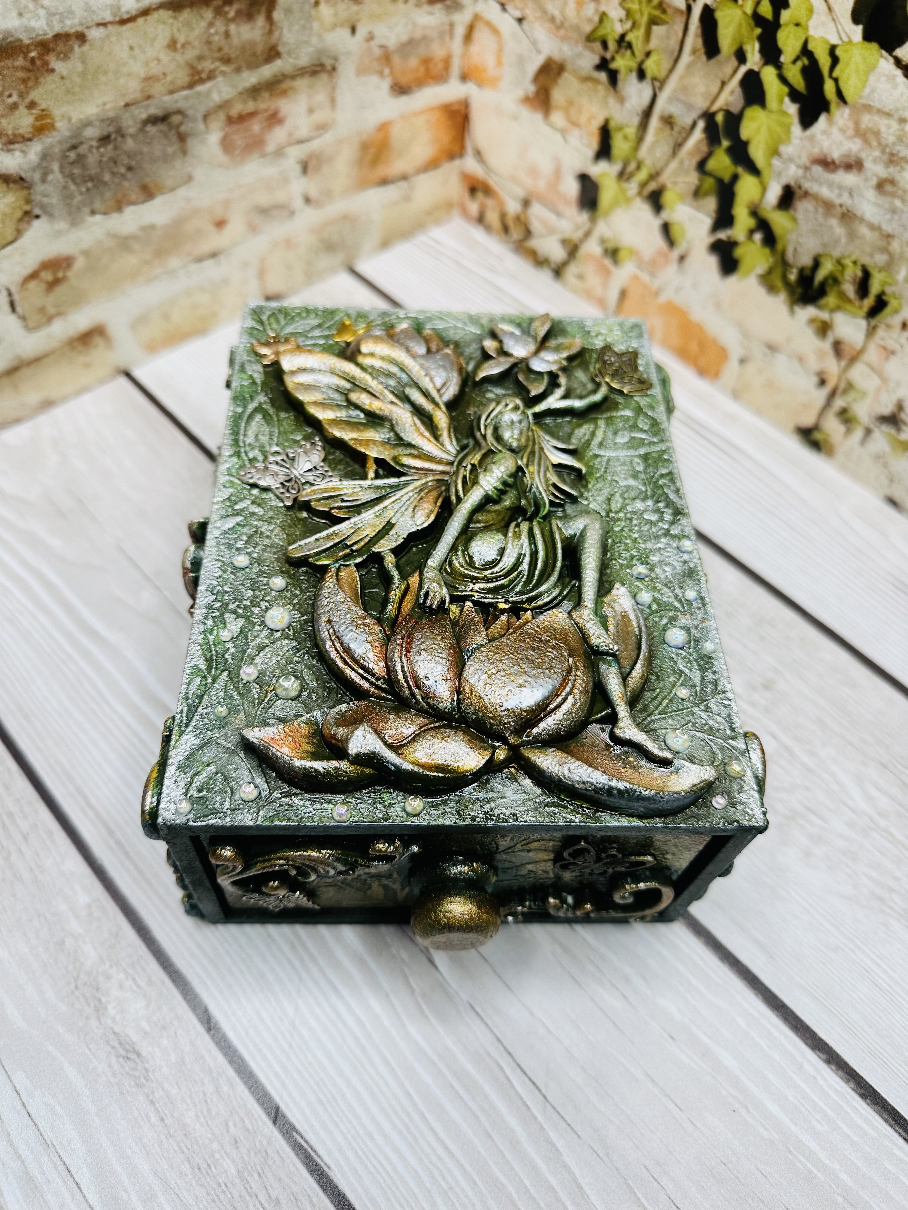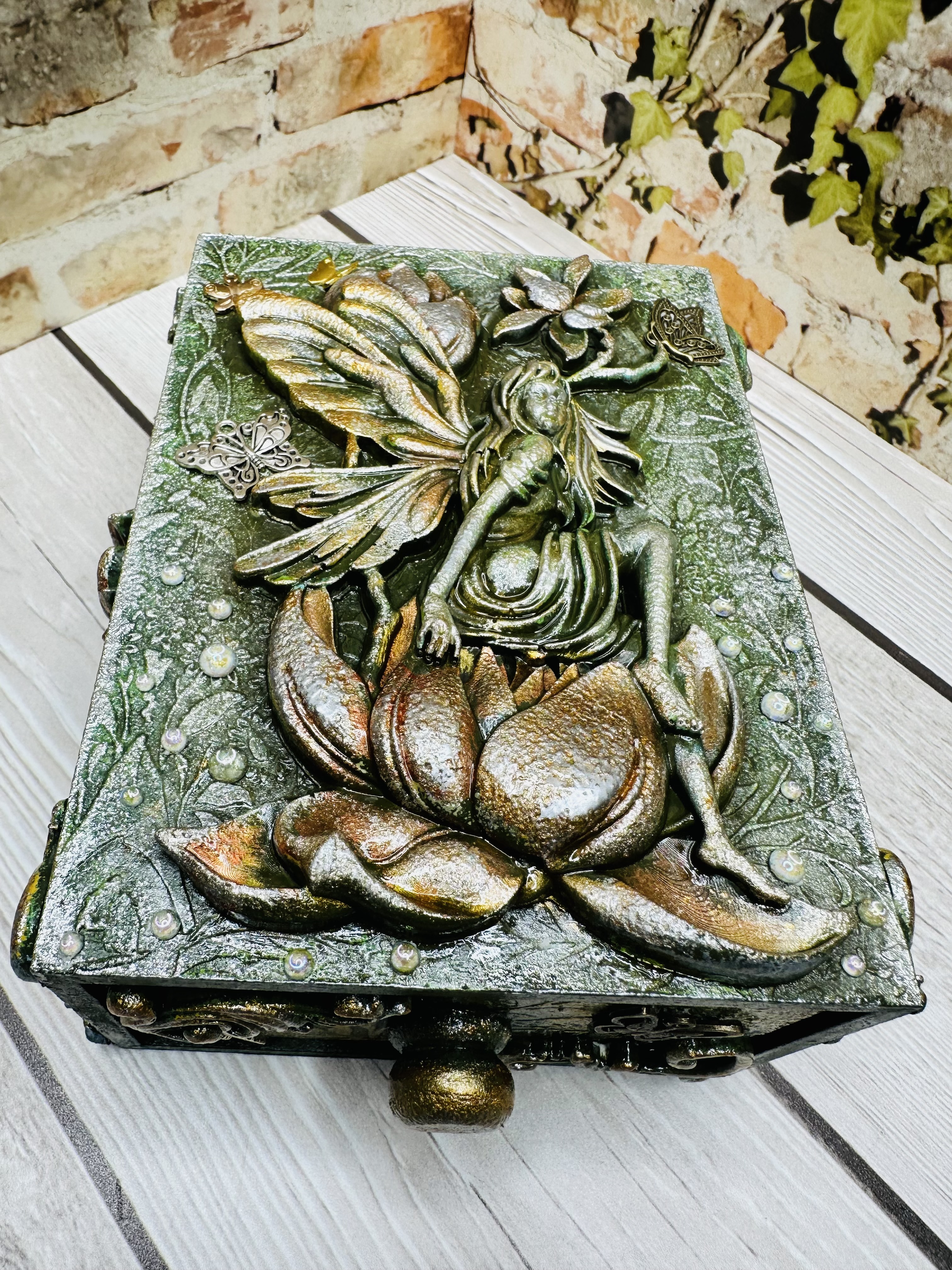 Изящная шкатулка ручной работы создана из качественного МДФ и оформлена в уникальной технике Mix Media. Её украшают изысканные элементы: образ феи на лотосе, выполненный с применением моделирующей пасты, художественных восков и акриловых красок.