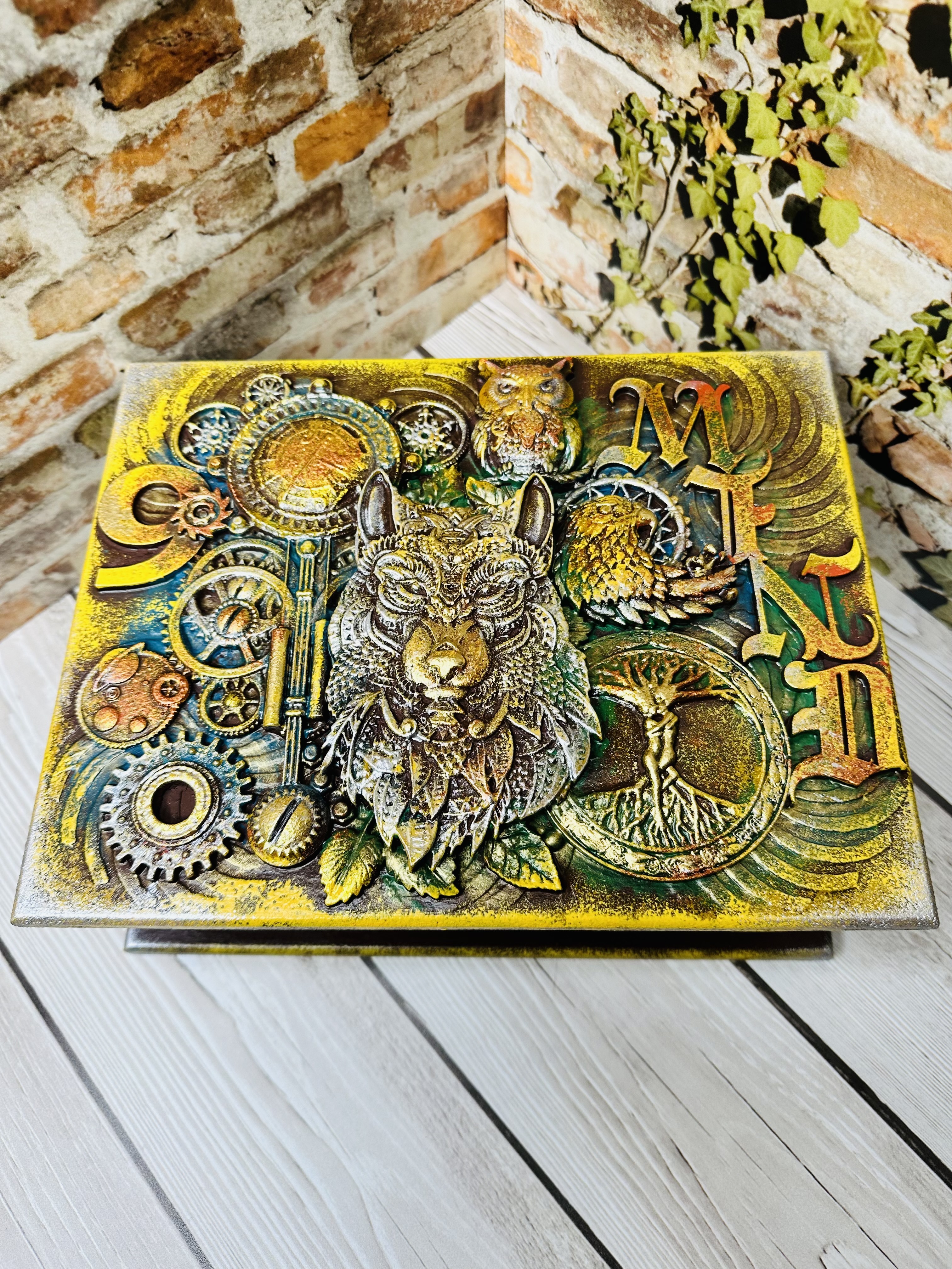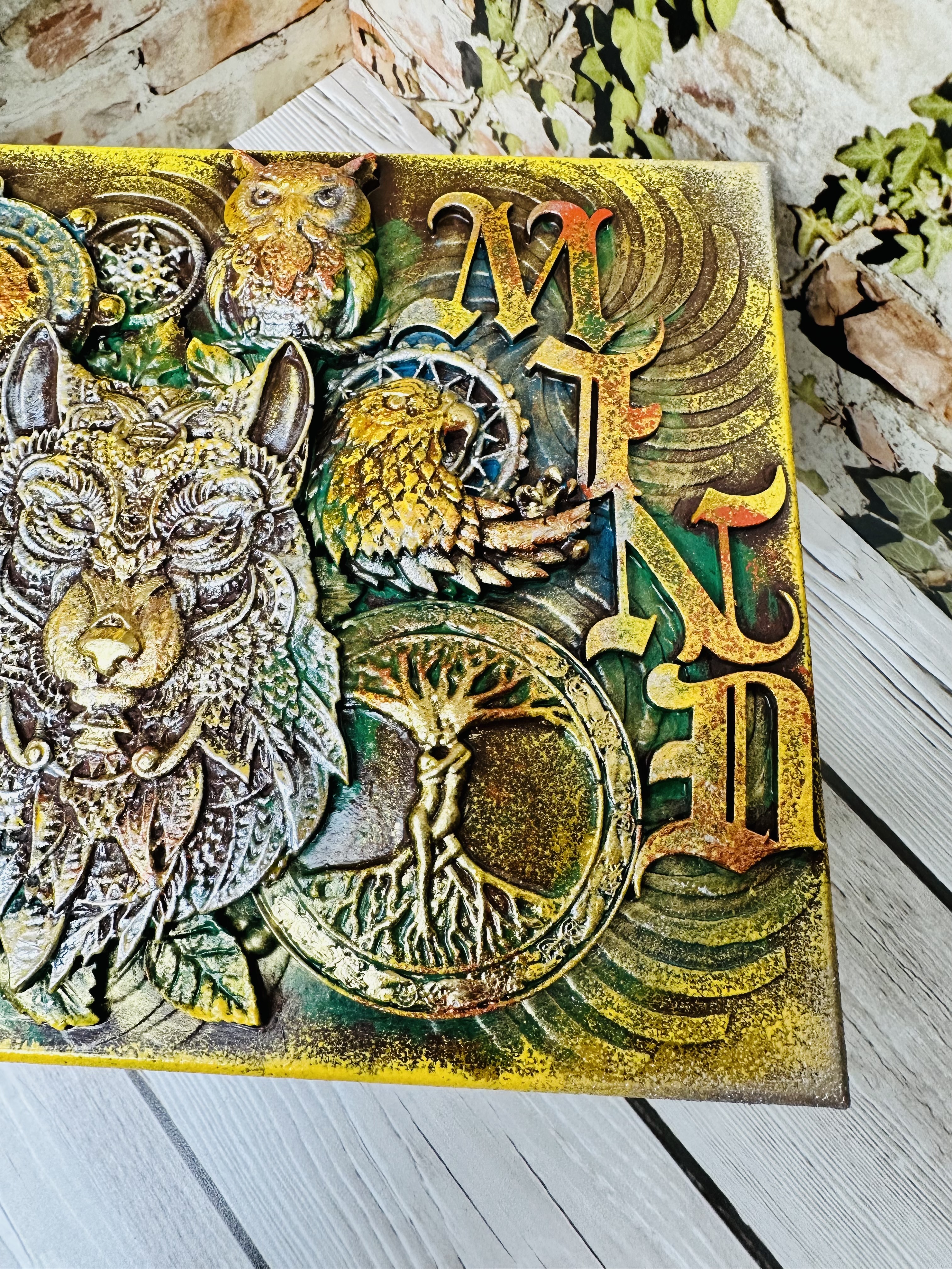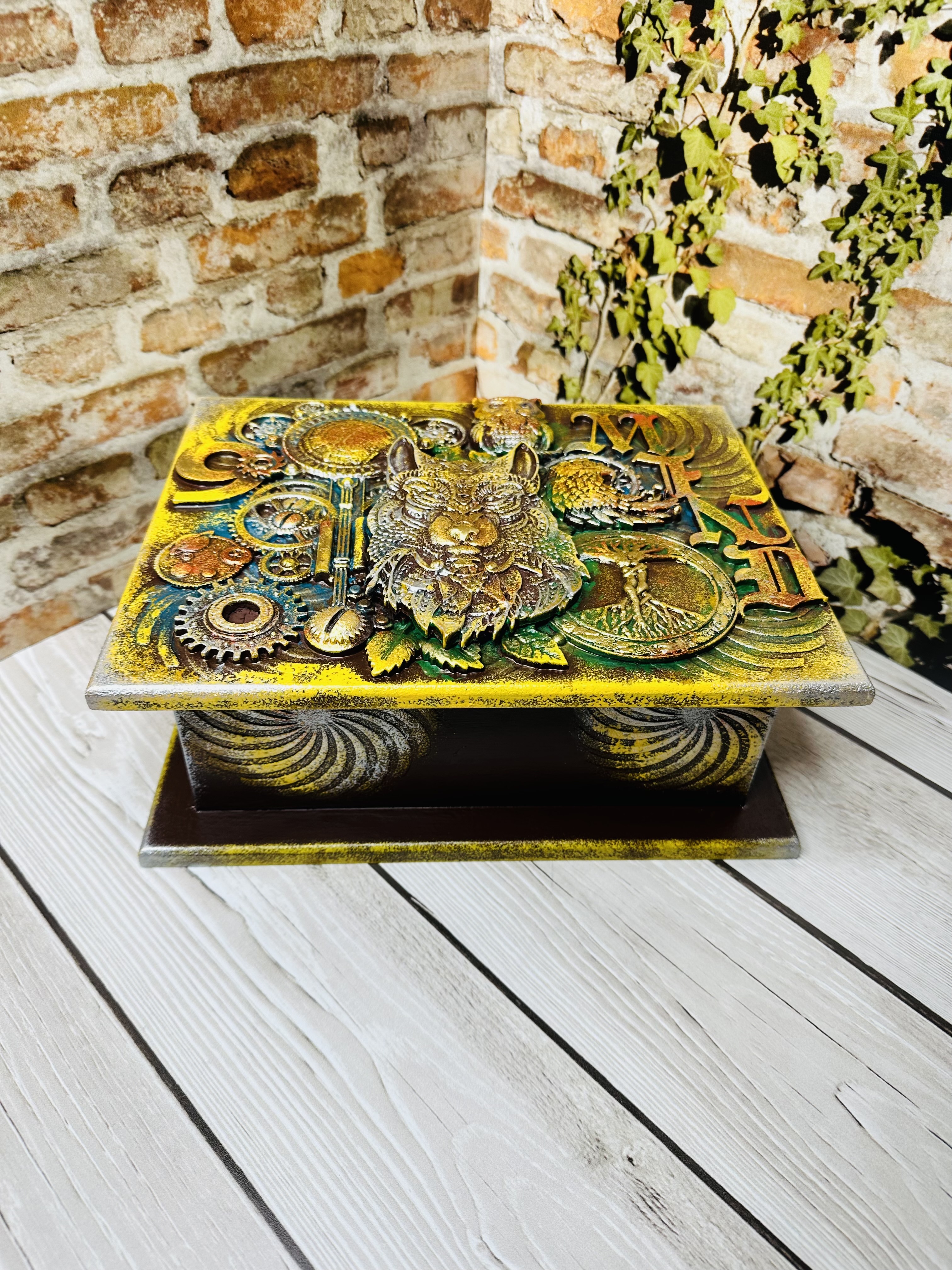Уникальное изделие ручной работы, изготовленное из экологичного МДФ и украшенное декором в технике Mix Media. Эта шкатулка станет прекрасным местом для бережного хранения любимых украшений, драгоценных воспоминаний и небольших ценных вещей. Добавьте волшебства в интерьер своего дома или сделайте незабываемый подарок близкому человеку. Созданное вручную, оно наполнено атмосферой таинственности и красоты.